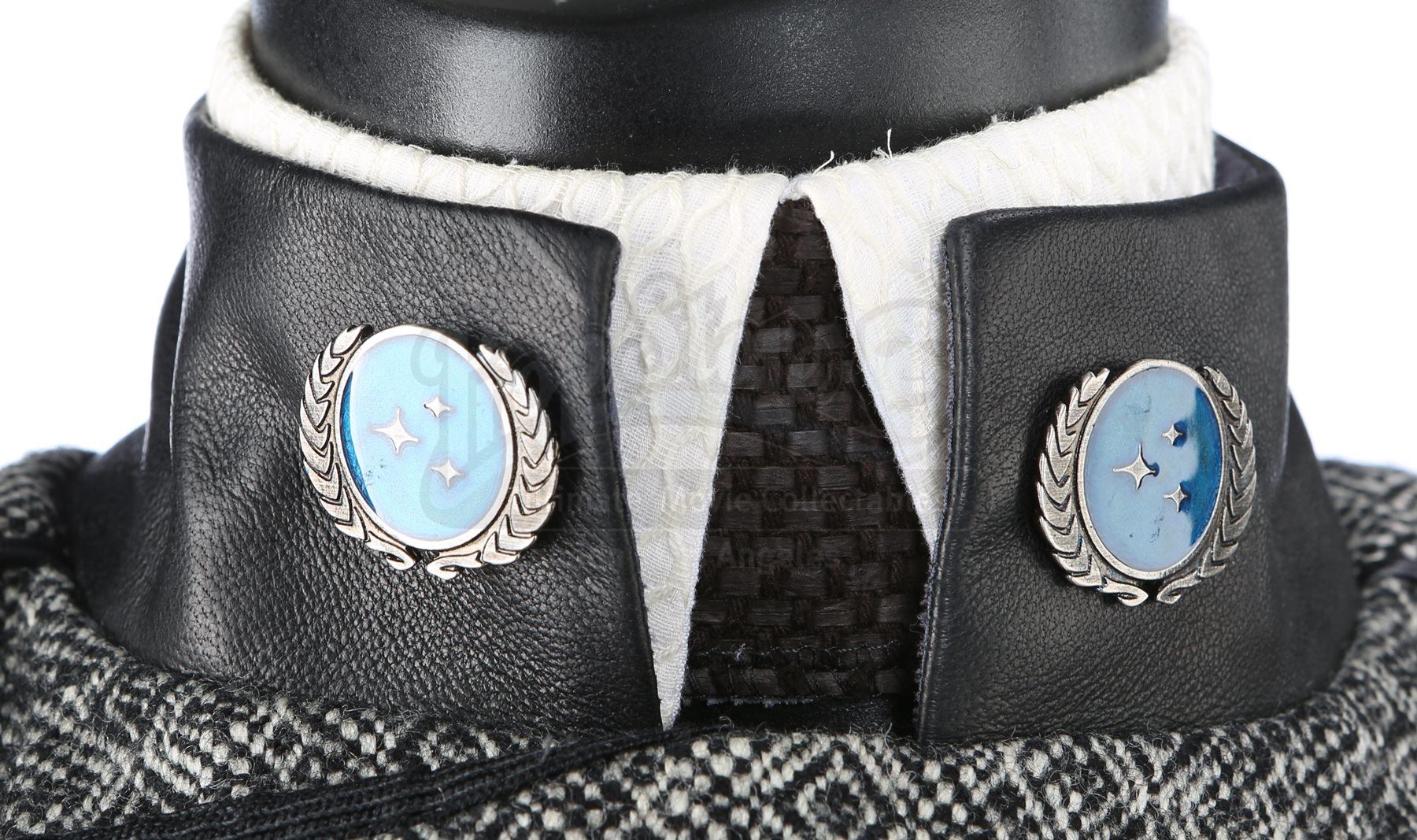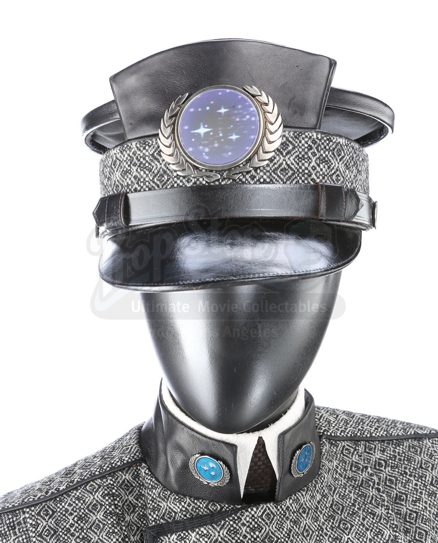 The custom-made uniform is largely made of furniture upholstery fabric with faux leather components. The cap features a unique leather top that is only attached at the front, with the sides completely open. The front of the cap includes a lenticular Federation pin. The double-breasted jacket features a leather collar and cuffs and sturdy piping at the seams. Attached to the collar are two Federation pins. The skirt is made of the same upholstery material and includes a zipper closure; however, the bottom hem has come undone.