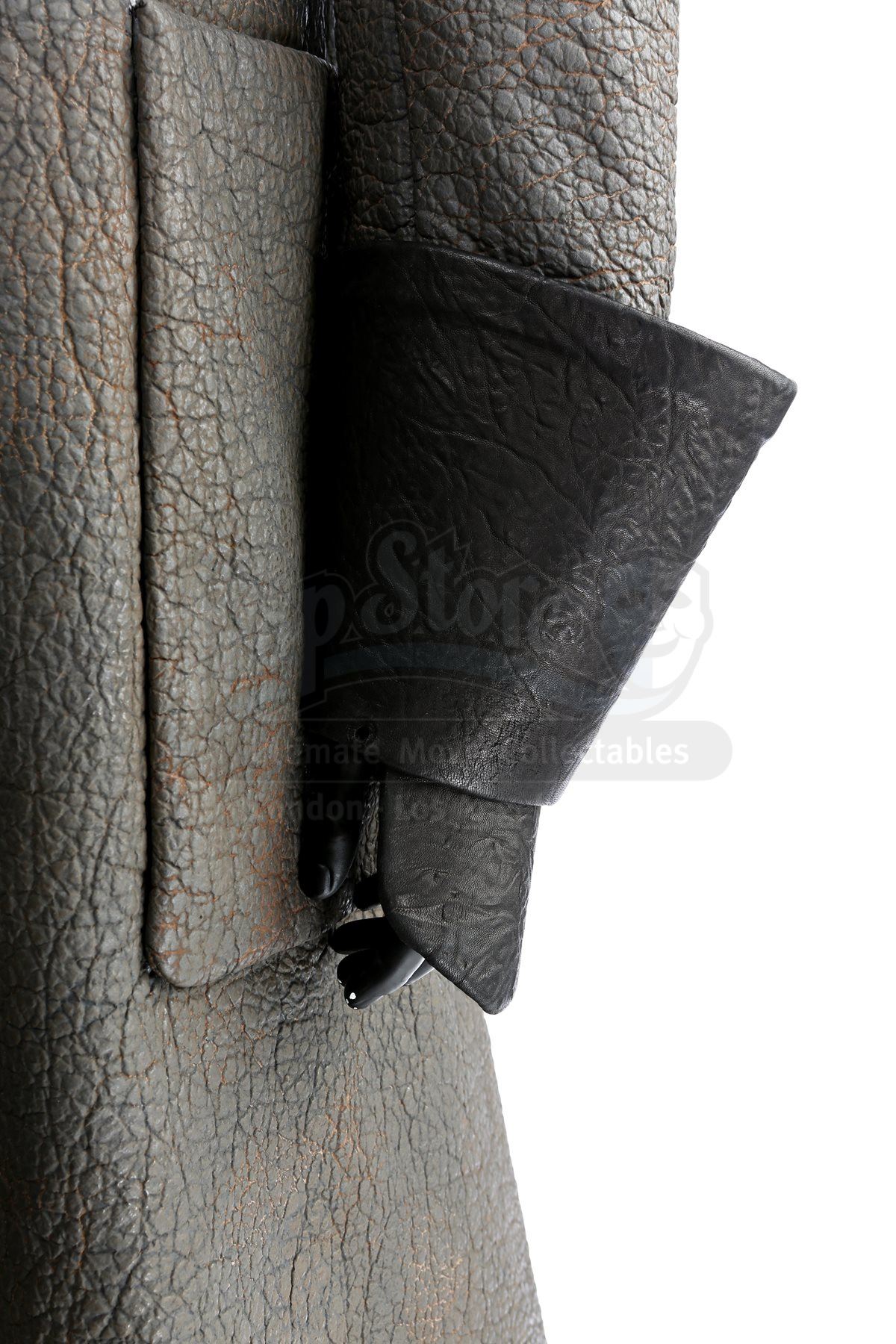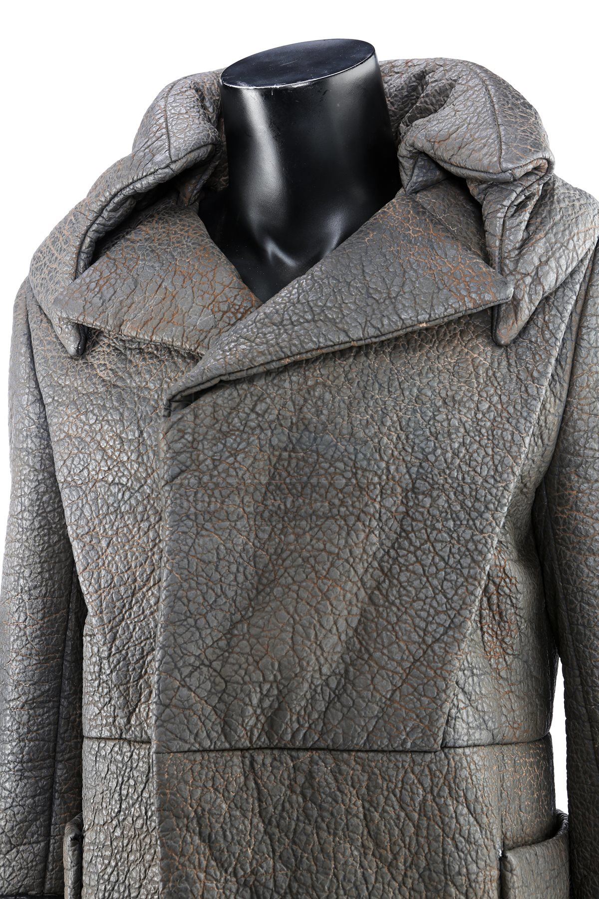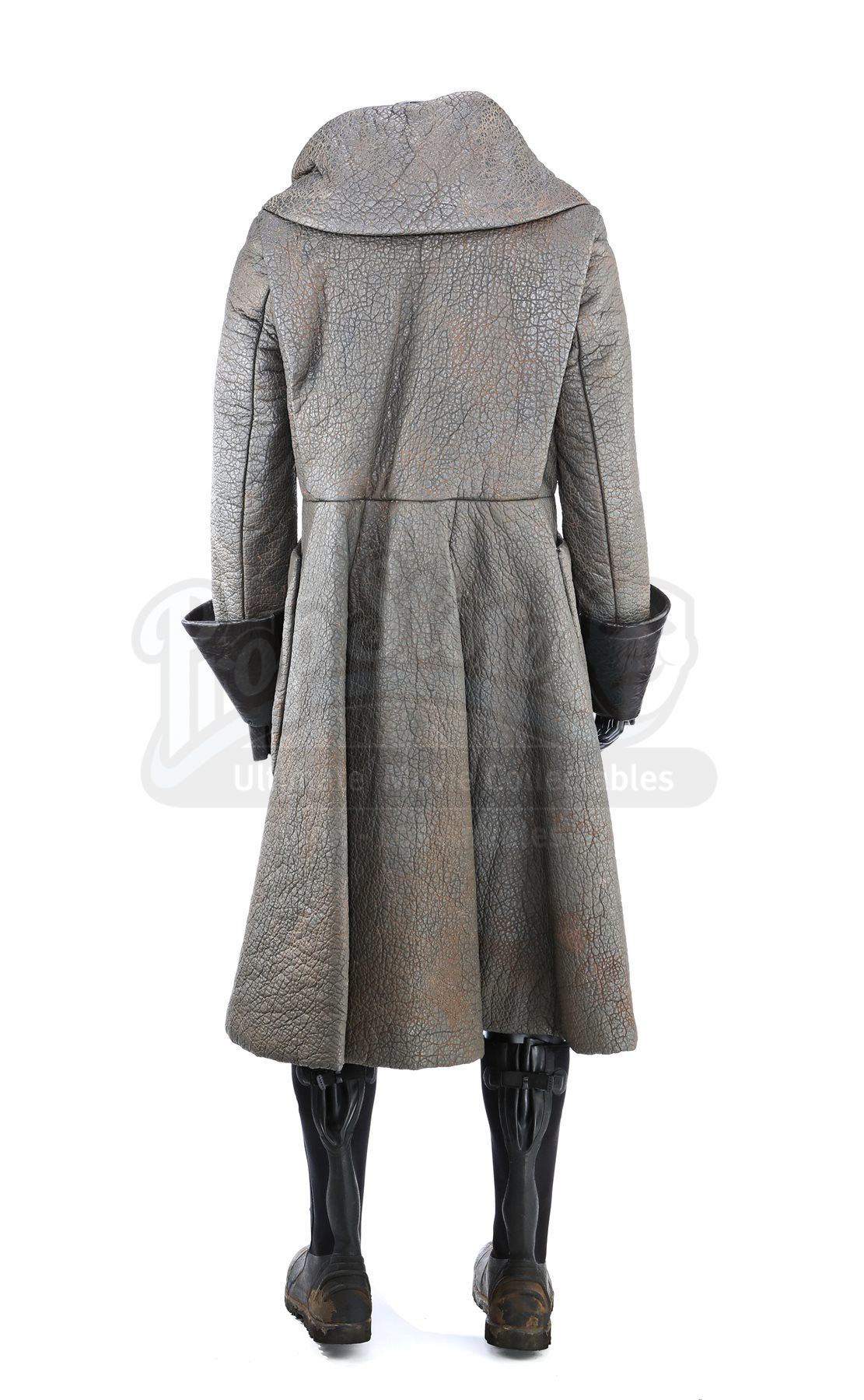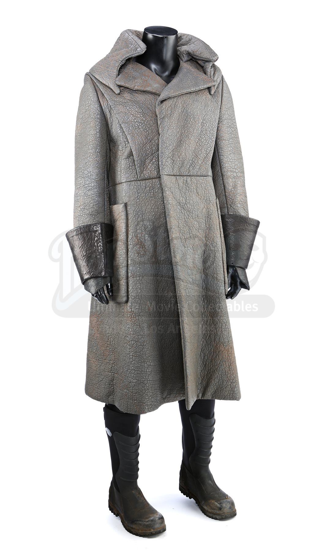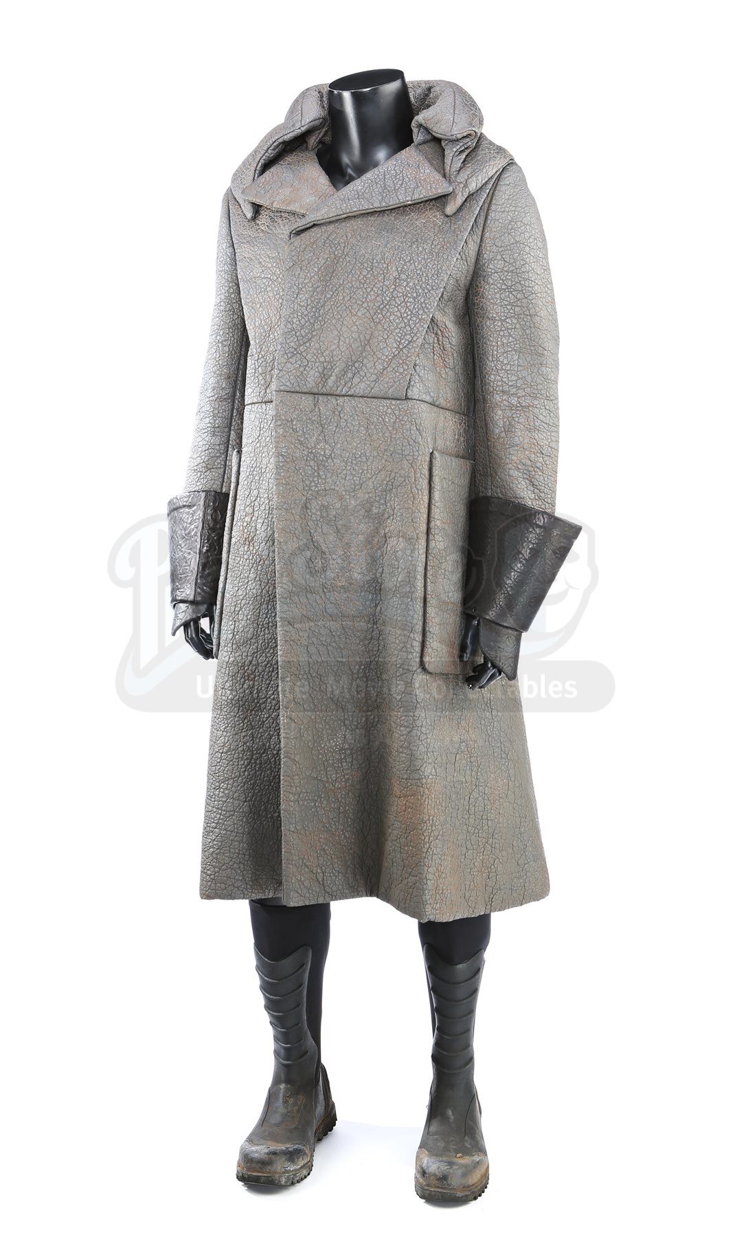A Klingon guard greatcoat and boots from Star Trek and Star Trek Into Darkness. Klingon guards wore their uniforms in a deleted scene in the first film, and were reused in the sequel when the Enterprise crew traveled to Kronos. The costume consists of a greatcoat (approximate size large), leather wrist guards and a pair of boots (marked U.S. size 12).The greatcoat was designed to mimic elephant hide by incorporating faux leather made of china silk and terrycloth that features a scaled design. The leather wrist guards are black. The black boots are made of neoprene with rubber soles, and are distressed with dirt. The costume features hand-written wardrobe labels in the jacket and wrist guards marked with the actor's name. Estimate: $1000 - 1500*Estimated sale price; sold without reserve.