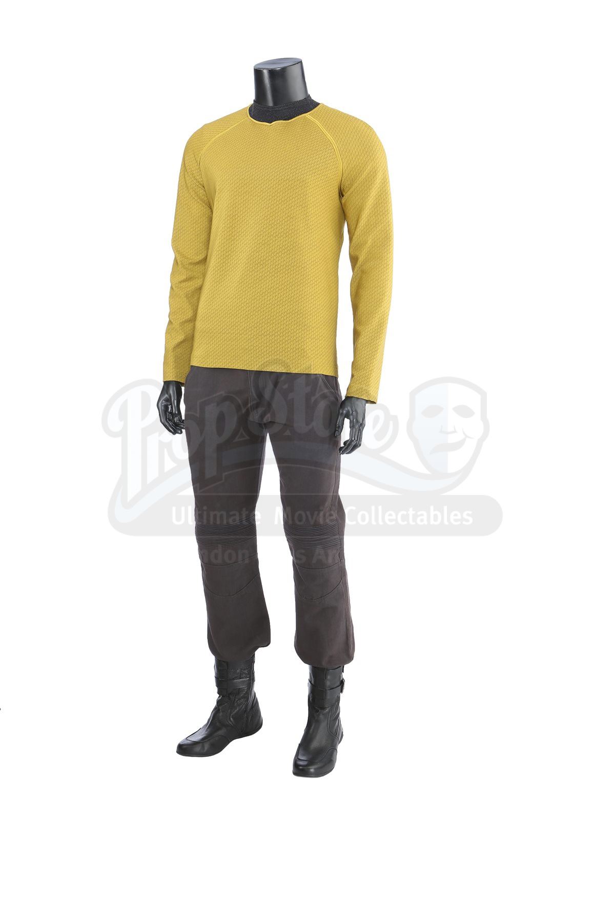Made for the first film and reused in the sequel, the gold long-sleeved tunic is made of Spandex, has piping around the collar and features a printed optical repeat Starfleet insignia pattern. The undershirt consists of a grey polyester collar that is stitched to the top of a modified Spandex sport shirt. The dark grey twill pants have ribbed fabric above the knees. Also included is a pair of black leather boots with rubber soles.