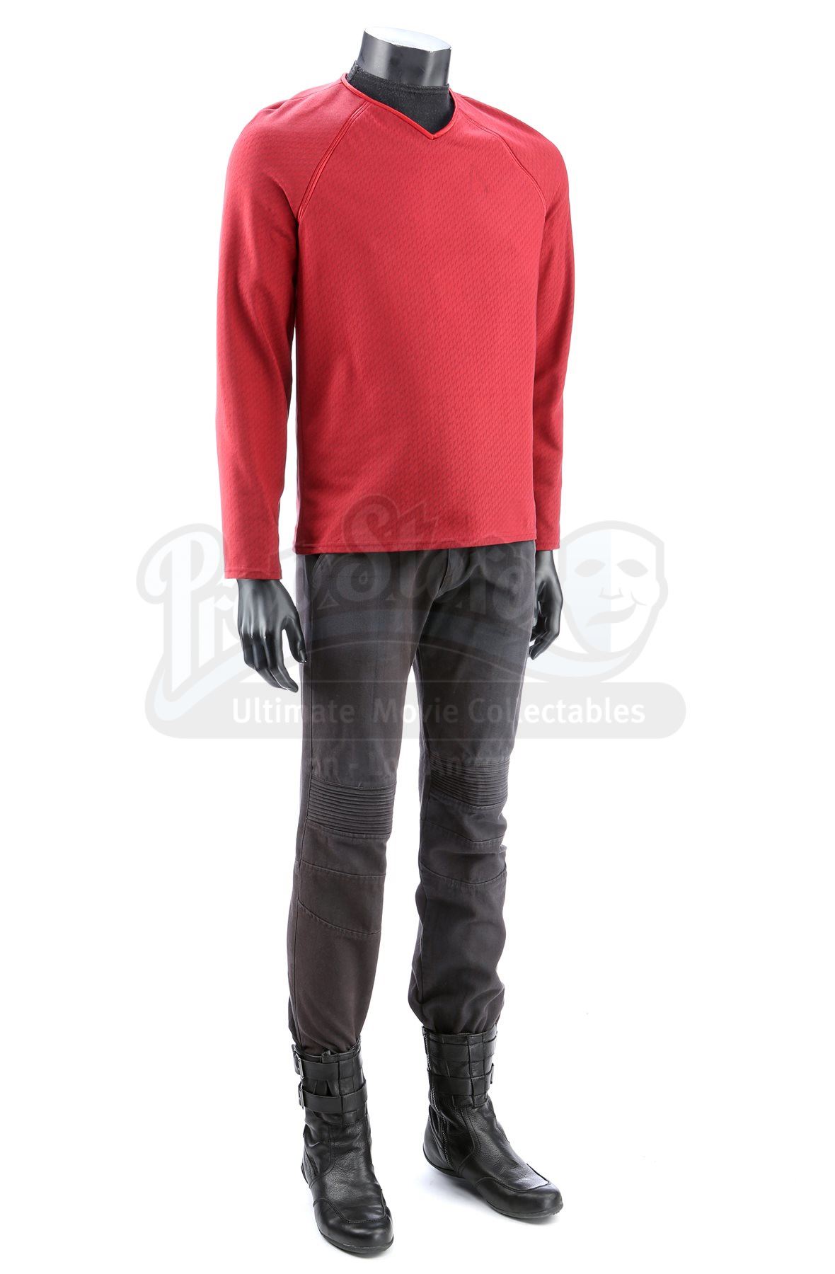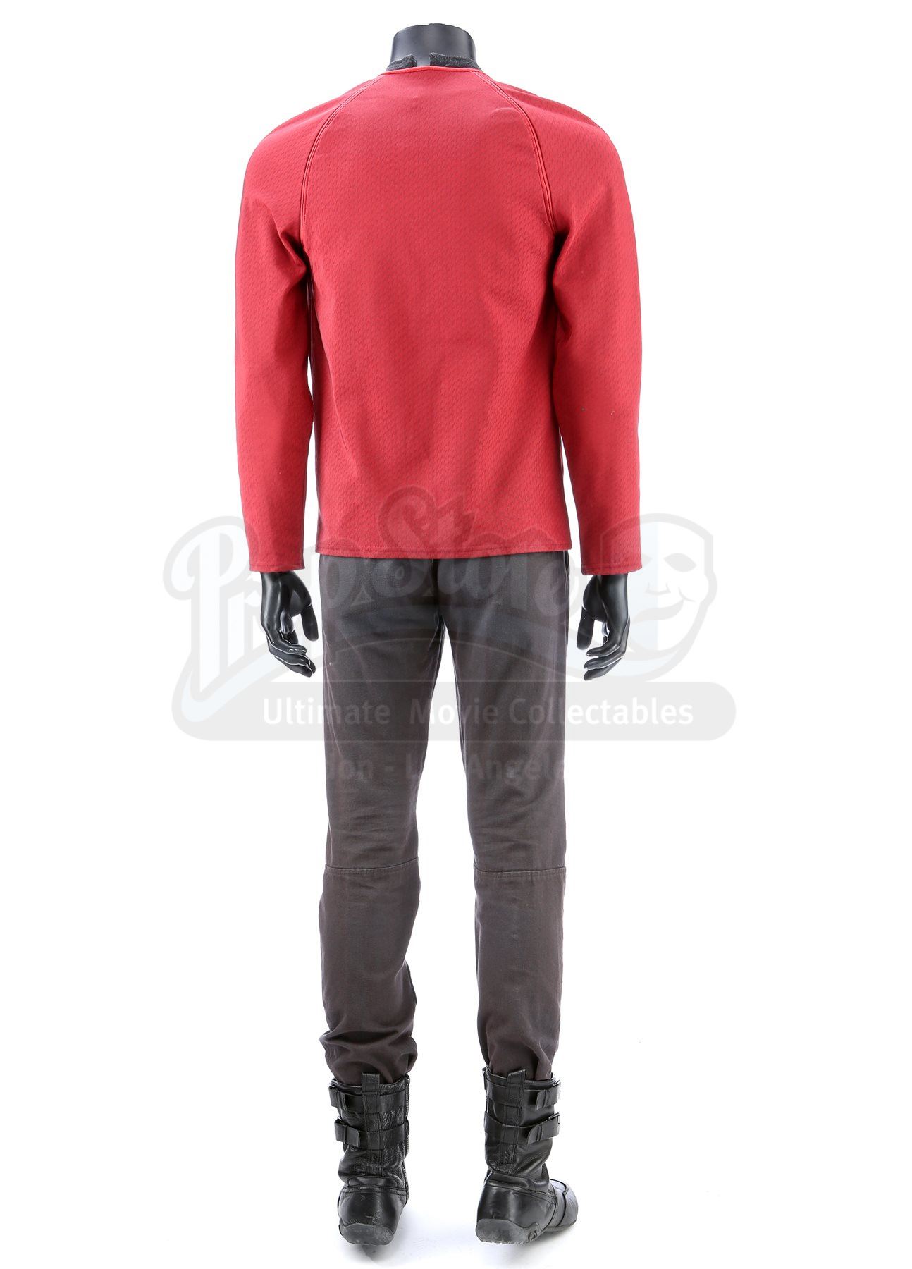 A men's Enterprise operations uniform from Star Trek and reused in Star Trek Into Darkness. Enterprise staff in the operations division wore their uniforms while aboard the Enterprise throughout the first two films. The costume includes a tunic (approximate size large), semi-mock turtleneck undershirt (medium), pants (approximate size 30), and a pair of boots (marked U.S. size 10). Made for the first film and reused in the sequel, the red long-sleeved tunic is made of Spandex, has piping around the collar and features a printed optical repeat Starfleet insignia pattern. The undershirt consists of a grey polyester collar that is stitched to the top of a modified Spandex sport shirt. The grey twill pants have ribbed fabric above the knees. Also included is a pair of black leather boots with rubber soles. The costume features hand-written wardrobe labels in the boots marked with the actor's name. Also included are wardrobe tags with hand-written notes about the costume.Estimate: $1000 - 1500*Estimated sale price; sold without reserve.