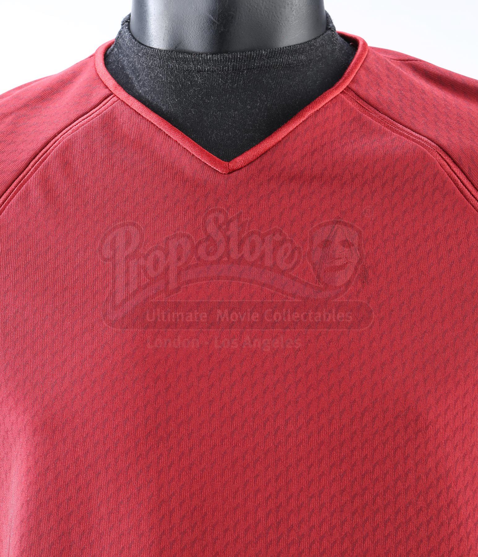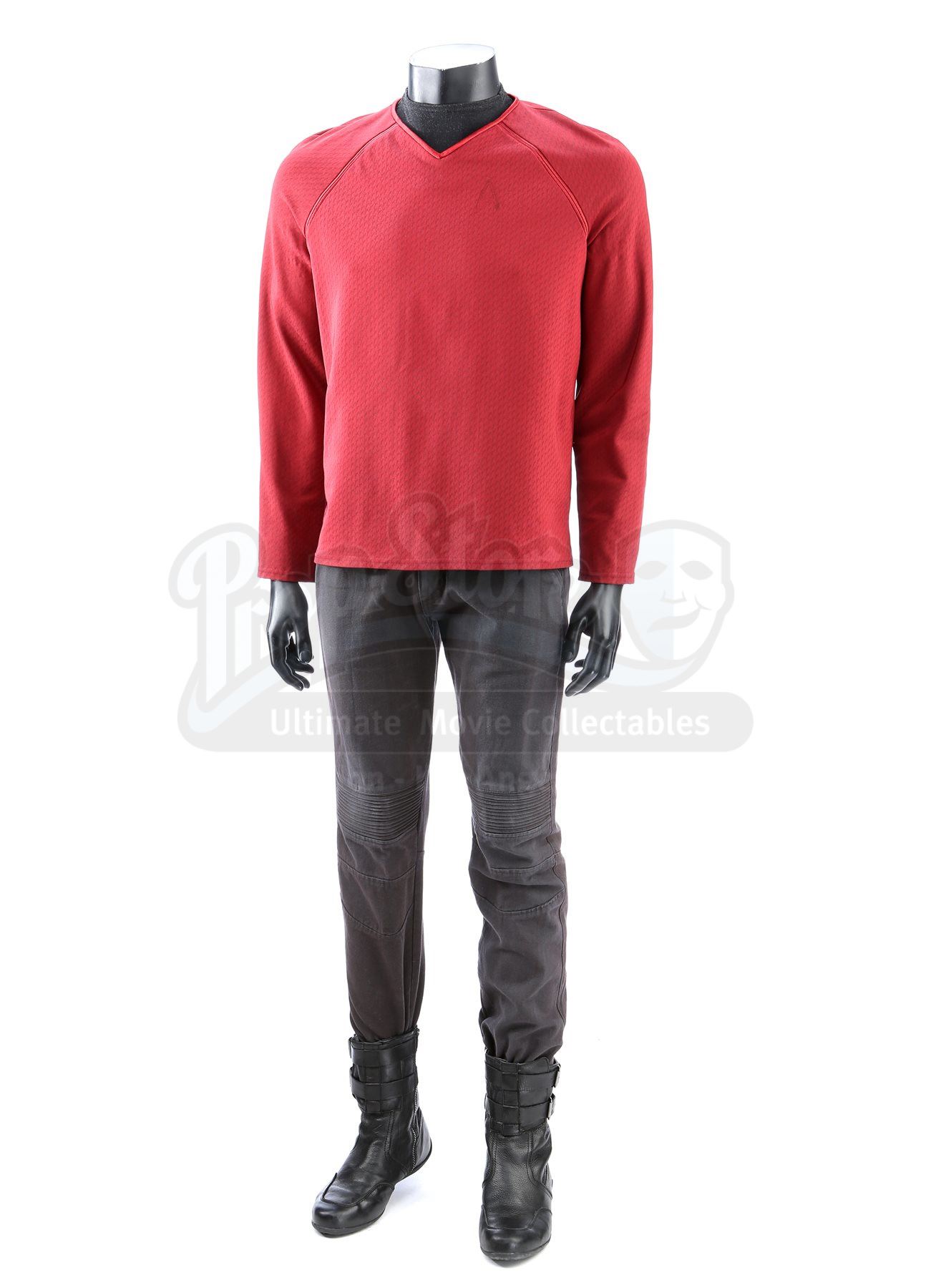 Made for the first film and reused in the sequel, the red long-sleeved tunic is made of Spandex, has piping around the collar and features a printed optical repeat Starfleet insignia pattern. The undershirt consists of a grey polyester collar that is stitched to the top of a modified Spandex sport shirt. The grey twill pants have ribbed fabric above the knees. Also included is a pair of black leather boots with rubber soles.