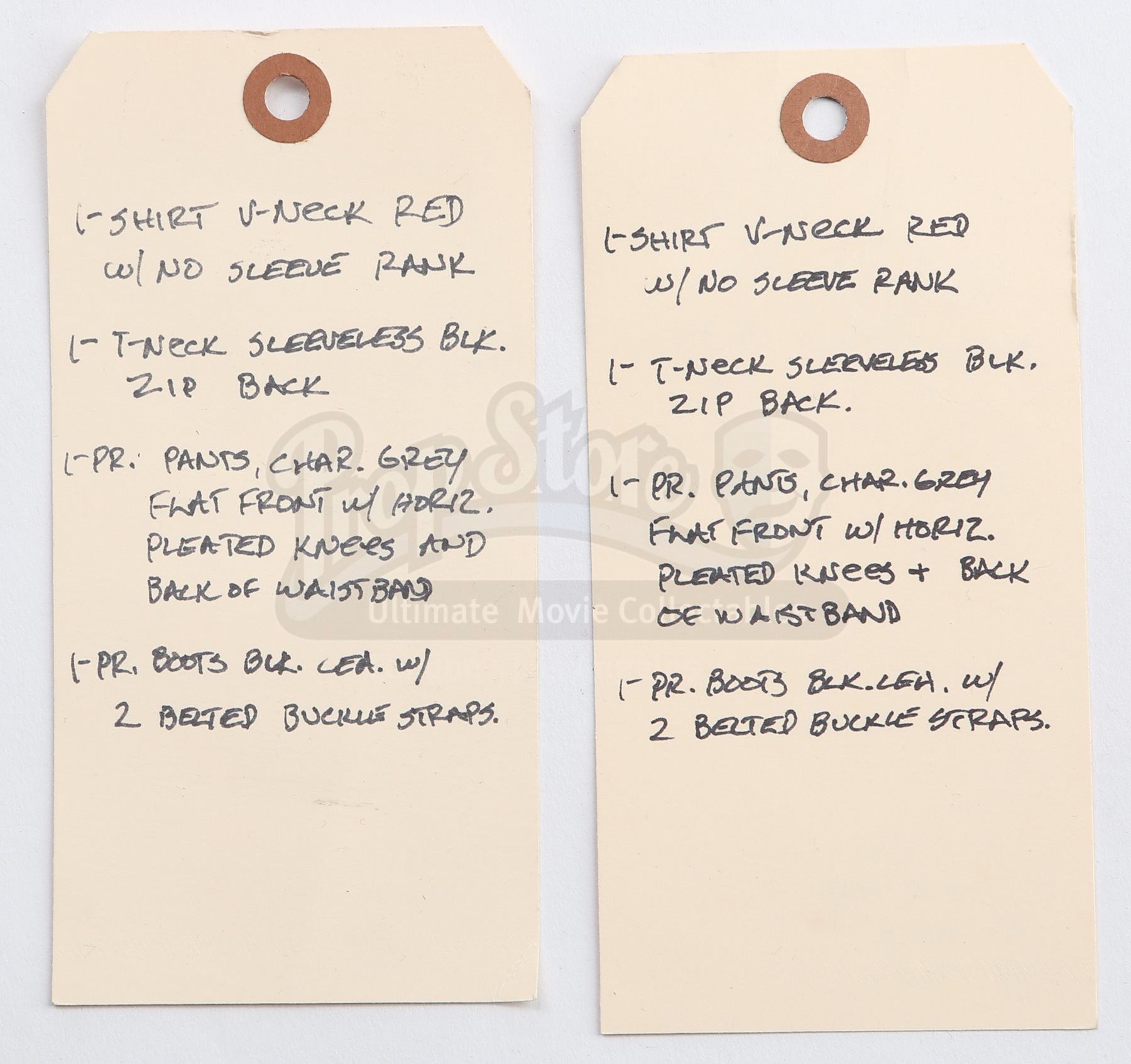 The costume features hand-written wardrobe labels in the boots marked with the actor's name. Also included are wardrobe tags with hand-written notes about the costume.