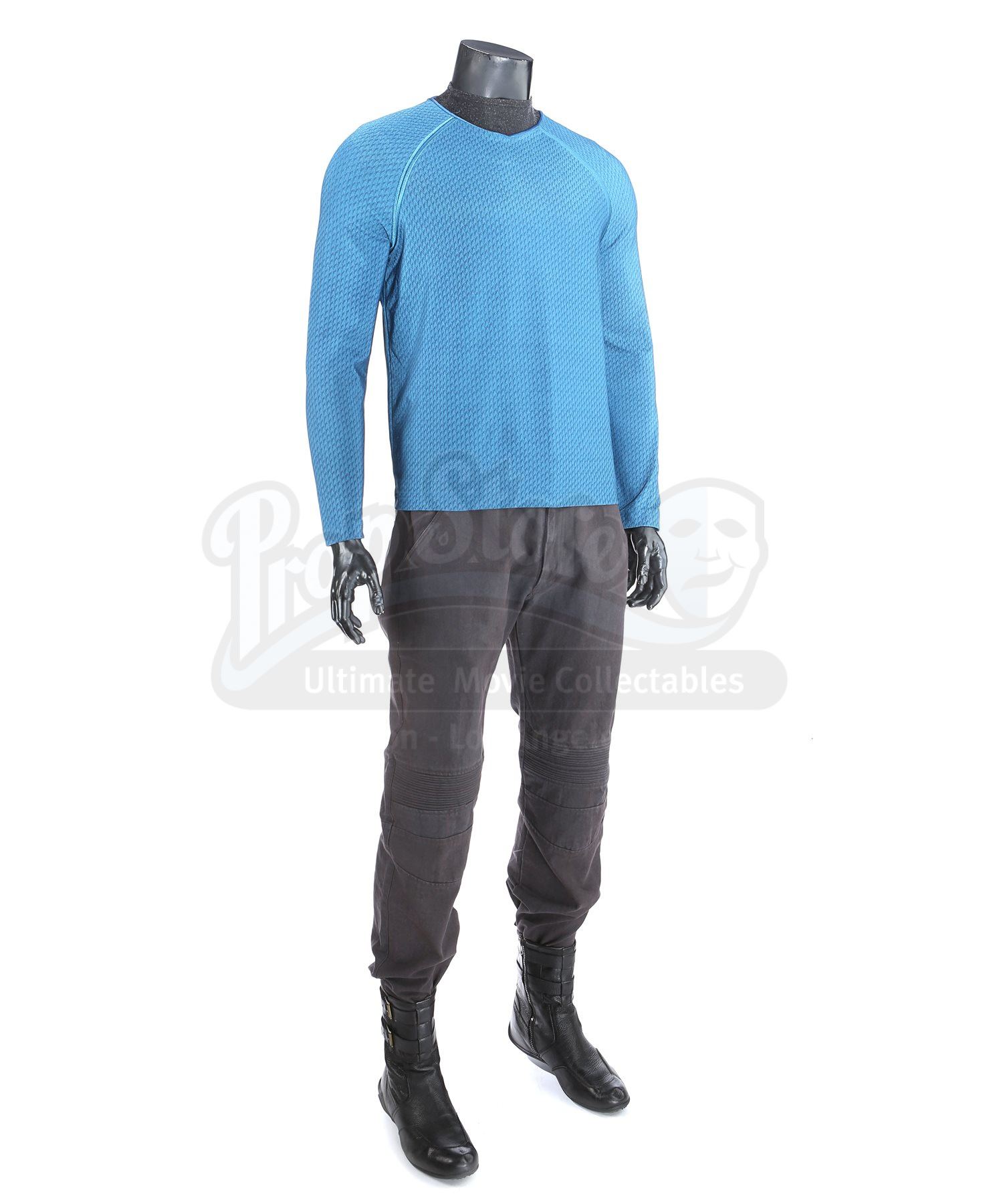 Made for the first film and reused in the sequel, the blue long-sleeved tunic is made of Spandex, has piping around the collar and features a printed optical repeat Starfleet insignia pattern. The undershirt consists of a grey polyester collar that is stitched to the top of a modified Spandex sport shirt. The dark grey twill pants have ribbed fabric above the knees. Also included is a pair of black leather boots with rubber soles.