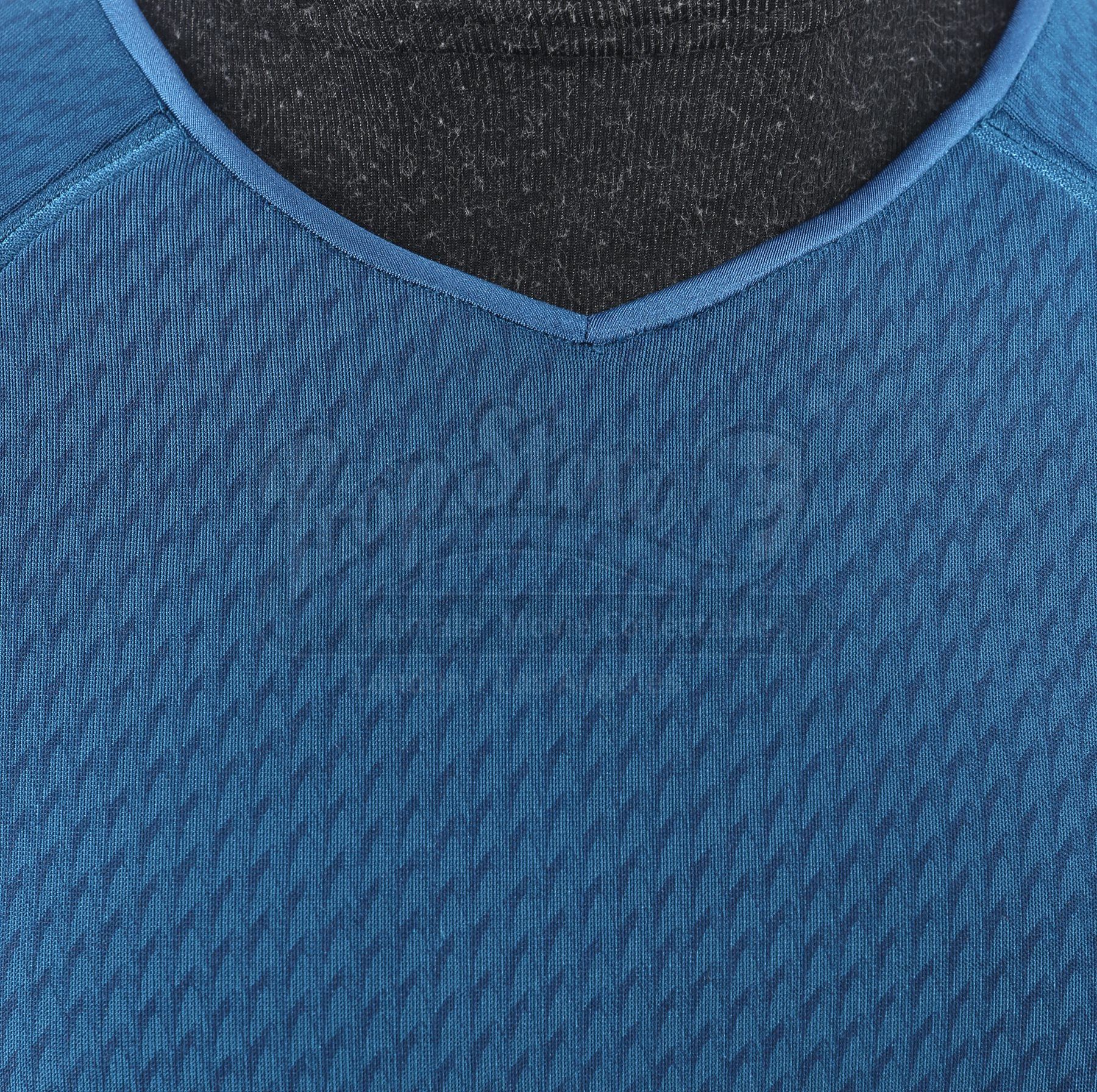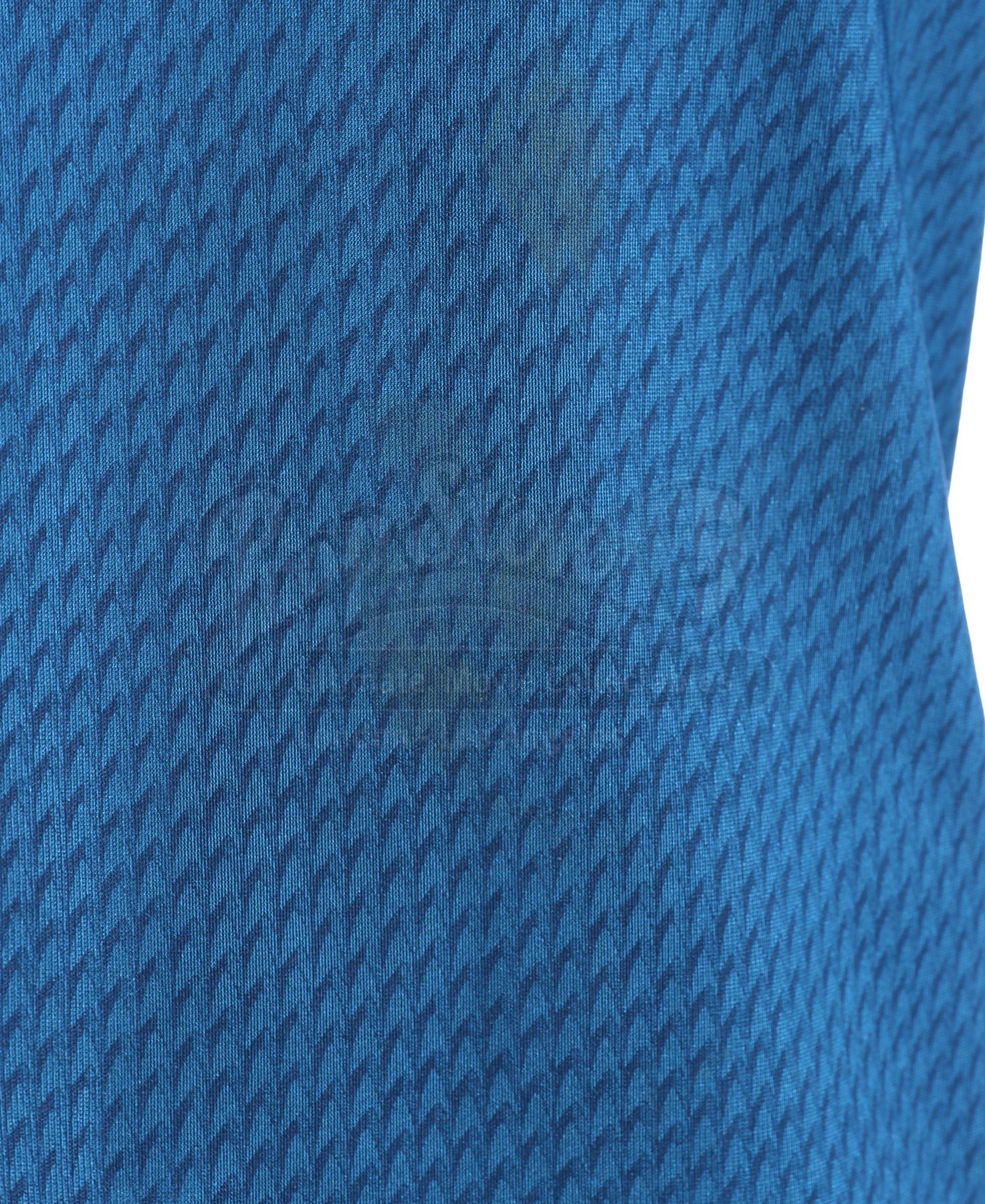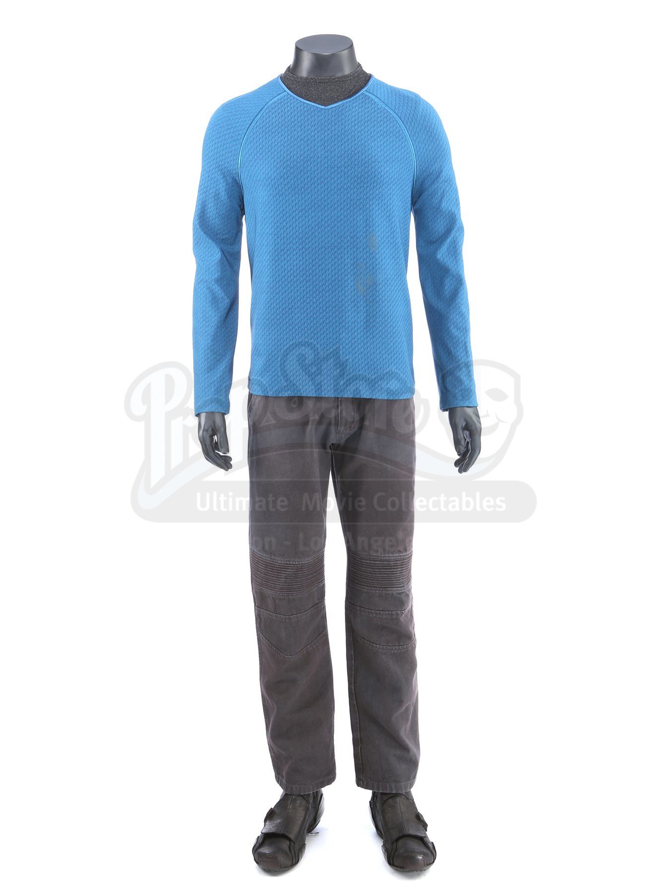 Made for the first film and reused in the sequel, the blue long-sleeved tunic is made of Spandex and features a printed optical repeat Starfleet insignia pattern and piping around the collar. The undershirt consists of a grey polyester collar that is stitched to the top of a modified Spandex sport shirt. The dark grey twill pants have ribbed fabric above the knees. Also included is a pair of black leather ankle boots with rubber soles.