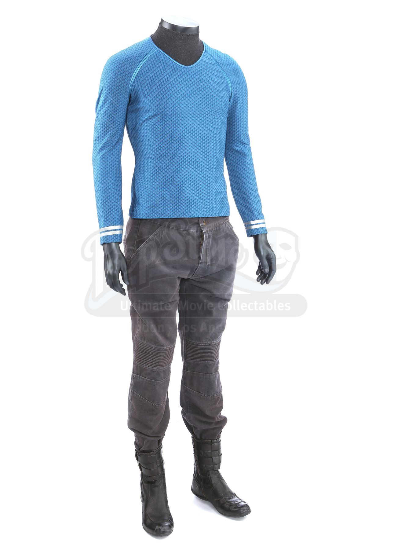 A men's Enterprise sciences uniform from Star Trek and reused in Star Trek Into Darkness. Enterprise staff in the sciences divisions wore their uniforms while aboard the Enterprise throughout the first two films. The costume includes a tunic (approximate size medium), semi-mock turtleneck undershirt (small), pants (marked size 34), and a pair of boots (marked U.S. size 8.5).