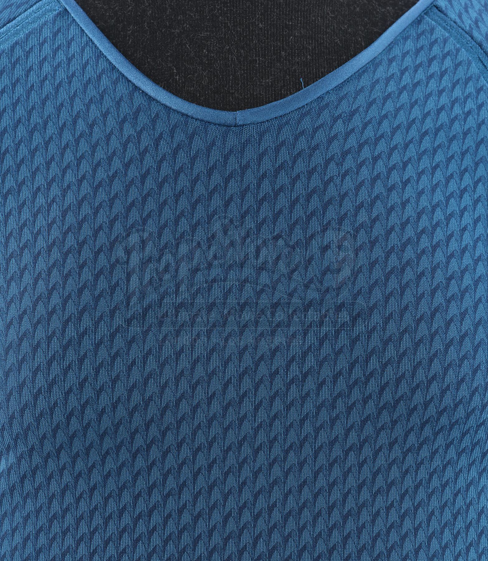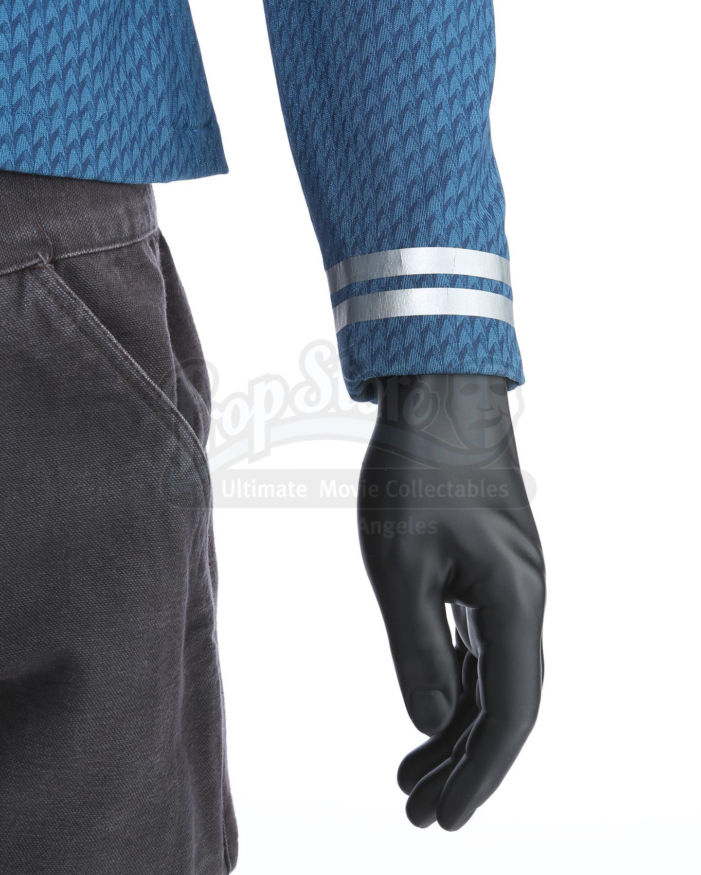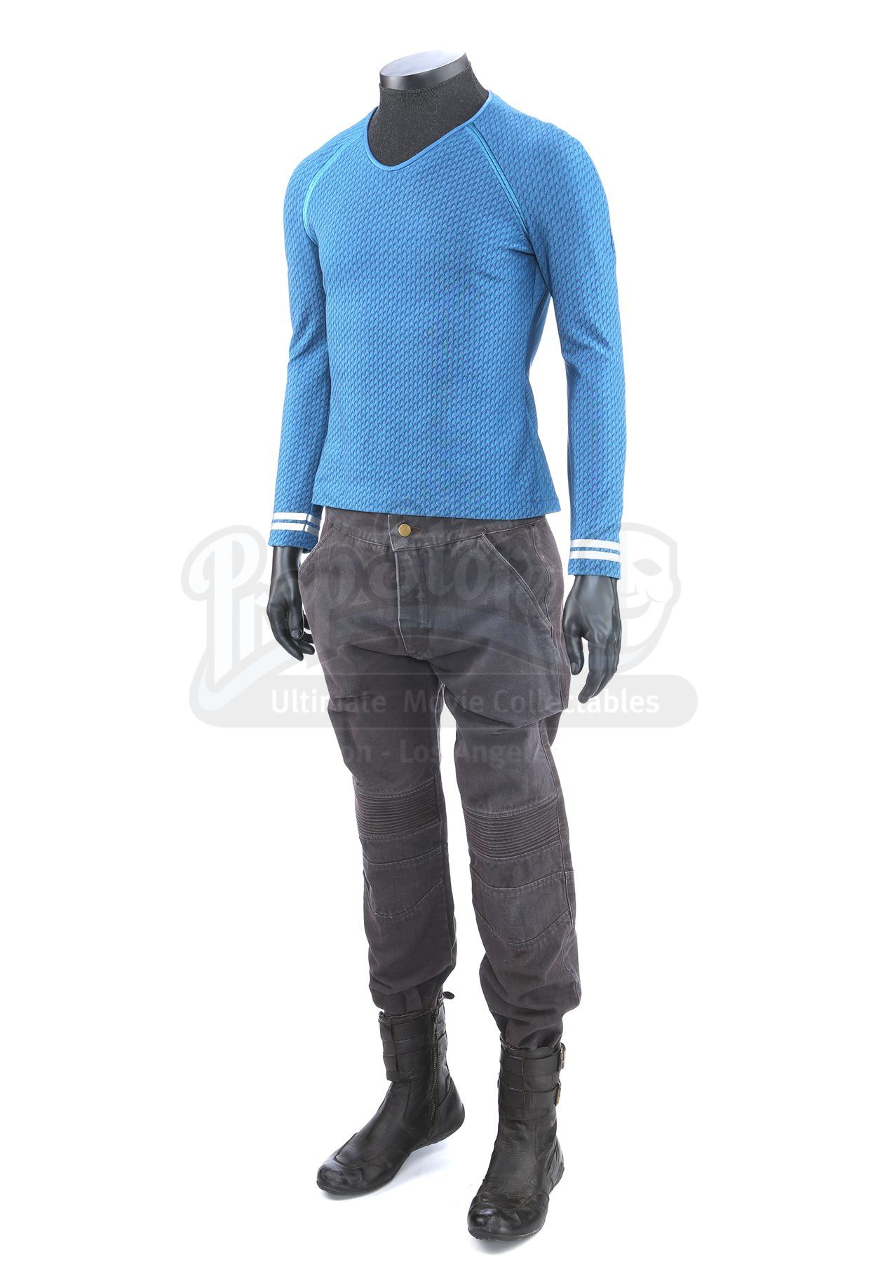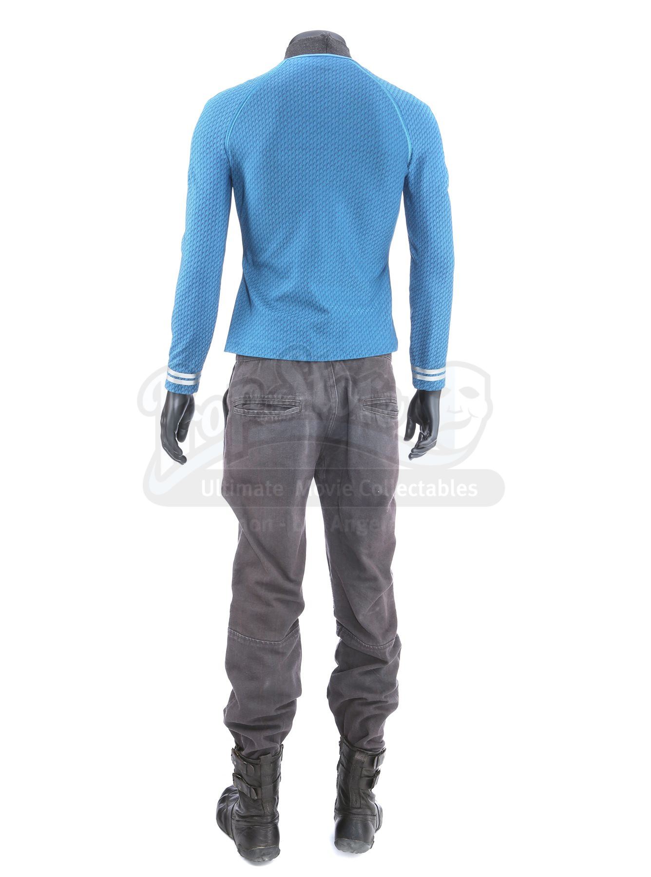 Made for the first film and reused in the sequel, the blue tunic is made of Spandex features a printed optical repeat Starfleet insignia pattern. The long-sleeved shirt has piping around the collar and has two silver bands on the wrists. The undershirt consists of a grey polyester collar that is stitched to the top of a modified Spandex sport shirt. The dark grey twill pants have ribbed fabric above the knees. Also included is a pair of black leather boots with rubber soles.