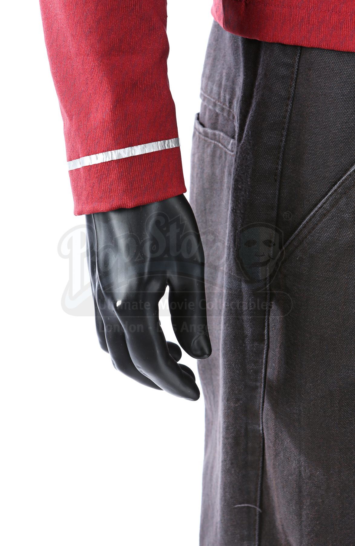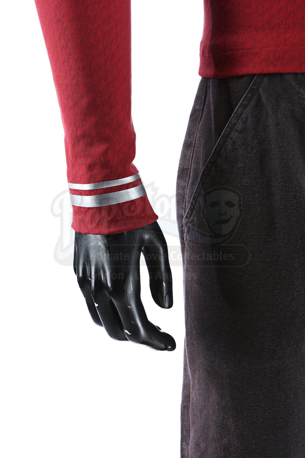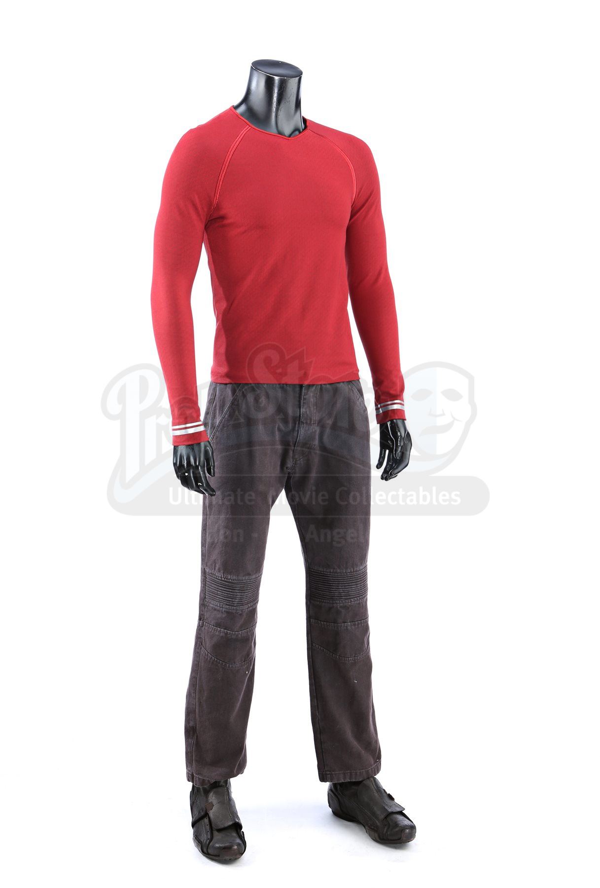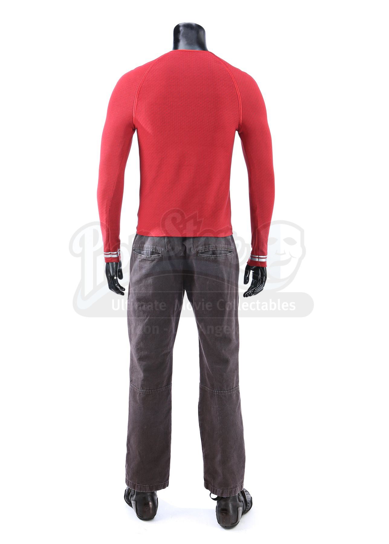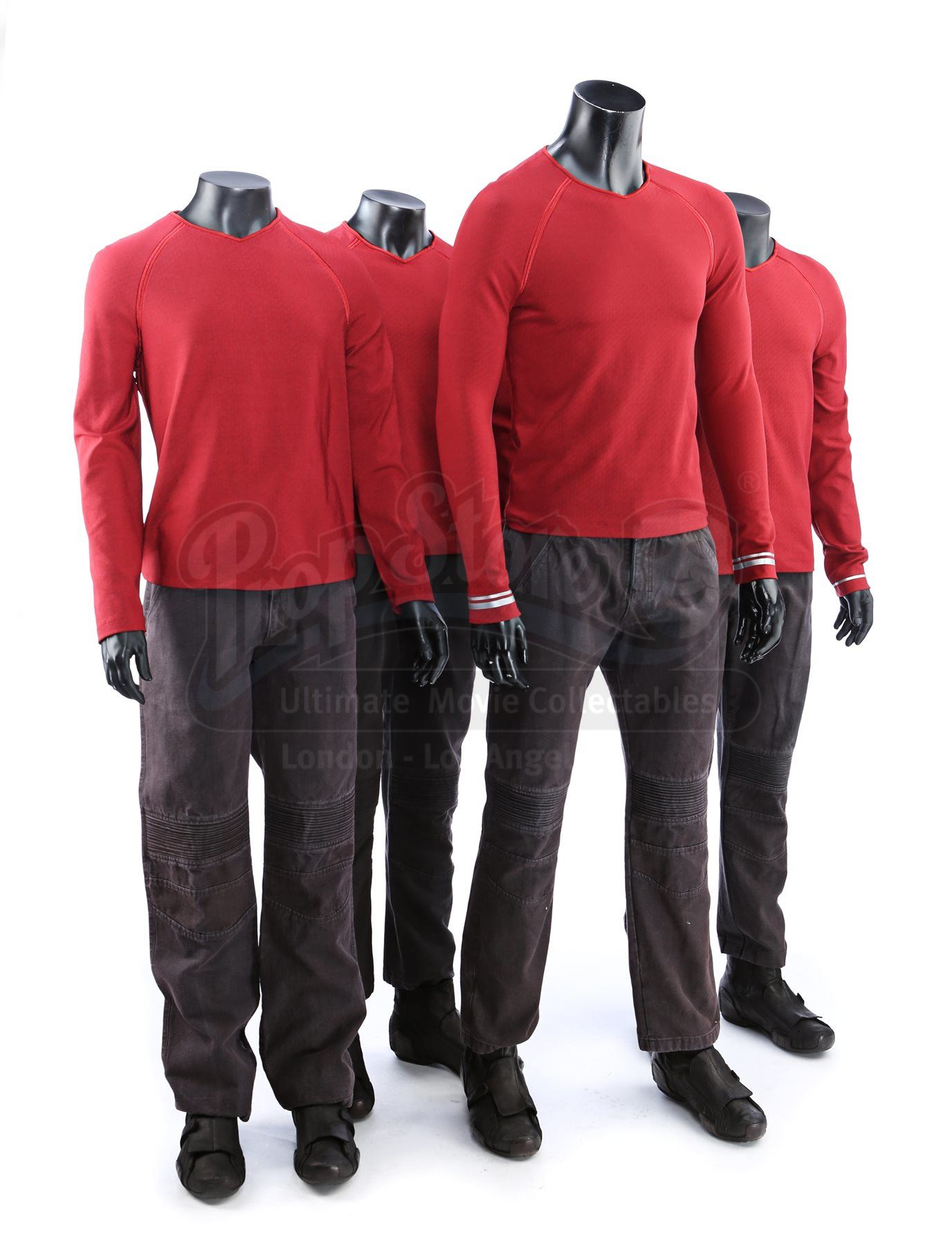 A set of four men's operations uniforms from Star Trek and reused in Star Trek Into Darkness. Enterprise staff in the operations division wore their uniforms while aboard the Enterprise throughout the first two films. The set includes four tunics (all approximate size medium), four pairs of pants (one pair marked 34, one approximate size 32, one approximate size 34 and one approximate size 36) and four pairs of boots (two pairs marked U.S. size 11, one pair marked U.S. size 11.5 and another marked U.S. size 12). Made for the first film and reused in the sequel, the red tunics are made of Spandex, have piping around the collar and feature a printed optical repeat Starfleet insignia pattern. Two of the tunics have one silver band on the wrists and one tunic has two silver bands on the wrists. The dark grey twill pants have ribbed fabric above the knees. Also included are four pairs of black leather boots with rubber soles.One pair of pants features hand-written wardrobe label marked with the actor's name.Estimate: $3000 - 5000*Estimated sale price; sold without reserve.