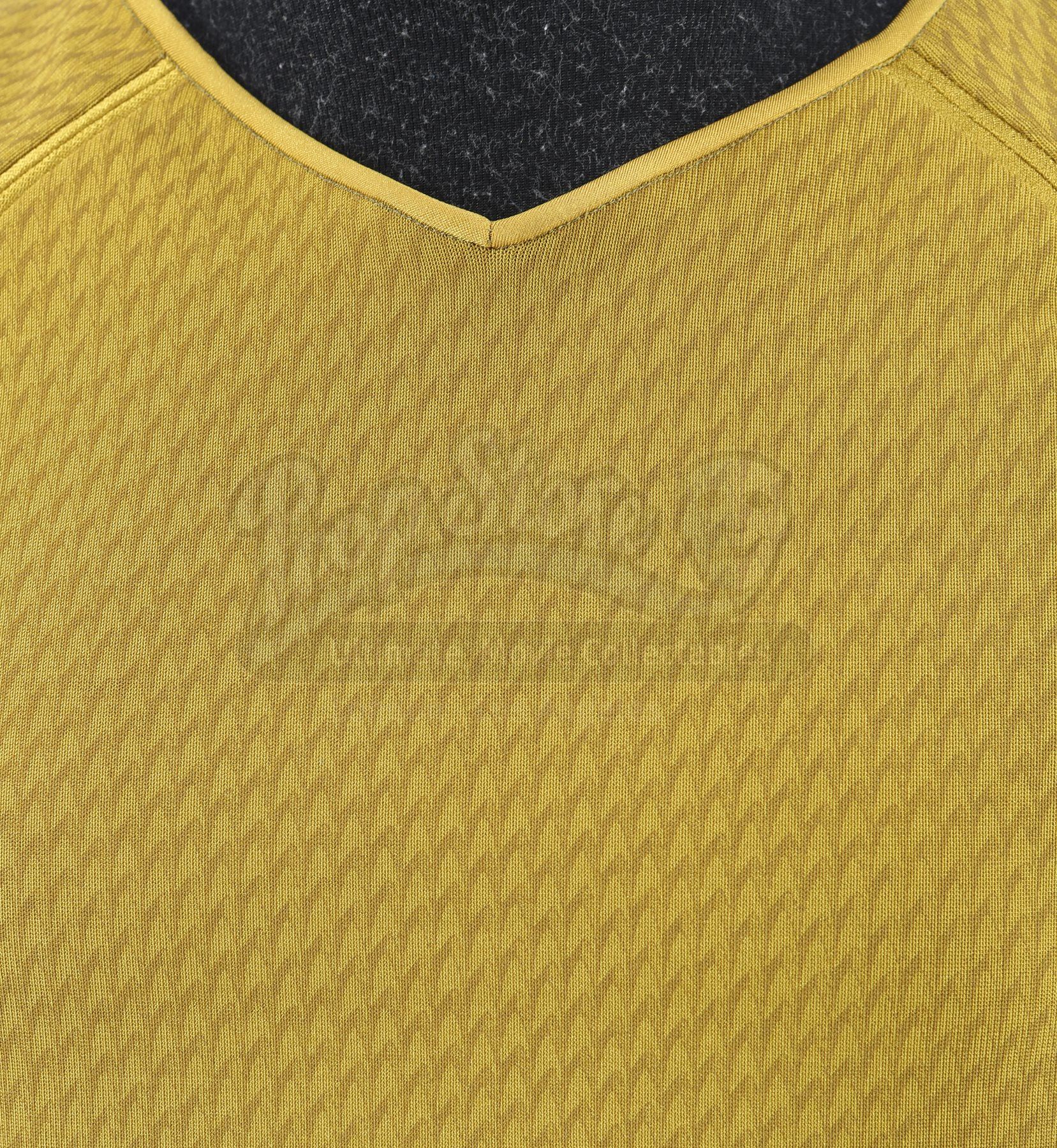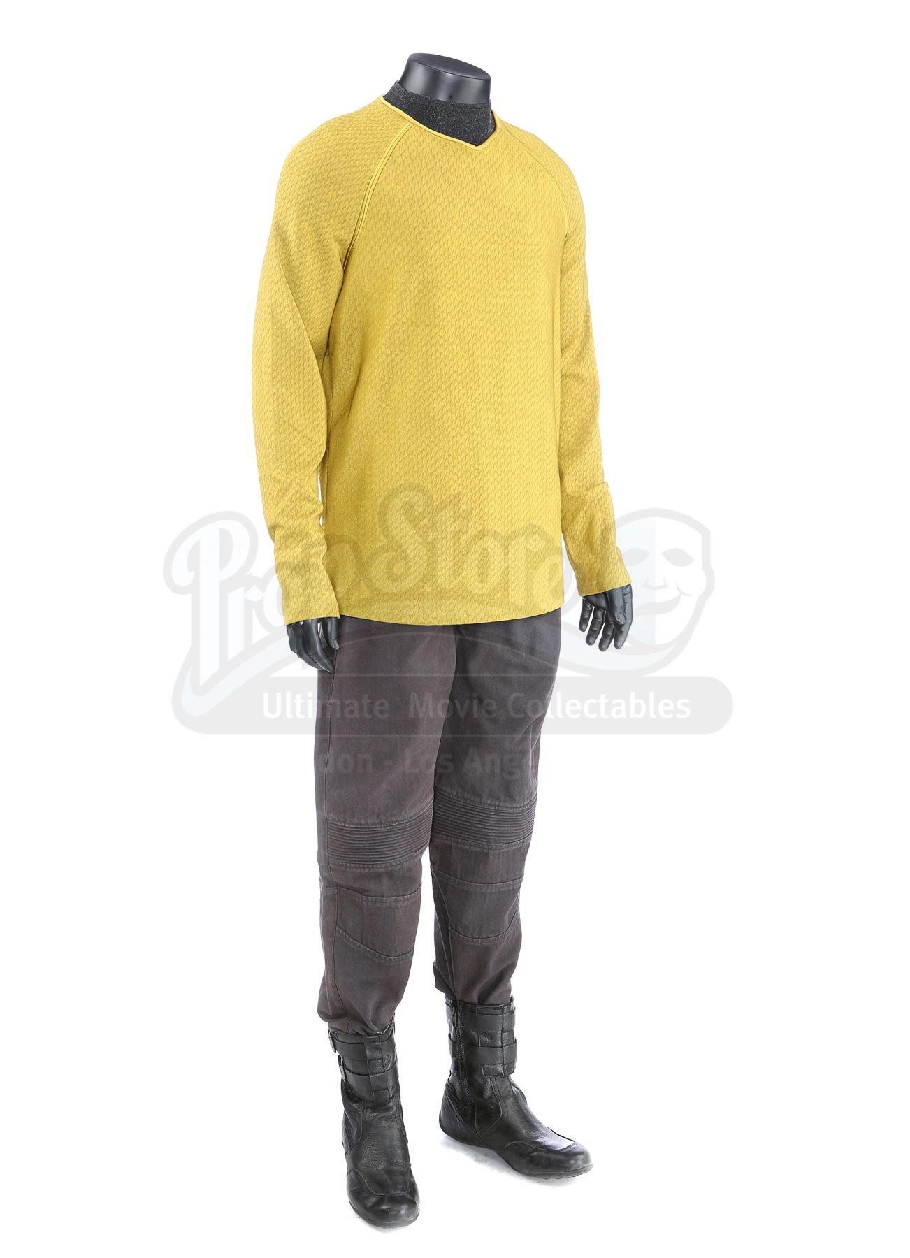 A set of three men's Enterprise uniforms from Star Trek and reused in Star Trek Into Darkness. Enterprise staff wore their uniforms while aboard the Enterprise throughout the first two films. The set includes three tunics (all approximate size medium), three semi-mock turtleneck undershirts (one medium, two large), three pairs of pants (one marked size 34, the remaining sets approximate size 34), and three pairs of boots (marked U.S. sizes 9, 9.5, and 10). Made for the first film and reused in the sequel, the lot includes operations, sciences, and command officer long-sleeved tunics made of Spandex, each of which have piping around the collar and feature a printed optical repeat Starfleet insignia pattern. The three undershirts consist of grey polyester collars that are stitched to the top of modified Spandex sport shirts. The dark grey twill pants have ribbed fabric above the knees. Also included are three pairs of black leather boots with rubber soles. Estimate: $2500 - 3500*Estimated sale price; sold without reserve.