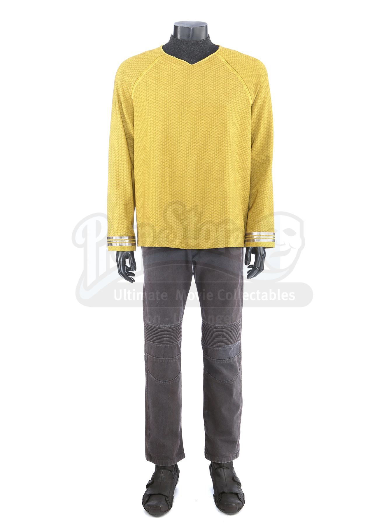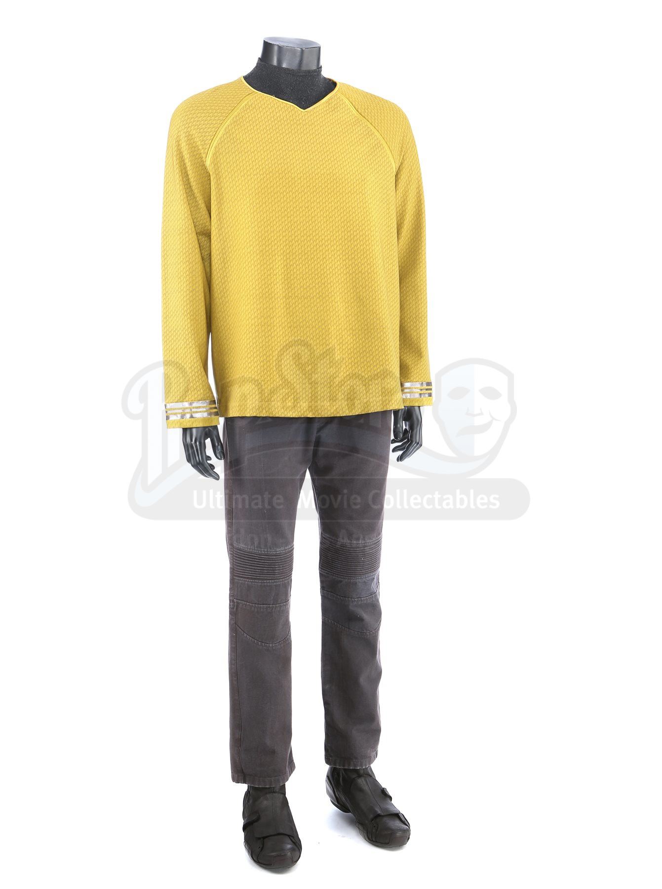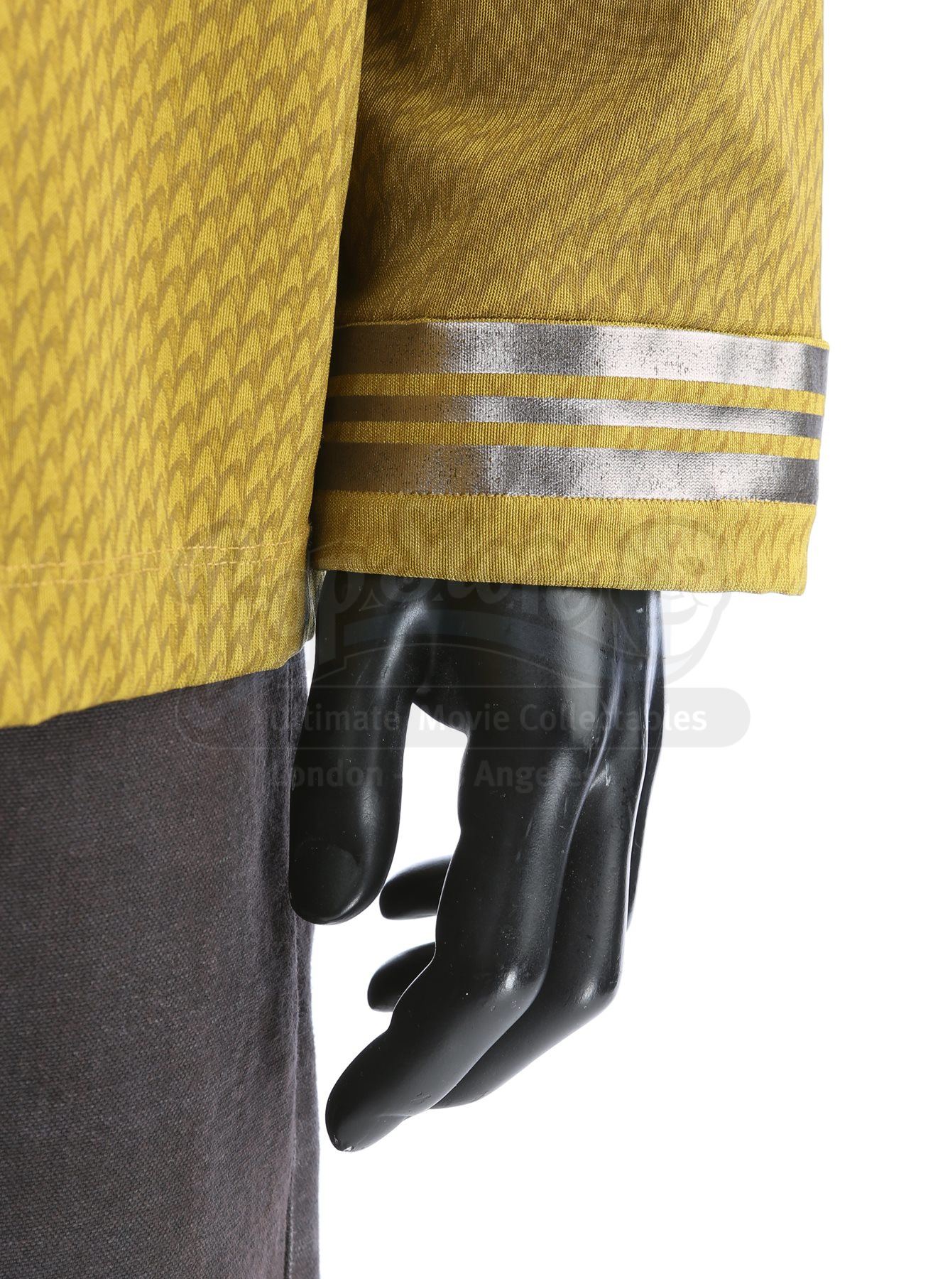 A Starfleet captain's Enterprise command uniform from Star Trek and likely reused in Star Trek Into Darkness. Captain's tunics were worn by Christopher Pike and Kirk in the first film, and only by Kirk in the sequel. It is unknown which of the two captains this tunic is attributed to. This tunic is believed to have been worn by either Kirk or Pike, as no other Starfleet Captains are seen wearing this style of uniform. The costume consists of a tunic (approximate size large), semi-mock turtleneck undershirt (extra large), pants (marked size 34), and a pair of boots (marked U.S. size 12). Made for the first film and believed to be reused by Kirk in the sequel, the gold long-sleeved tunic is made of Spandex and features a printed optical repeat Starfleet insignia pattern, piping around the collar and three silver bands on the wrists. The undershirt consists of a grey polyester collar that is stitched to the top of a modified Spandex sport shirt. The dark grey twill pants have ribbed fabric above the knees. Also included is a pair of black leather ankle boots with rubber soles. Estimate: $2000 - 3000*Estimated sale price; sold without reserve.