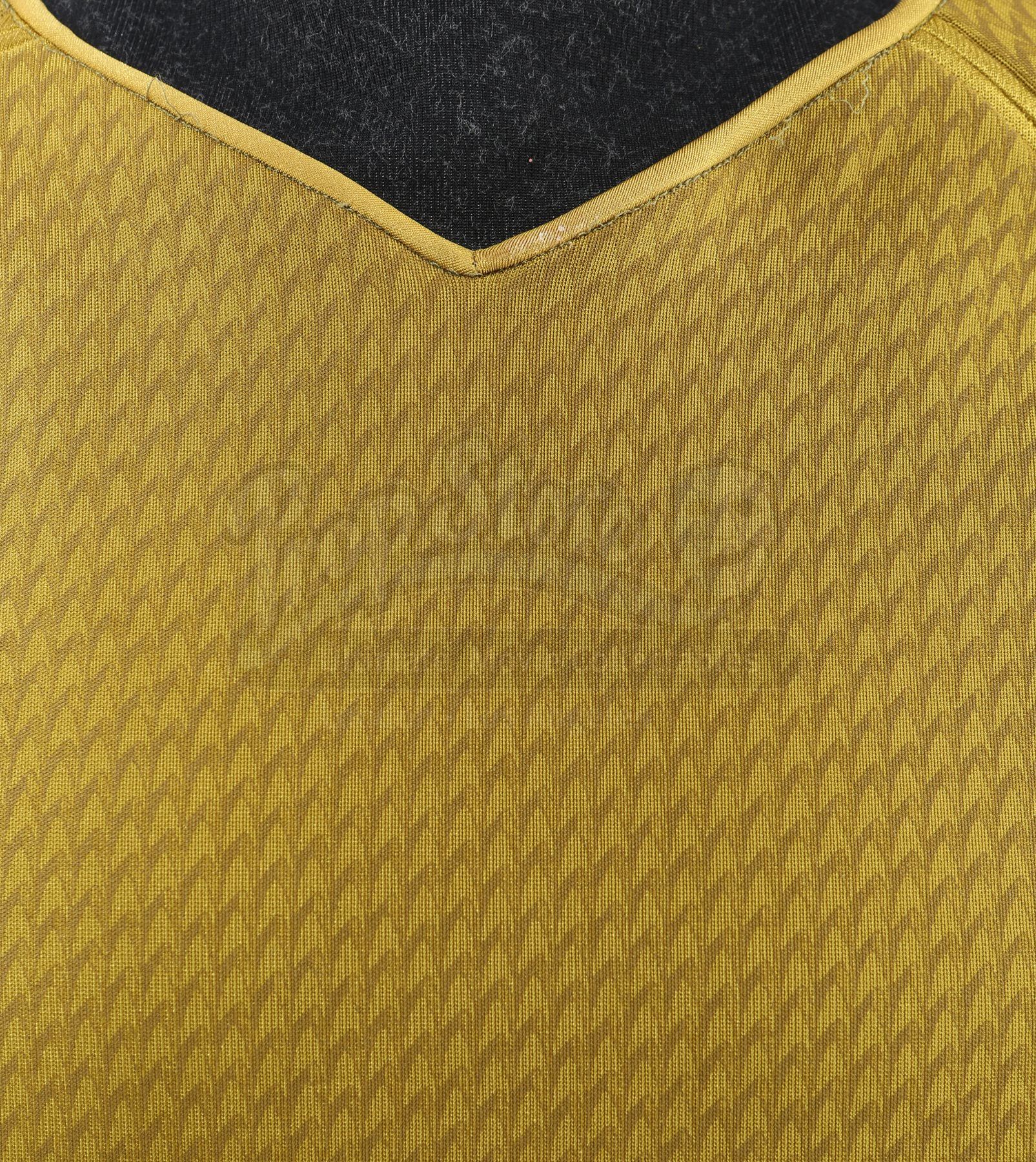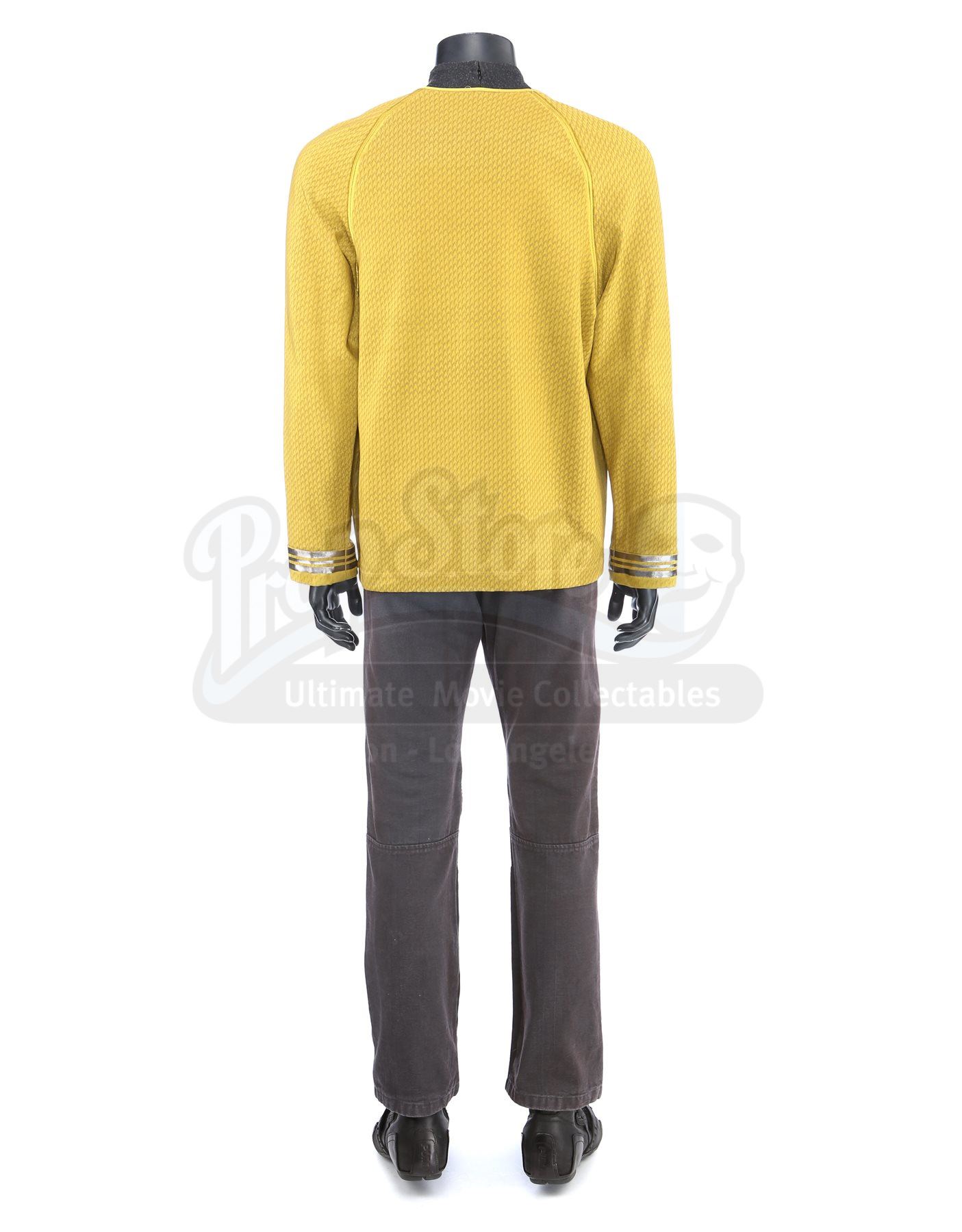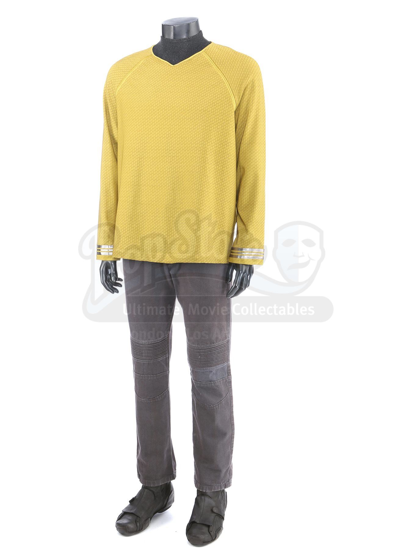 A Starfleet captain's Enterprise command uniform from Star Trek and likely reused in Star Trek Into Darkness. Captain's tunics were worn by Christopher Pike and Kirk in the first film, and only by Kirk in the sequel. It is unknown which of the two captains this tunic is attributed to. This tunic is believed to have been worn by either Kirk or Pike, as no other Starfleet Captains are seen wearing this style of uniform. The costume consists of a tunic (approximate size large), semi-mock turtleneck undershirt (extra large), pants (marked size 34), and a pair of boots (marked U.S. size 12). Made for the first film and believed to be reused by Kirk in the sequel, the gold long-sleeved tunic is made of Spandex and features a printed optical repeat Starfleet insignia pattern, piping around the collar and three silver bands on the wrists. The undershirt consists of a grey polyester collar that is stitched to the top of a modified Spandex sport shirt. The dark grey twill pants have ribbed fabric above the knees. Also included is a pair of black leather ankle boots with rubber soles. Estimate: $2000 - 3000*Estimated sale price; sold without reserve.