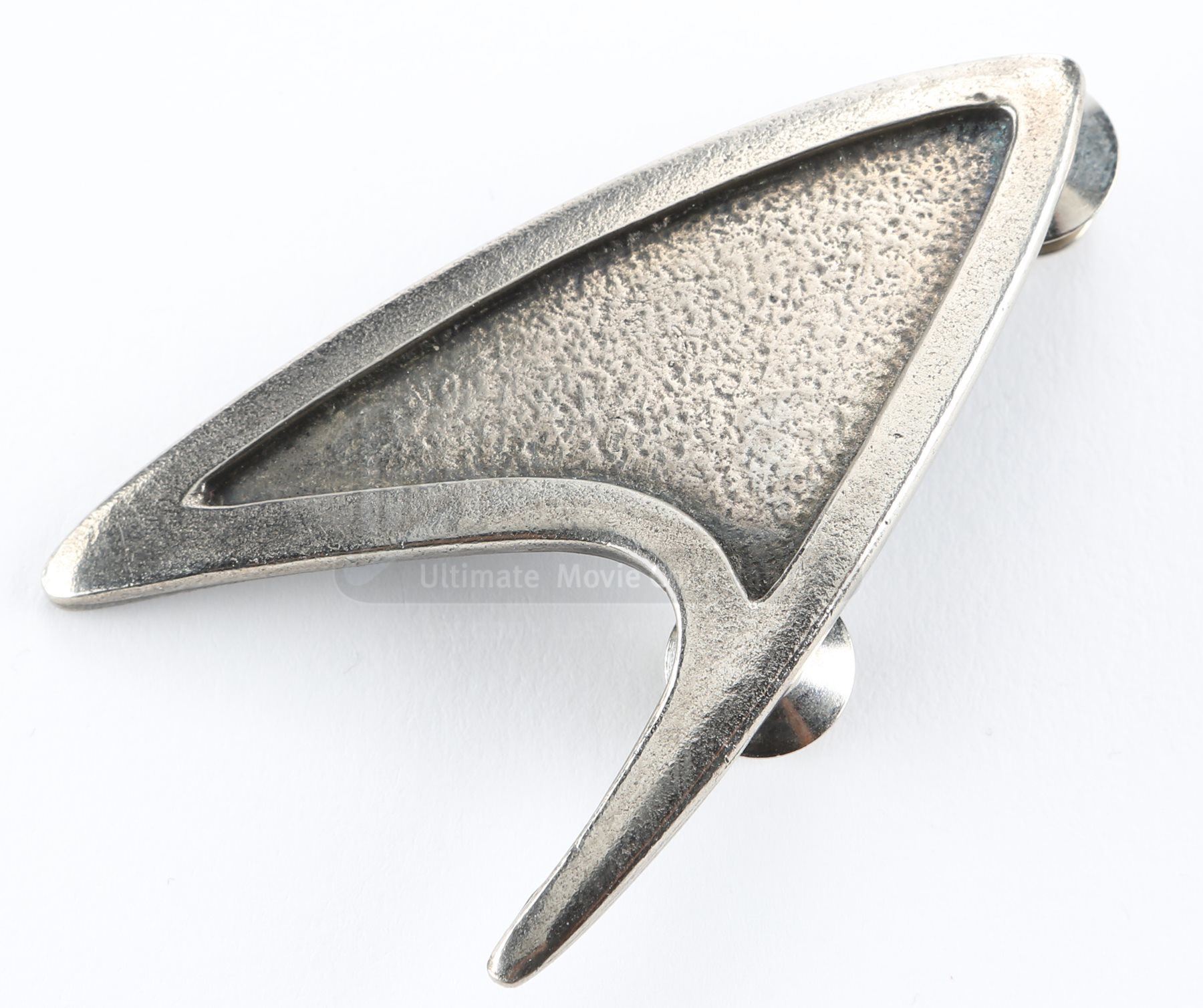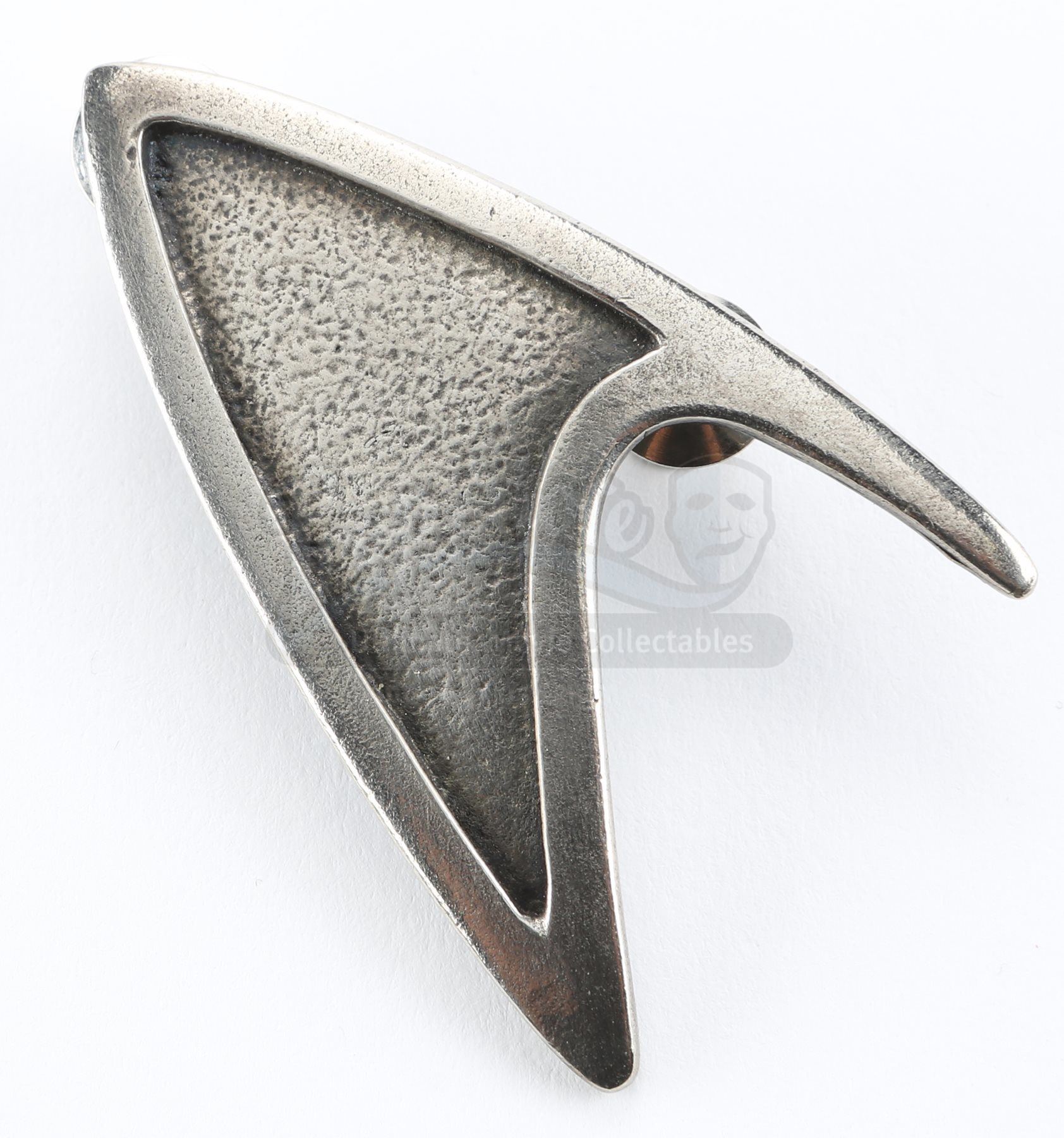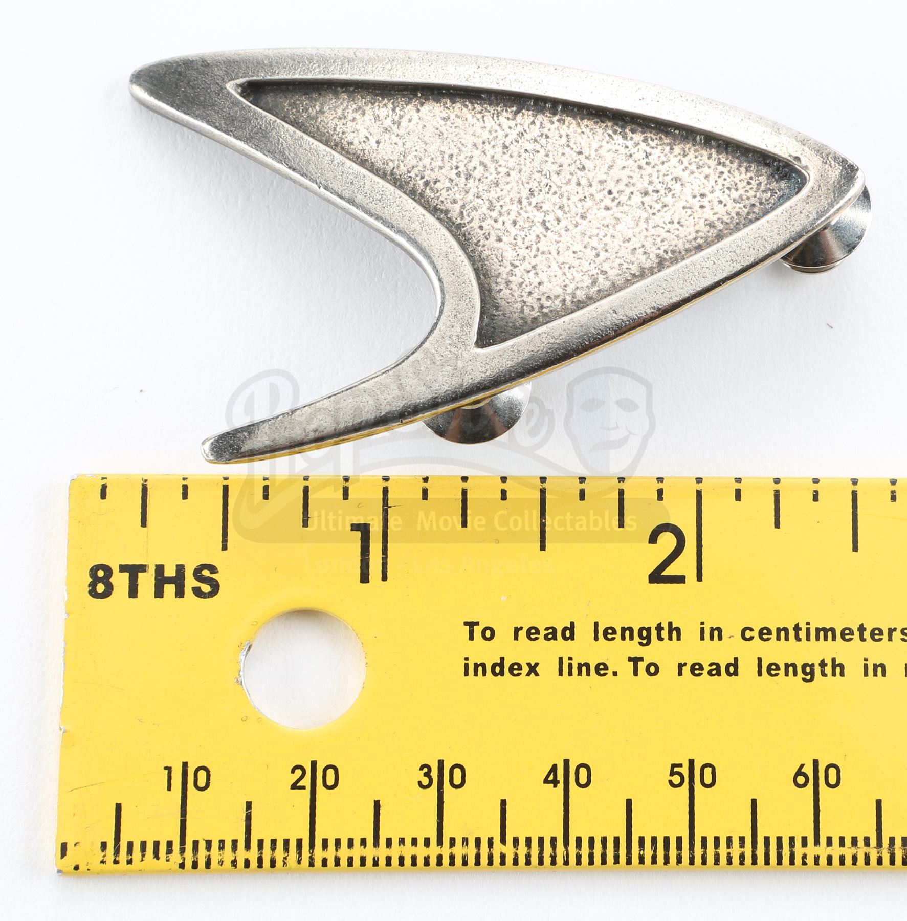 A Starfleet insignia pin from Star Trek and Star Trek Into Darkness. Pins were attached to various Starfleet members' uniforms, such as Starfleet staff members, featured throughout the series. The pin is made of metal and includes two pin backs for attaching to the wearer's clothing, with the third broken off. The pin shows minor wear due to production use but remains otherwise in good condition.Dimensions: 2 ½" x 1 ½" x ½ (6 cm x 4 cm x 1 cm) Estimate: $800 - 1000*Estimated sale price; sold without reserve.