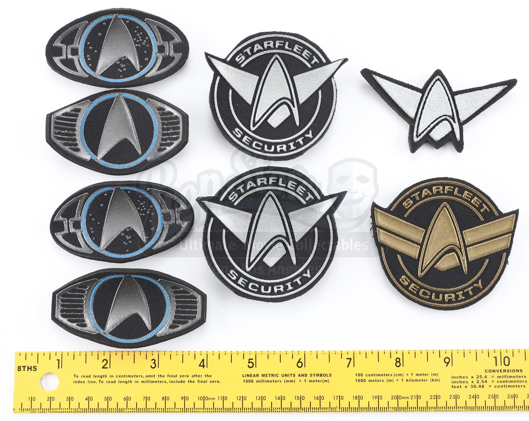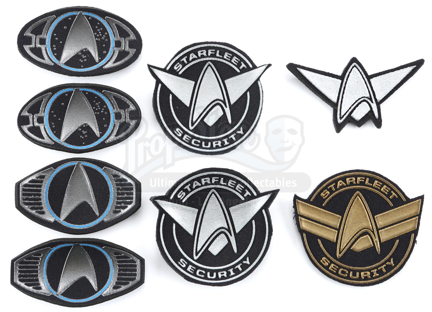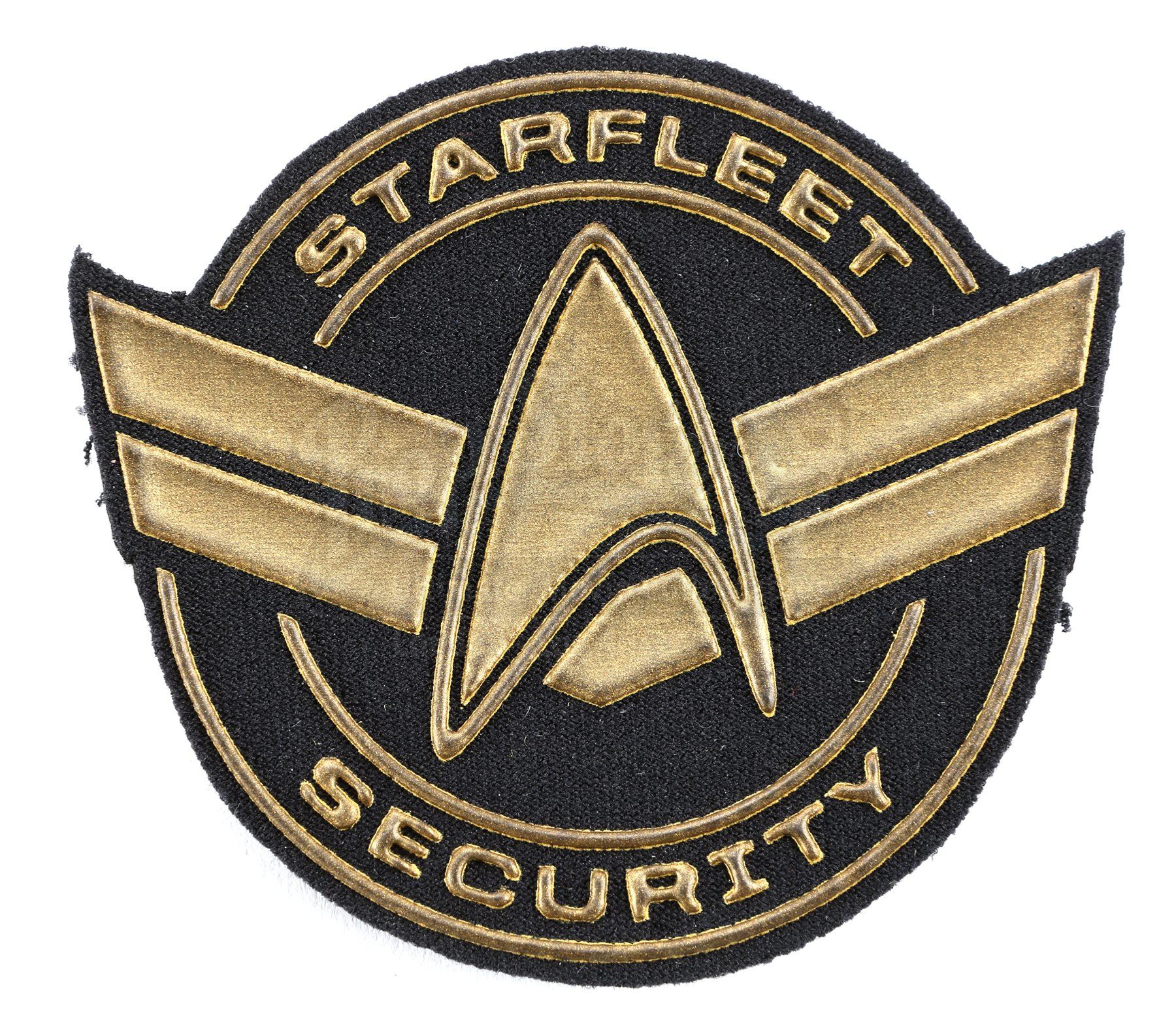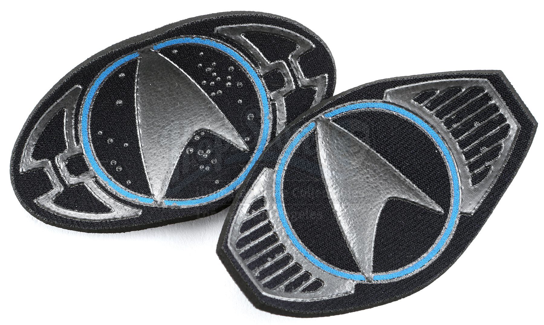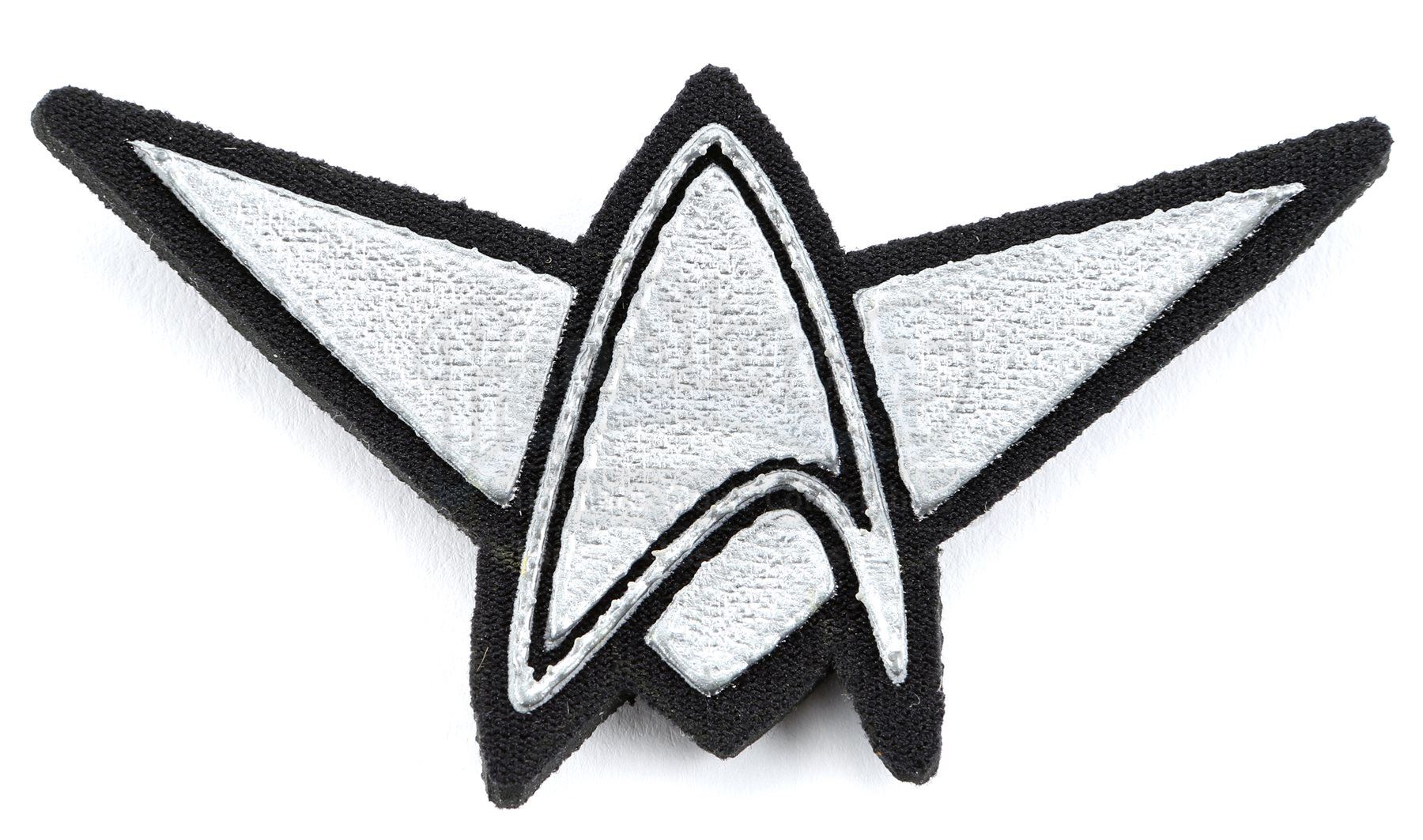 A Starfleet patch set from Star Trek and Star Trek Into Darkness. Patches were attached to various Starfleet uniforms featured throughout the series. Each patch is made of foam. The lot includes two silver security patches, a gold security patch, two pilot cap patches, two loader cap patches and a trimmed silver security insignia. Dimensions: 3 ½" x 3" x 1 ½" (9 cm x 8 cm x 4 cm)Estimate: $1000 - 1500*Estimated sale price; sold without reserve.