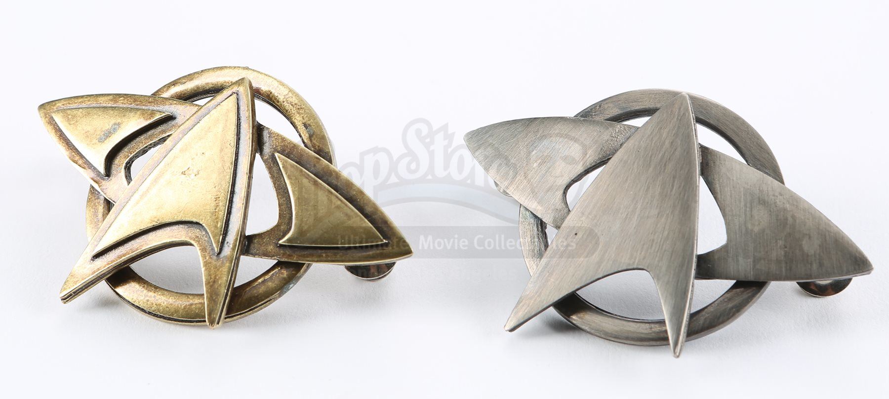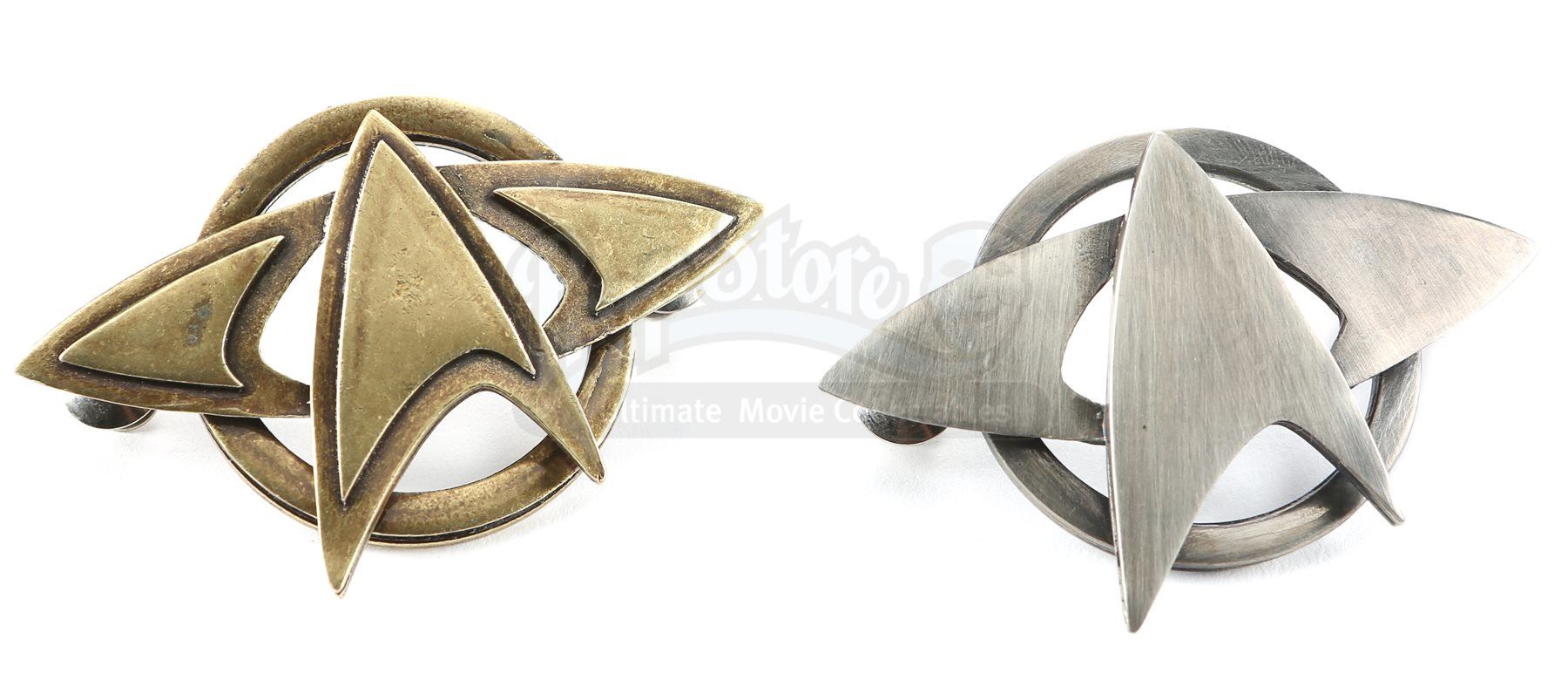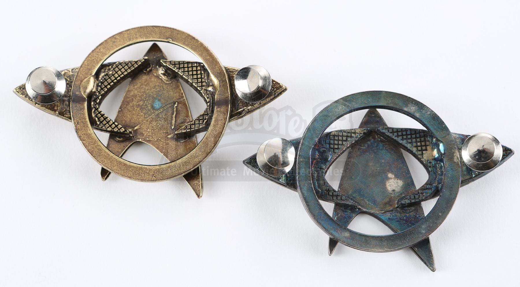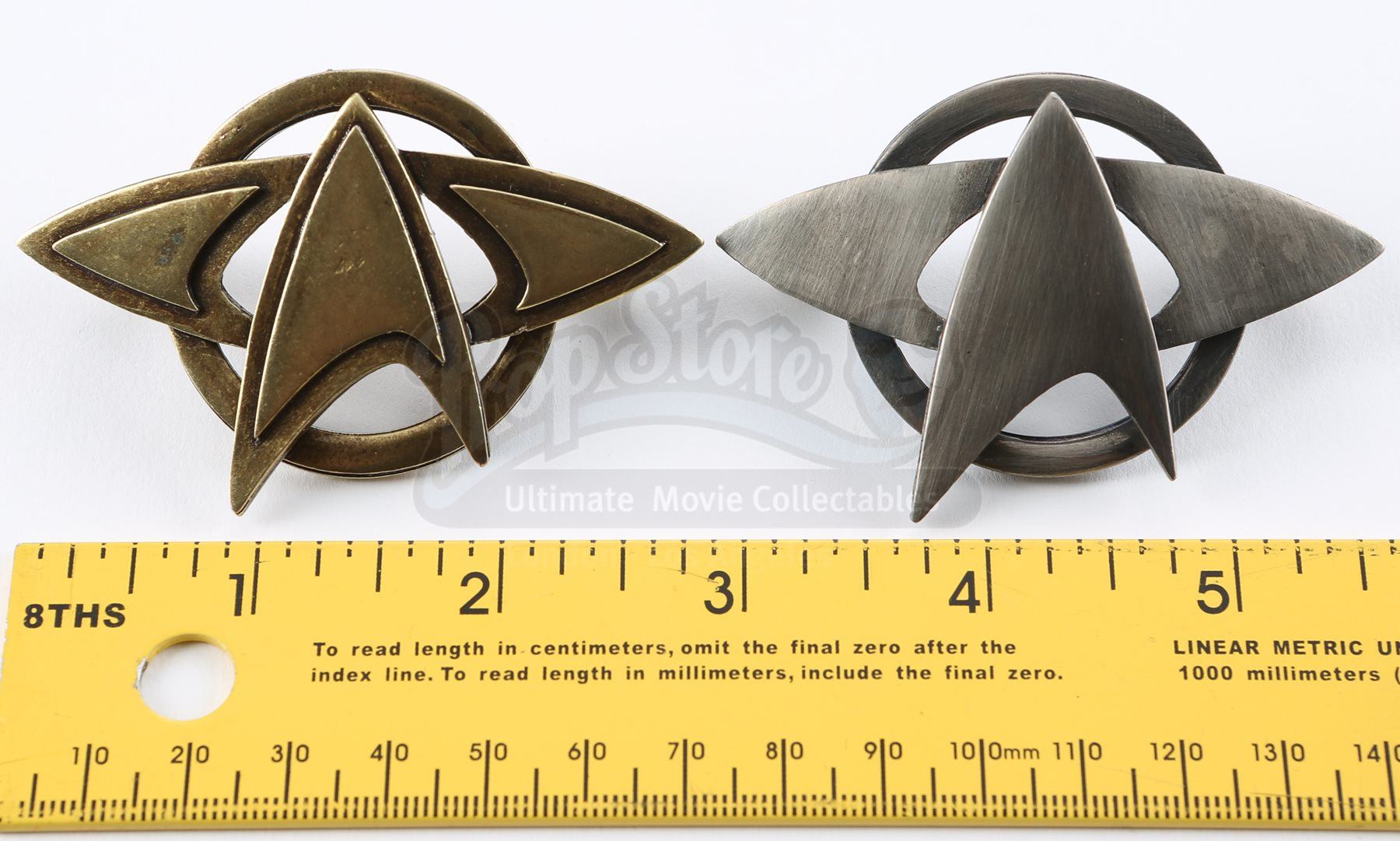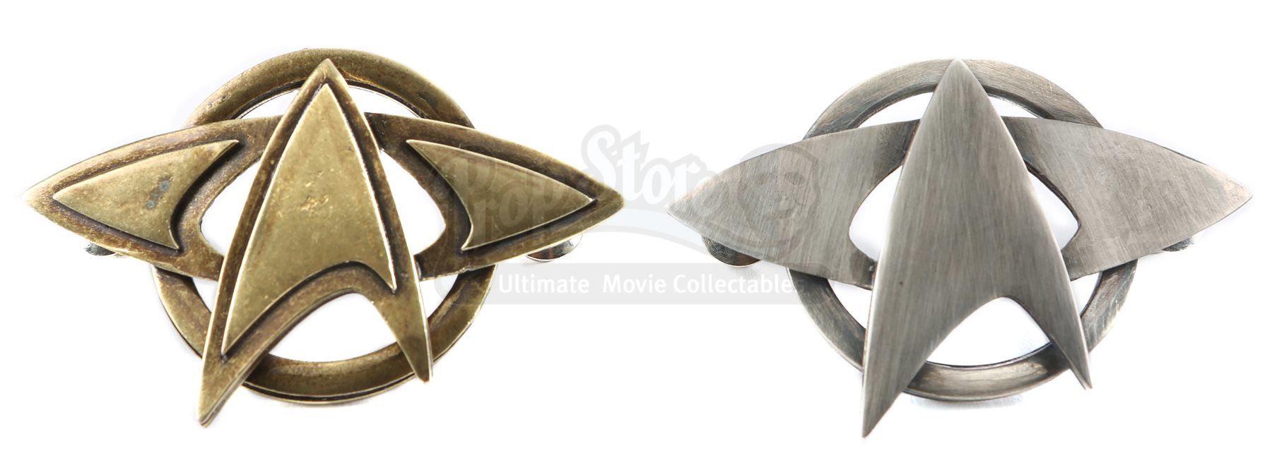 A Starfleet pin set from Star Trek and Star Trek Into Darkness. Pins were attached to various Starfleet uniforms featured throughout the series. The pins are made of metal with the goldtone pin belonging to a Starfleet admiral's cap and the silvertone pin belonging to an enlisted crewman's cap. Both pins include two pin backs for attaching to the wearer's clothing. Dimensions: 3 ½" x 3" x 1" (9 cm x 8 cm x 3 cm)Estimate: $600 - 800*Estimated sale price; sold without reserve.