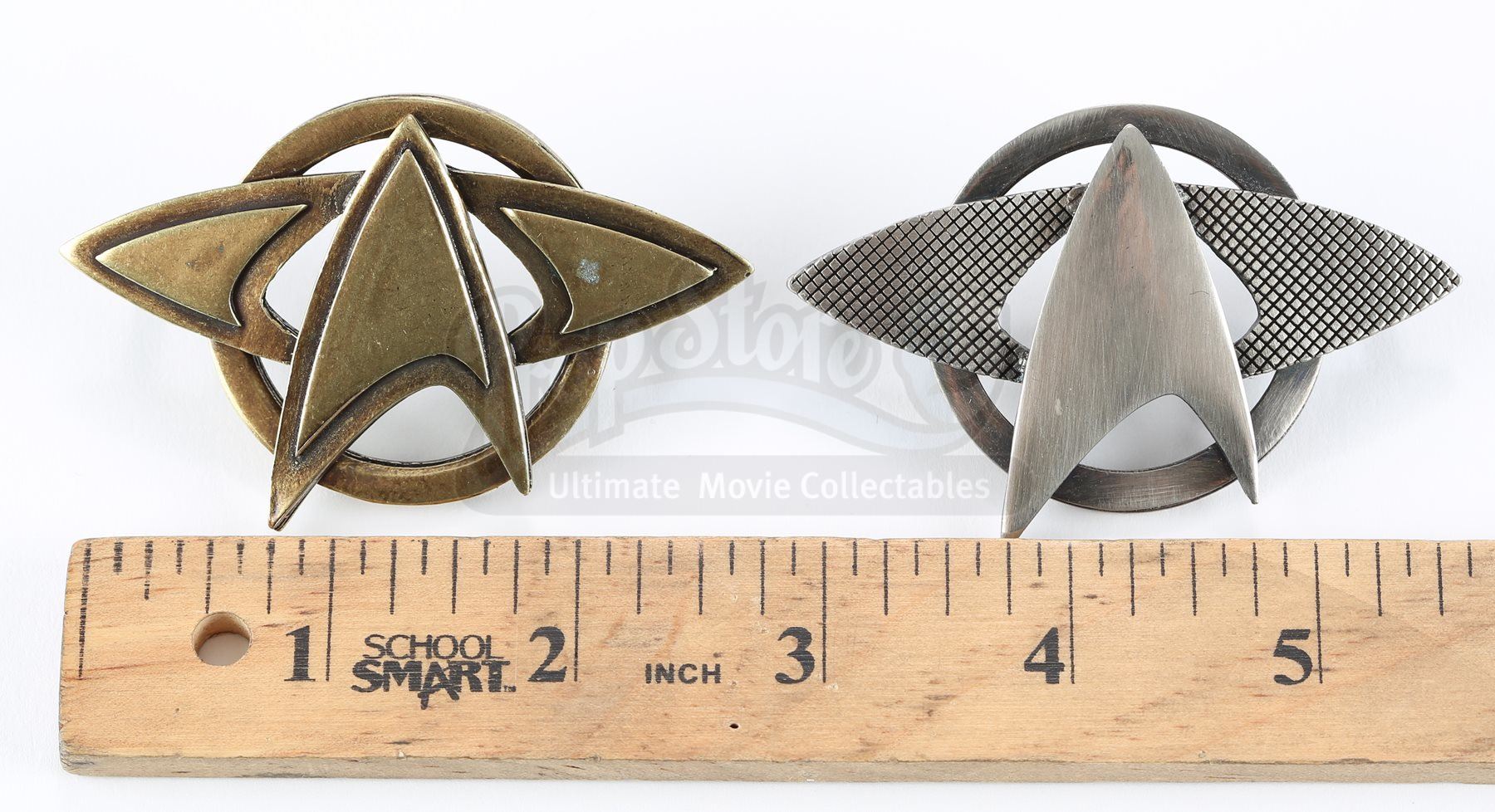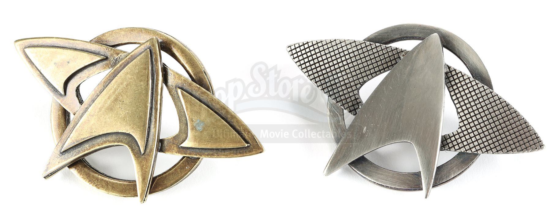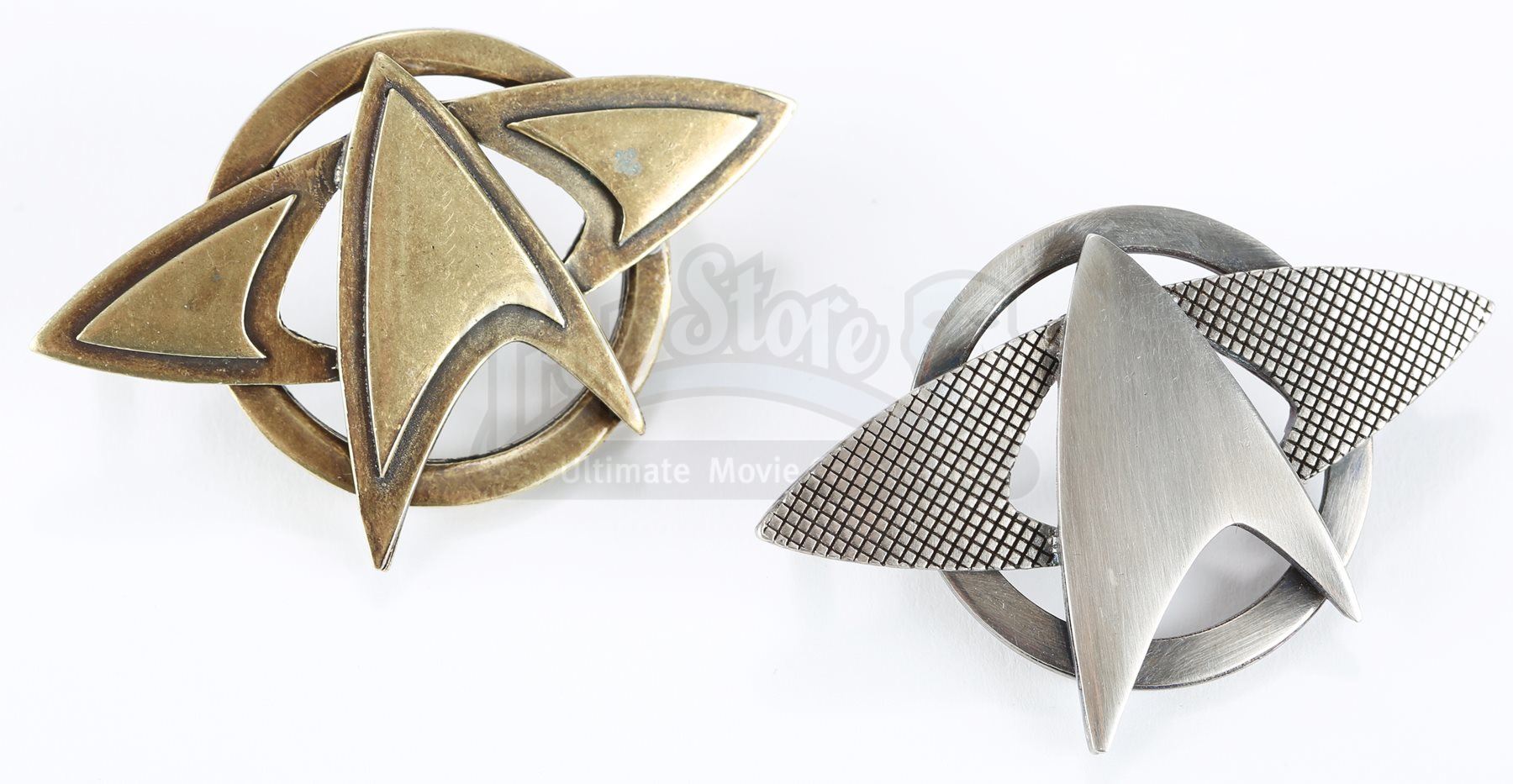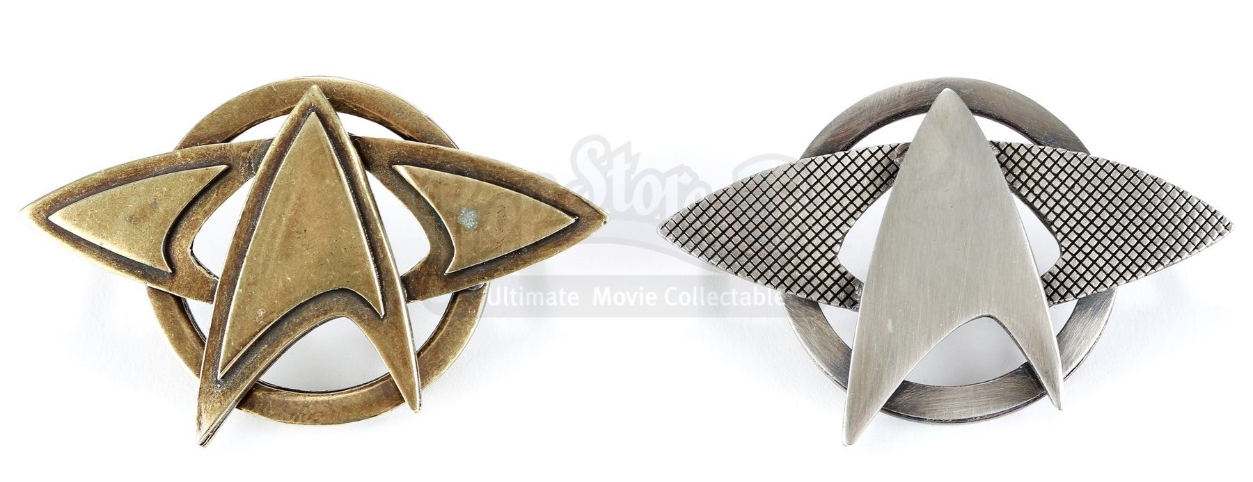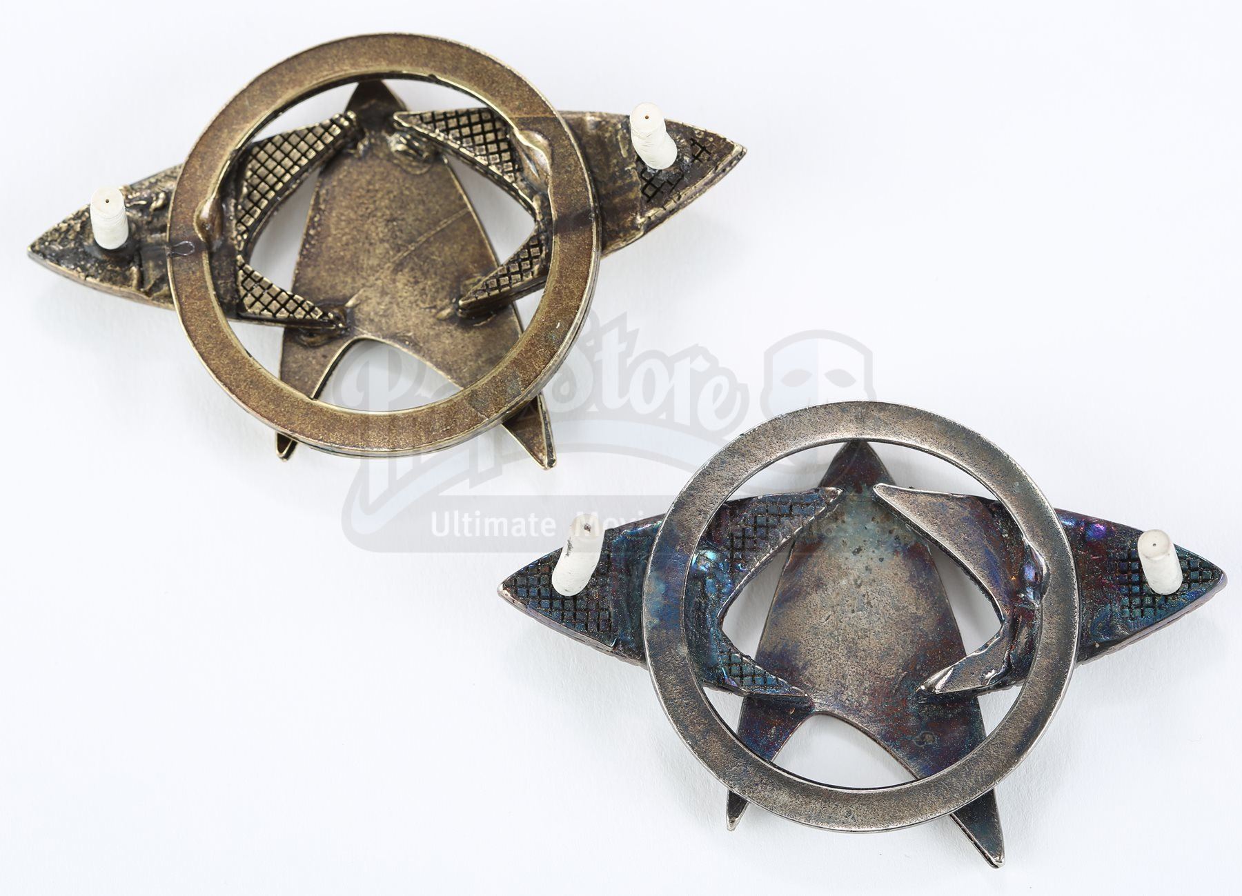A Starfleet pin set from Star Trek and Star Trek Into Darkness. Starfleet staff wore various pins on their uniforms. The pins are made of metal with the goldtone pin belonging to a Starfleet admiral's cap and the silvertone pin belonging to a Starfleet officer's cap. Both pins include two pin backs for attaching to the wearer's clothing. Dimensions: 3 ½" x 3" x 1" (9 cm x 8 cm x 2.5 cm)Estimate: $600 - 800*Estimated sale price; sold without reserve.