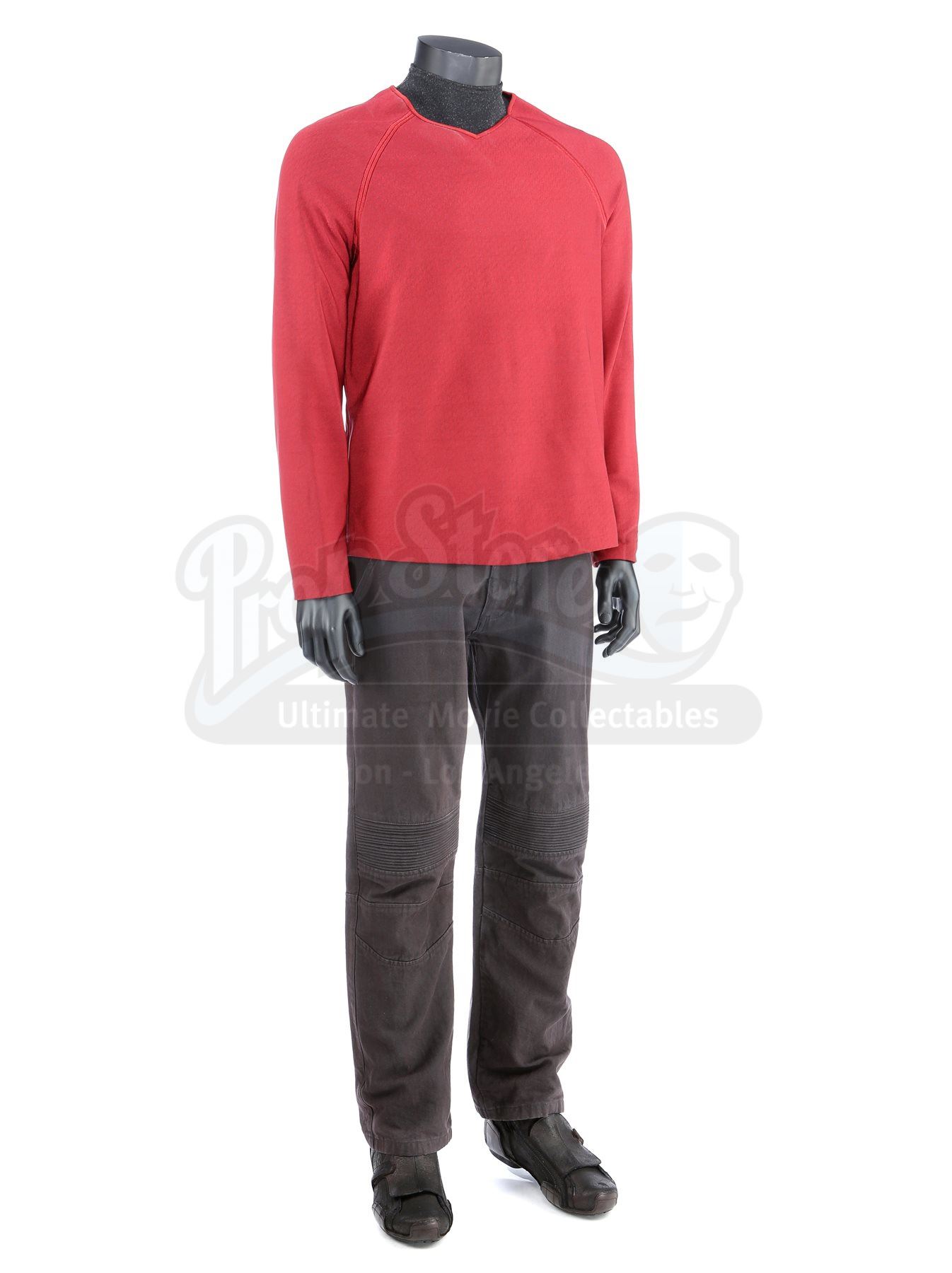 A transporter officer's uniform from Star Trek and reused in Star Trek Into Darkness. Enterprise staff in the transporter room wore their operations division uniforms. The costume includes a tunic (approximate size large), semi-mock turtleneck undershirt (large), pants (approximate size 32), and a pair of boots (marked U.S. size 10).