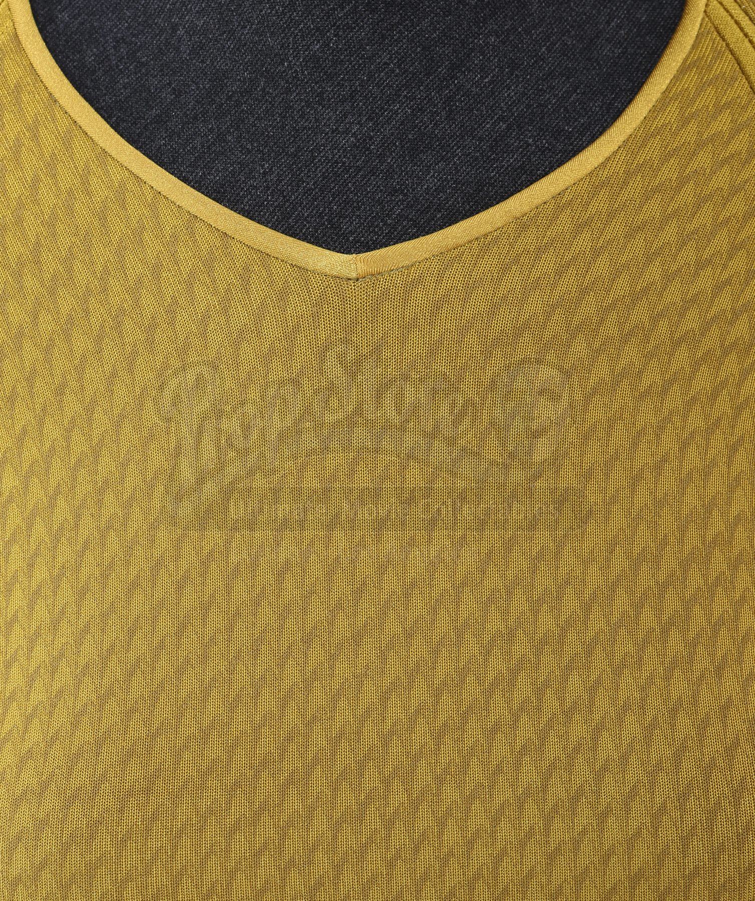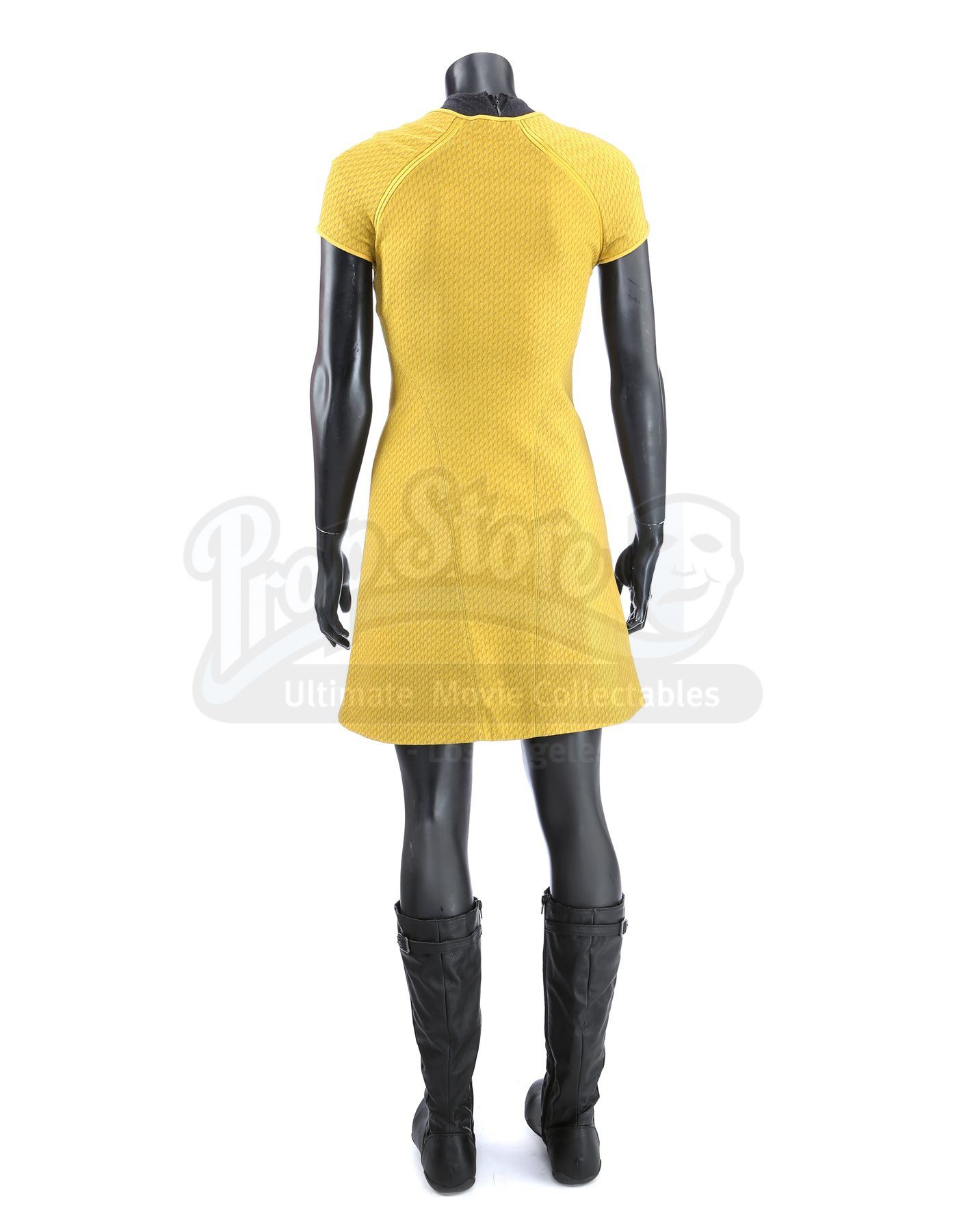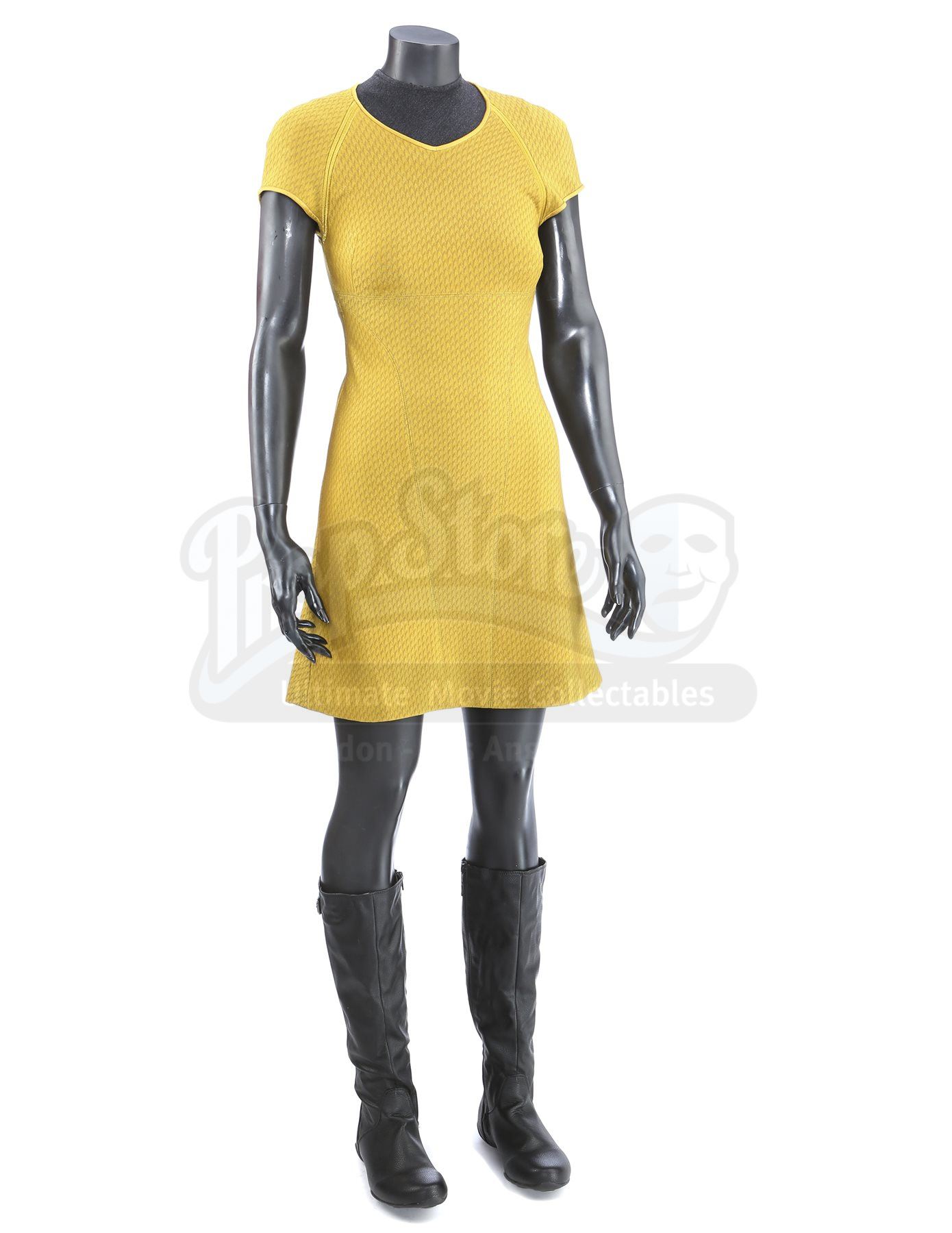 Made for the first film and reused in the sequel, the gold dress is made of Spandex, has piping around the collar and features a printed optical repeat Starfleet insignia pattern. The undershirt consists of a grey polyester turtleneck leotard. Also included is a pair of black knee-length leather boots with rubber soles.