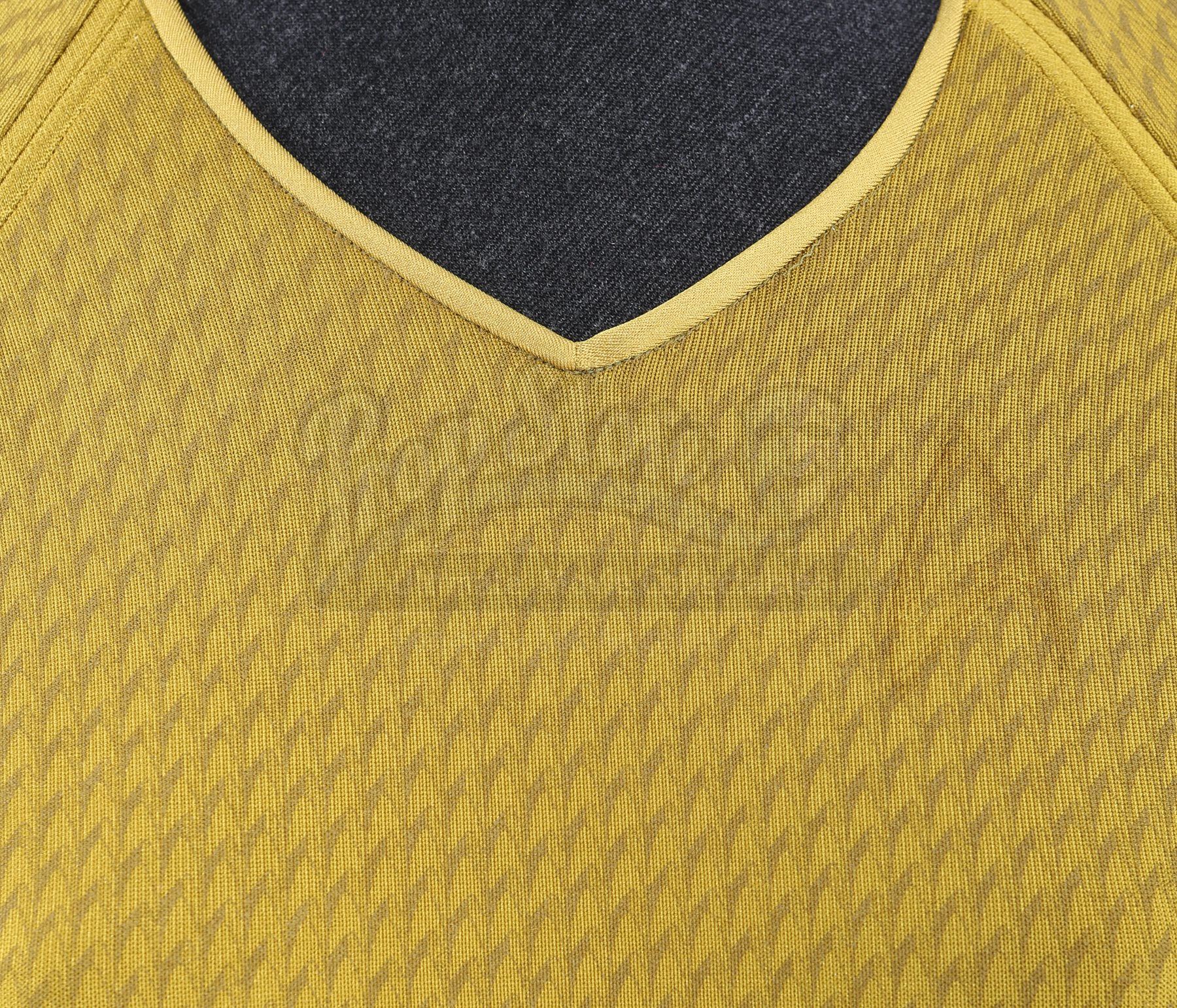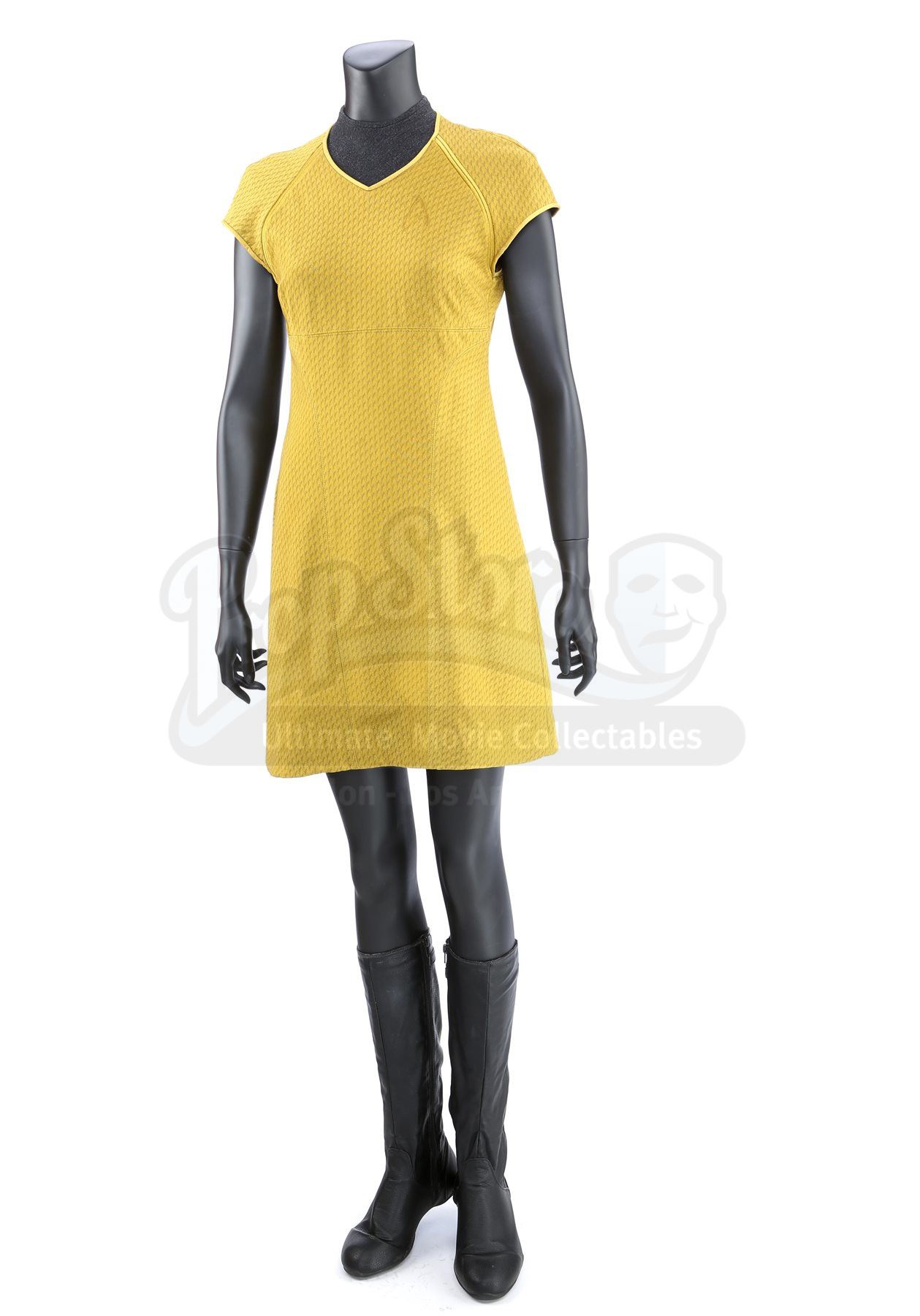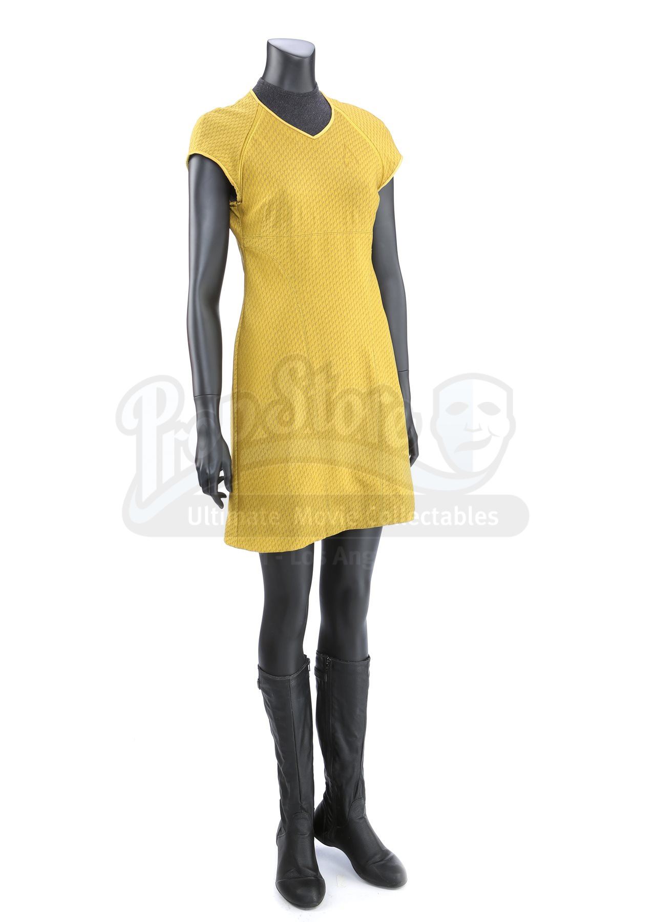 A women's Enterprise command uniform from Star Trek and Star Trek Into Darkness. Enterprise staff in the command division wore their uniforms while aboard the Enterprise throughout the first two films. The costume includes a dress (approximate size small), semi-mock turtleneck undershirt (approximate size small) and a pair of boots (marked U.S. size 7.5).Made for the first film and reused in the sequel, the gold dress is made of Spandex, has piping around the collar and features a printed optical repeat Starfleet insignia pattern. The undershirt consists of a grey polyester turtleneck leotard. Also included is a pair of black knee-length leather boots with rubber soles. The costume features a hand-written wardrobe label in the dress marked with the actor's name. Estimate: $1000 - 1500*Estimated sale price; sold without reserve.