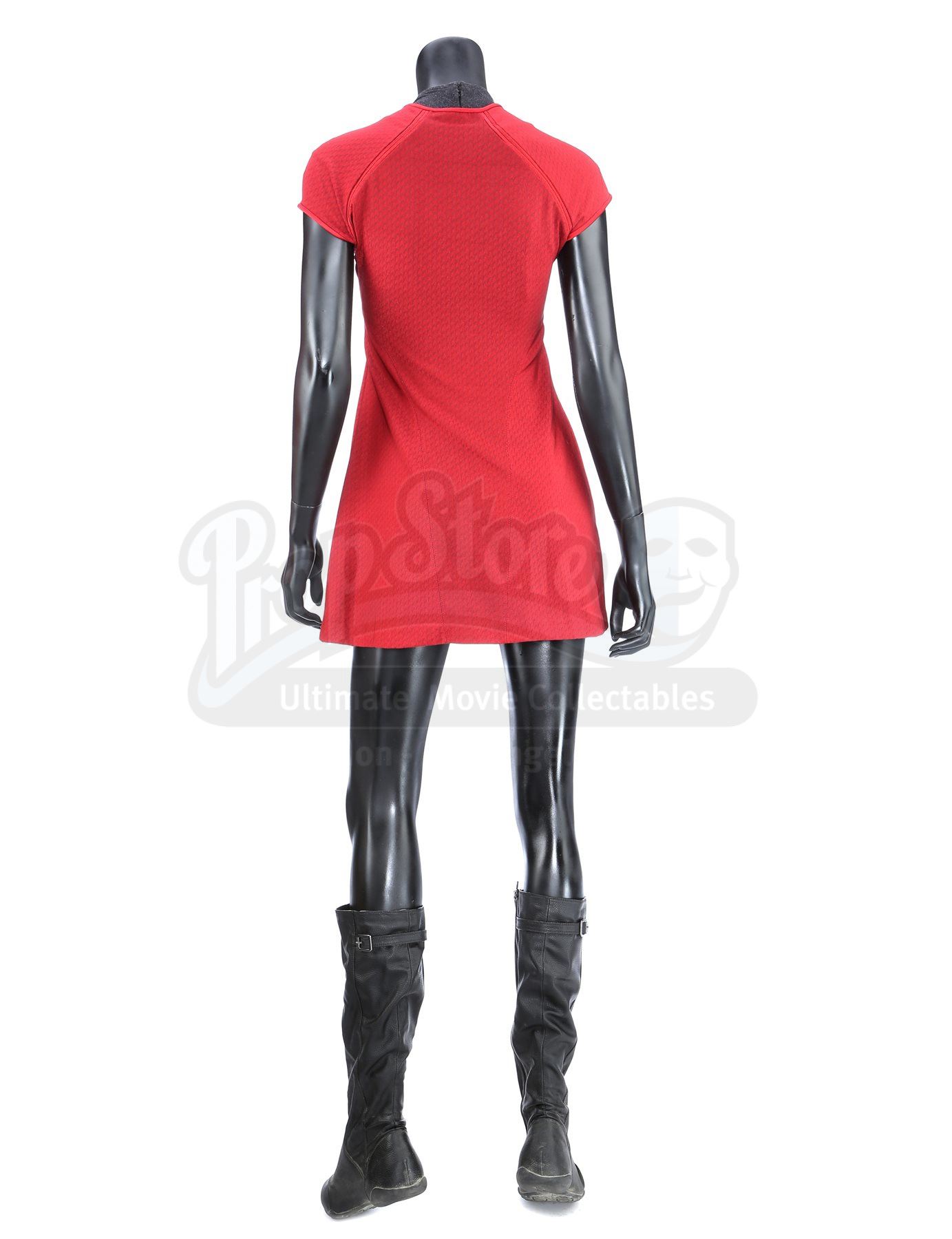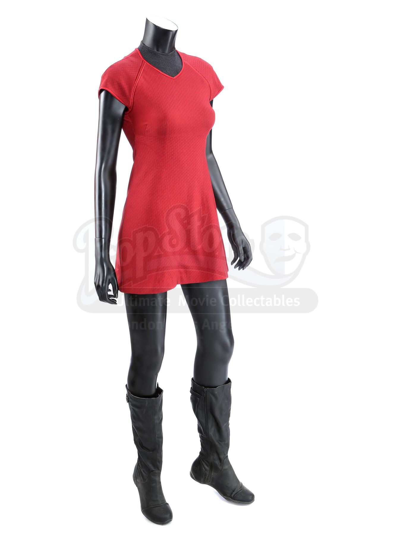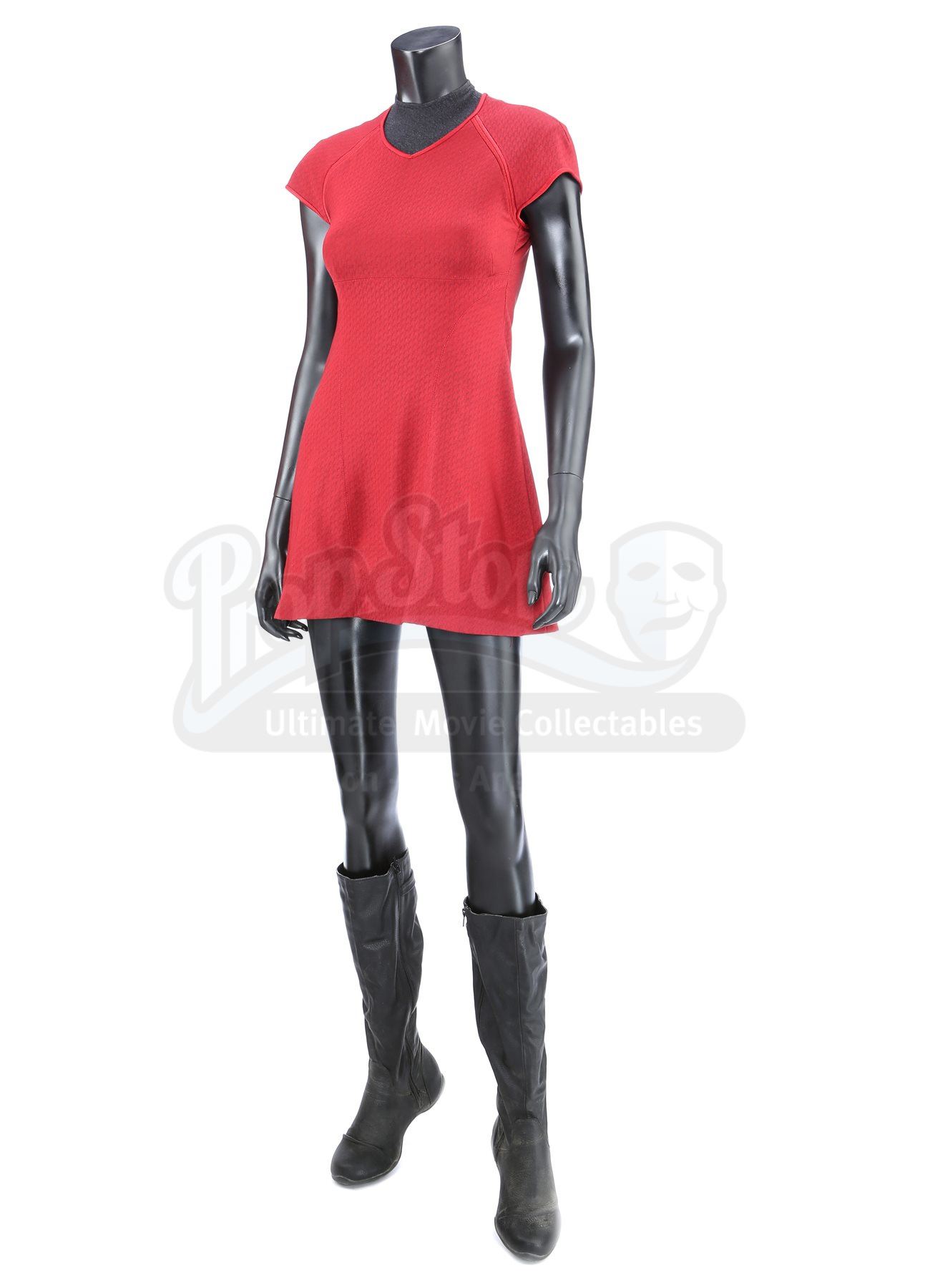A women's Enterprise operations uniform from Star Trek and reused in Star Trek Into Darkness. Enterprise staff in the operations division wore their uniforms while aboard the Enterprise throughout the first two films. The costume includes a dress (approximate size small), semi-mock turtleneck undershirt (approximate size small) and a pair of boots (marked U.S. size 8.5). Made for the first film and reused in the sequel, the red dress is made of Spandex, has piping around the collar and features a printed optical repeat Starfleet insignia pattern. The undershirt consists of a grey polyester turtleneck leotard. Also included is a pair of black leather boots with rubber soles. The costume features hand-written wardrobe labels in the dress and undershirt marked with the actor's name. Estimate: $1000 - 1500*Estimated sale price; sold without reserve.