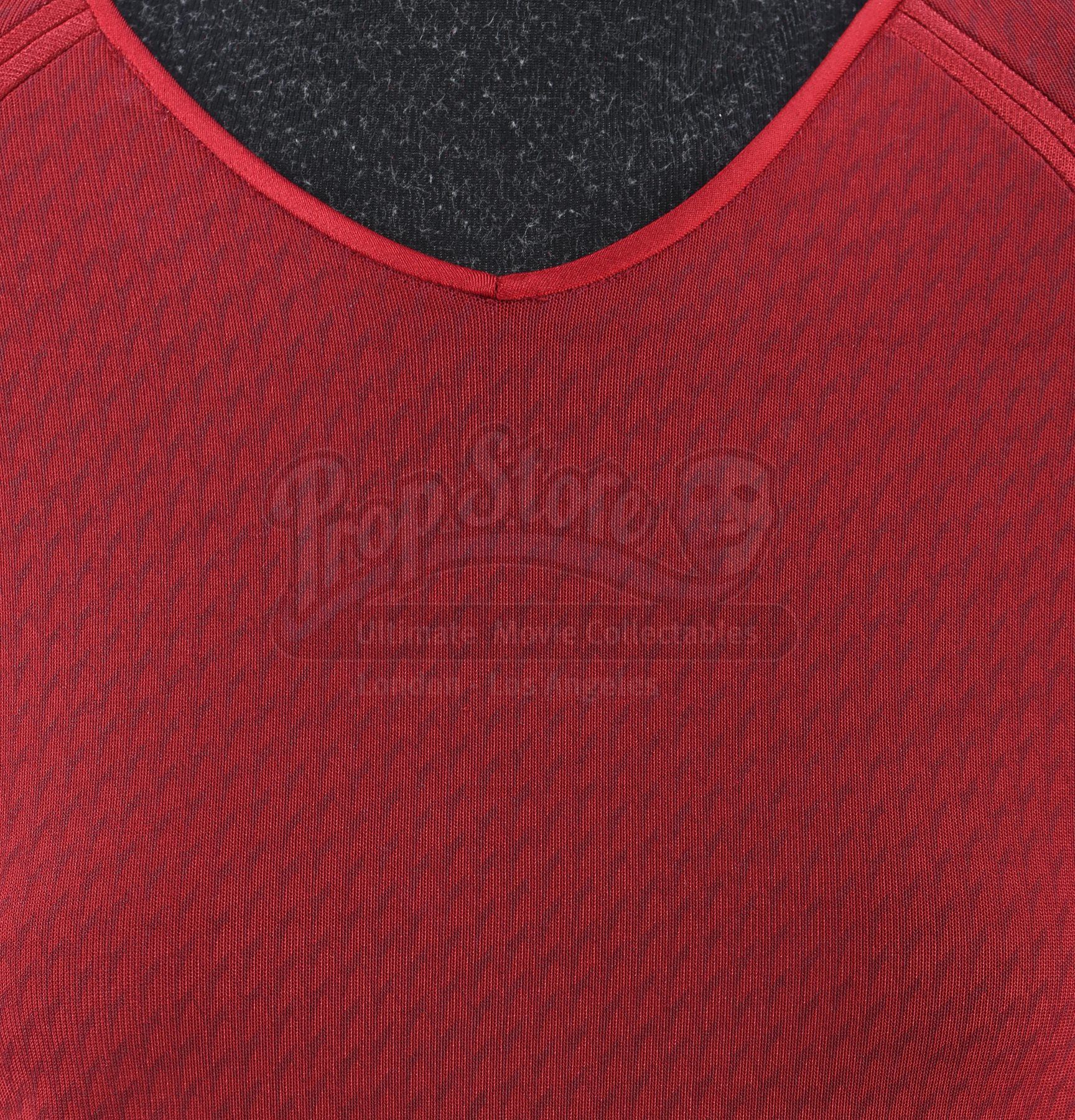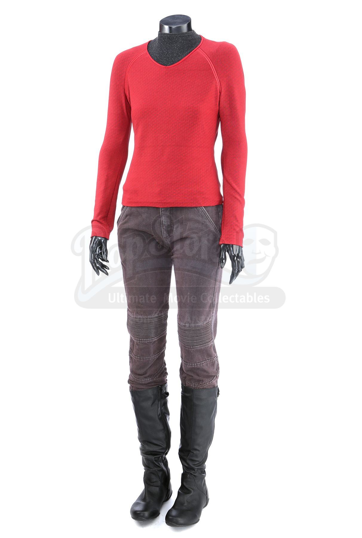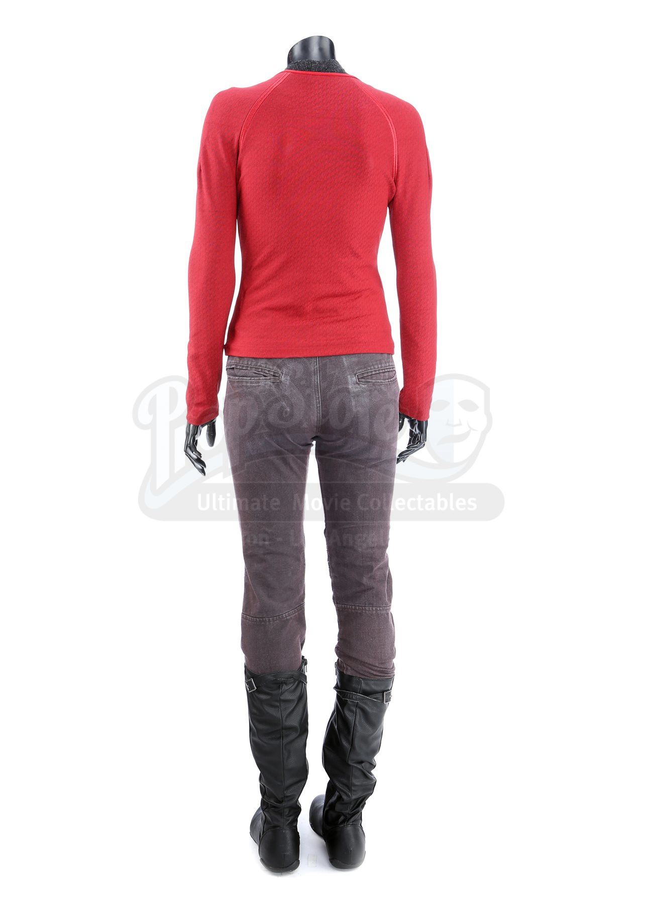 A women's Enterprise operations uniform from Star Trek and reused in Star Trek Into Darkness. Enterprise staff in the operations division wore their uniforms while aboard the Enterprise throughout the first two films. The costume includes a tunic (approximate size small), semi-mock turtleneck undershirt (small), pants (marked size 28), and a pair of boots (marked U.S. size 8). Made for the first film and reused in the sequel, the red long-sleeved tunic is made of Spandex, has piping around the collar and features a printed optical repeat Starfleet insignia pattern. The undershirt consists of a grey polyester collar that is stitched to the top of a modified Spandex sport shirt. The dark grey twill pants have ribbed fabric above the knees. Also included is a pair of black leather boots with rubber soles. Estimate: $1000 - 1500*Estimated sale price; sold without reserve.