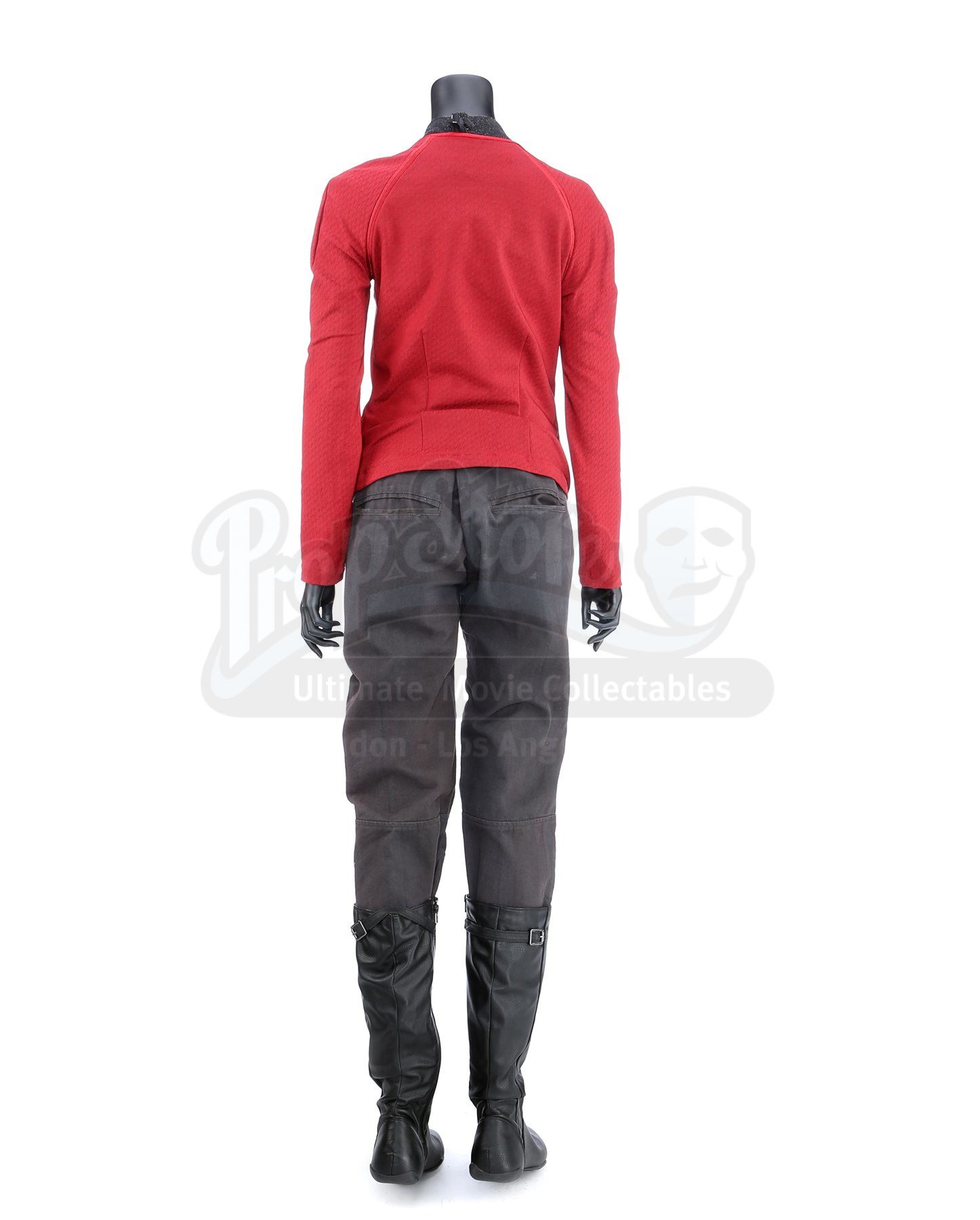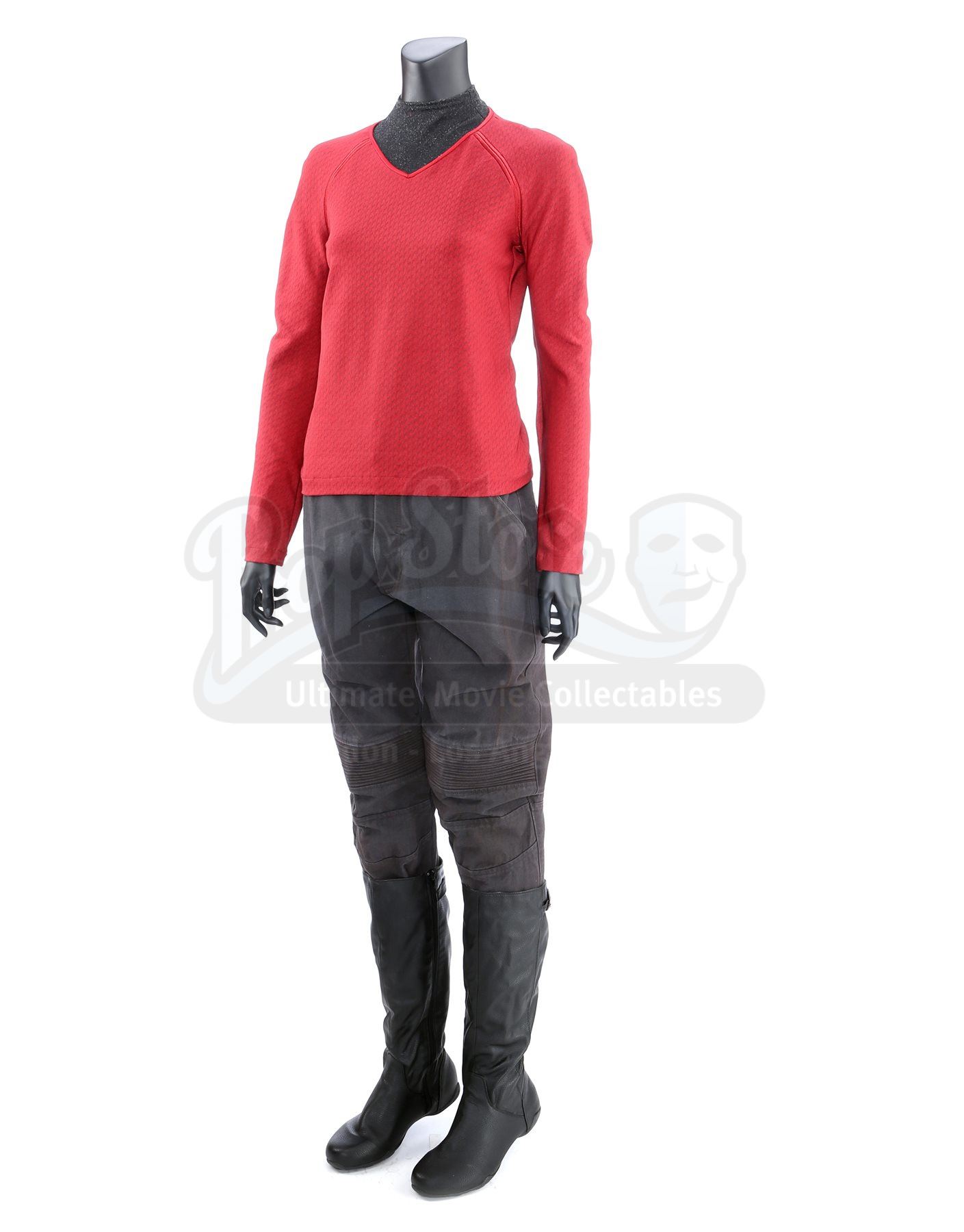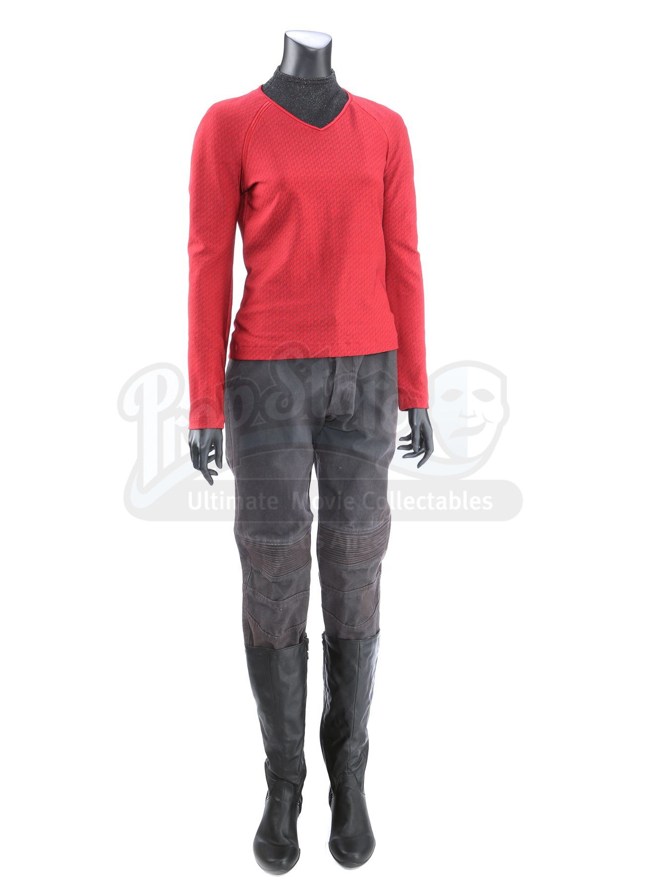 A women's Enterprise operations uniform from Star Trek and Star Trek Into Darkness. Enterprise staff in the operations division wore their uniforms while aboard the Enterprise throughout the first two films. The costume includes a tunic (approximate size small), semi-mock turtleneck undershirt (approximate size small), pants (marked size 34), and a pair of boots (marked U.S. size 8.5). Made for the first film and reused in the sequel, the red long-sleeved tunic is made of Spandex, has piping around the collar and features a printed optical repeat Starfleet insignia pattern. The undershirt consists of a grey polyester collar that is stitched to the top of a modified Spandex sport shirt. The dark grey twill pants have ribbed fabric above the knees. Also included is a pair of black knee-length leather boots with rubber soles. Estimate: $1000 - 1500*Estimated sale price; sold without reserve.