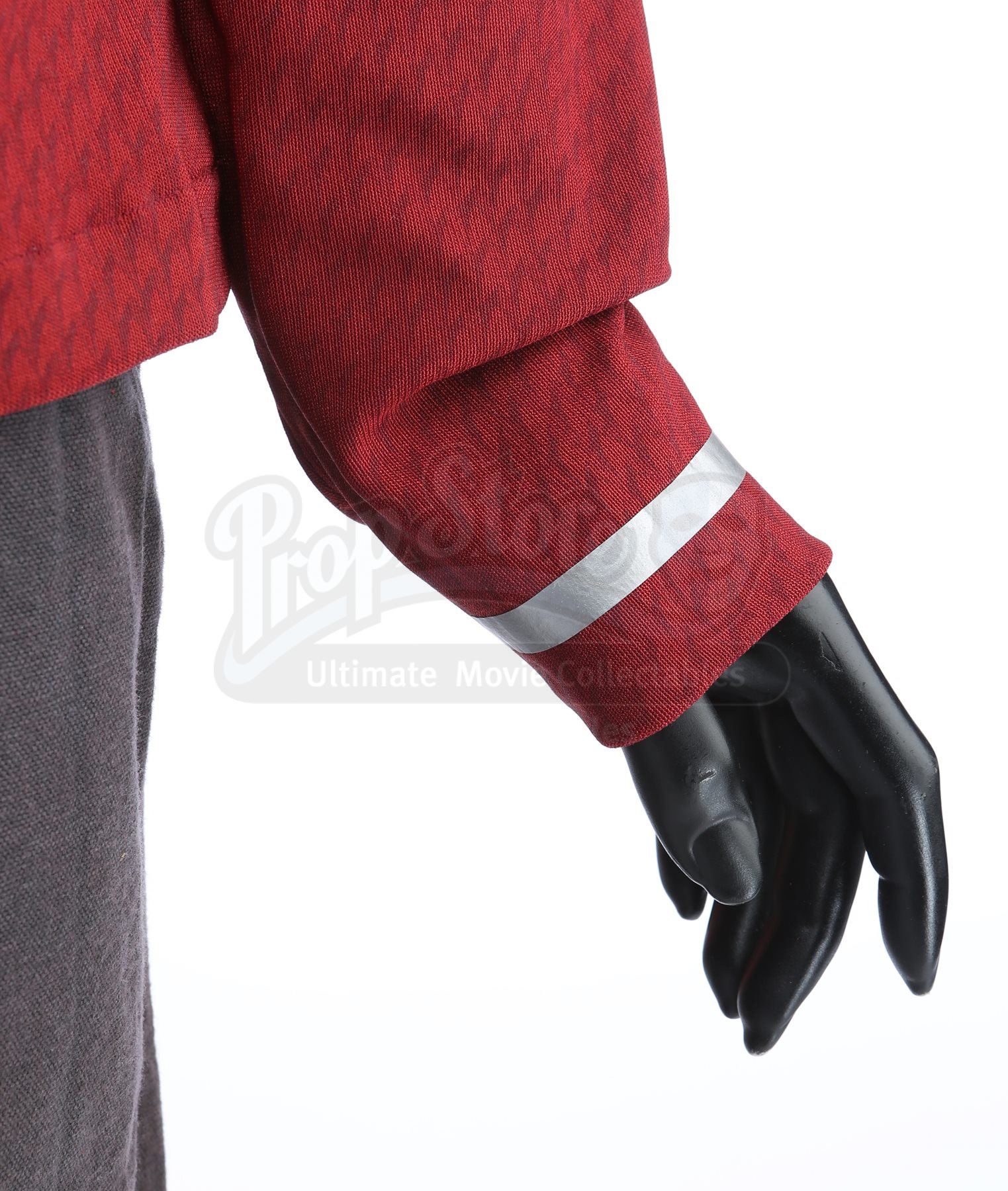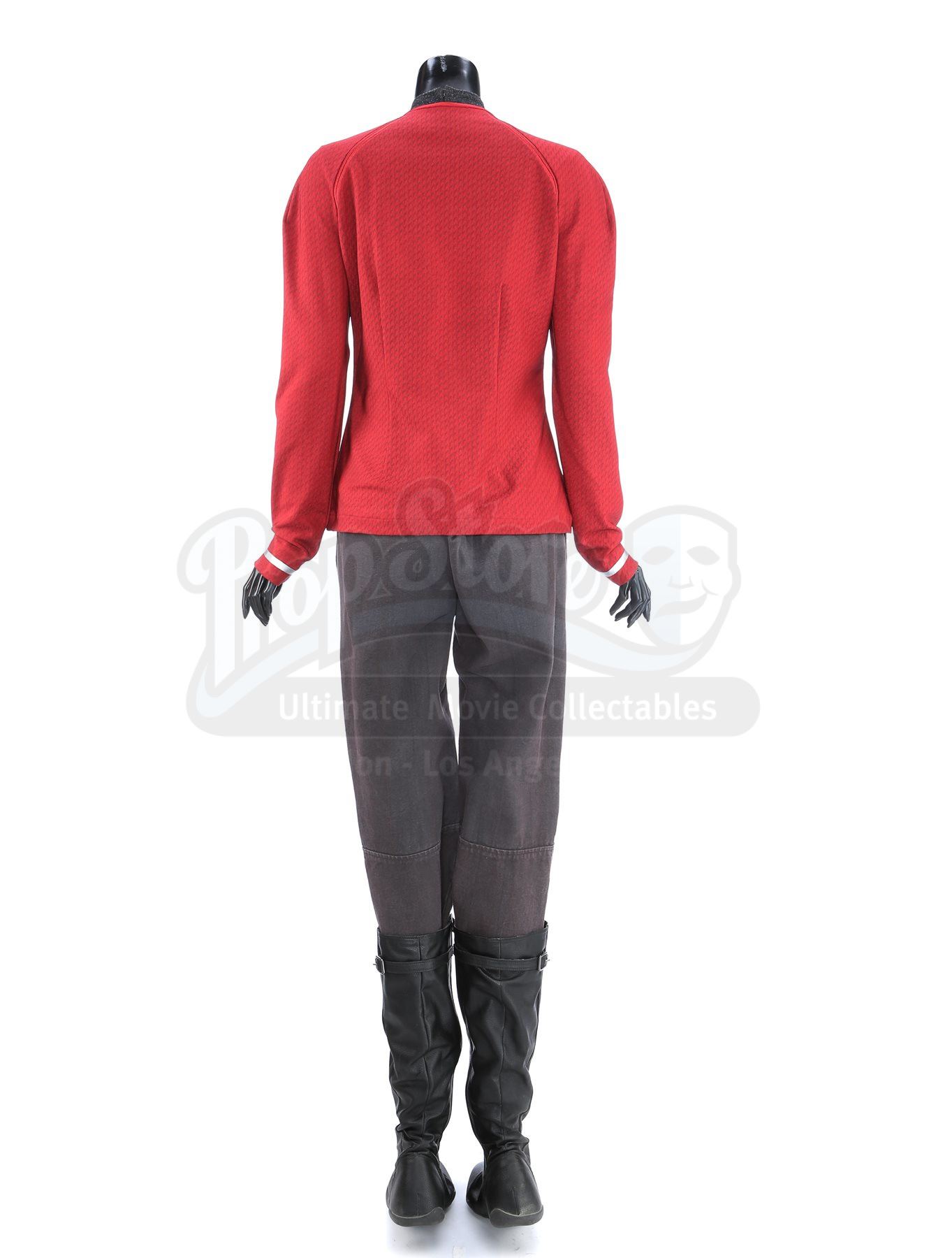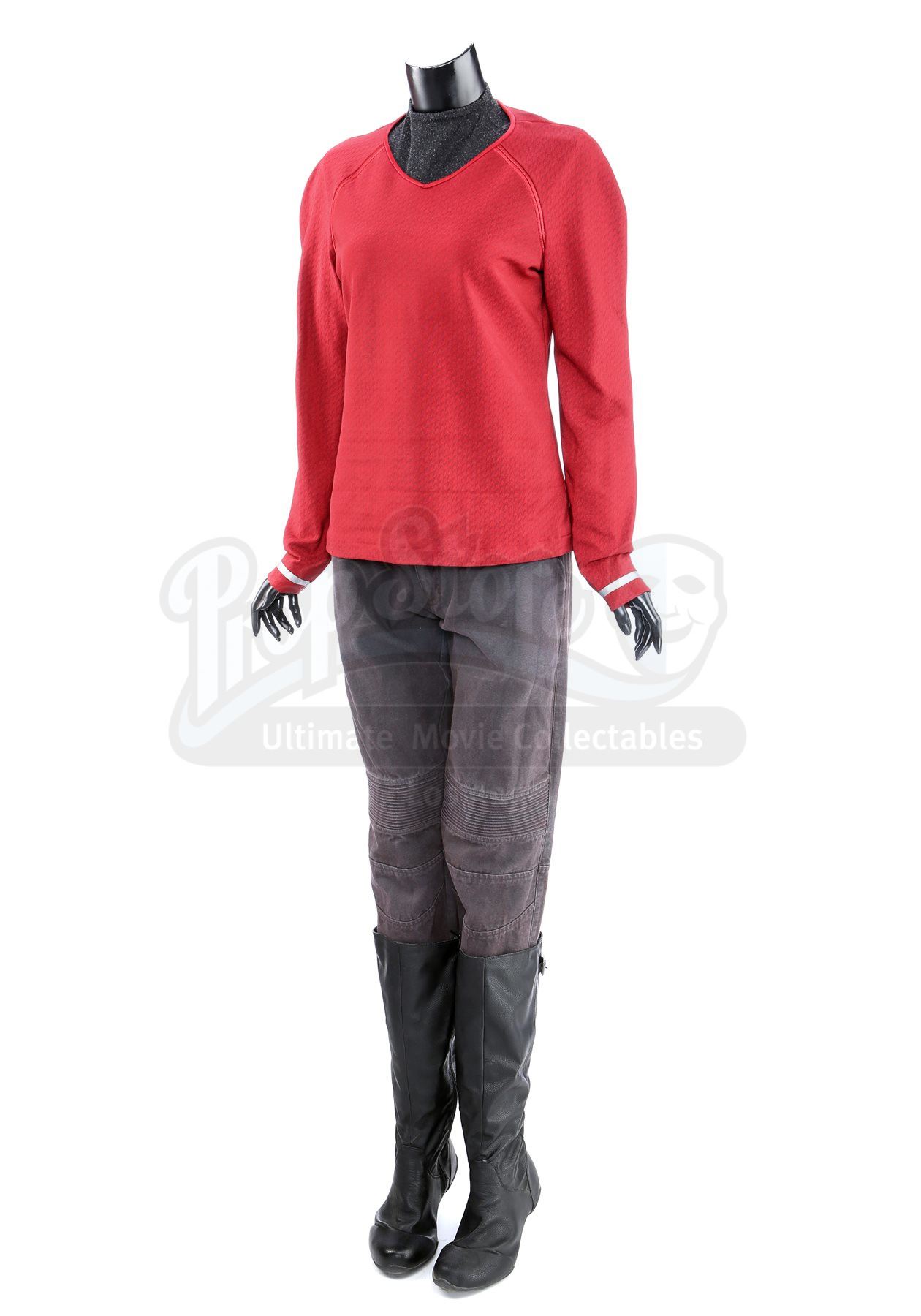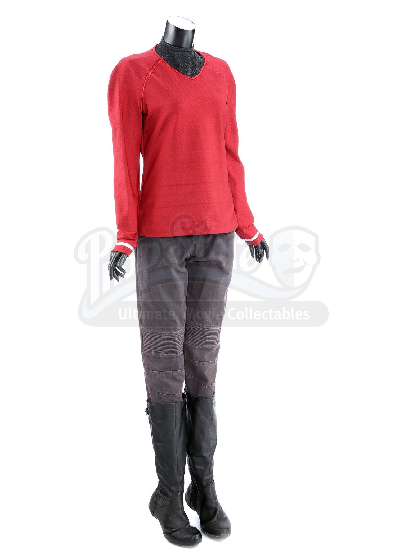 A women's Enterprise operations uniform from Star Trek and Star Trek Into Darkness. Enterprise staff in the operations division wore their uniforms while aboard the Enterprise throughout the first two films. The costume includes a tunic (approximate size medium), semi-mock turtleneck undershirt (small), pants (marked size 36), and a pair of boots (marked U.S. size 9.5).Made for the first film and reused in the sequel, the red tunic is made of Spandex and features a printed optical repeat Starfleet insignia pattern. The long-sleeved shirt also has piping around the collar and one silver band on the wrists. The undershirt consists of a grey polyester collar that is stitched to the top of a modified Spandex sport shirt. The dark grey twill pants were made for the first film and have ribbed fabric above the knees. Also included is a pair of black knee-length leather boots with rubber soles. Estimate: $1000 - 1500*Estimated sale price; sold without reserve.