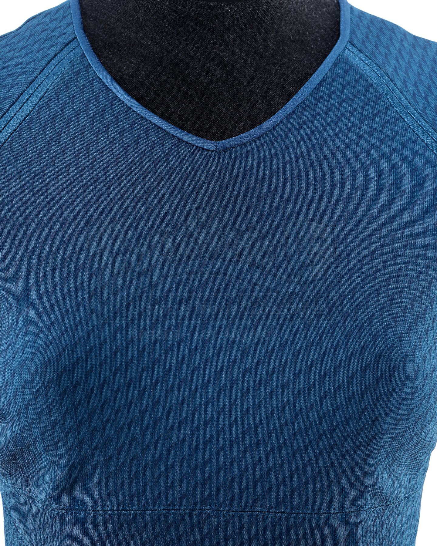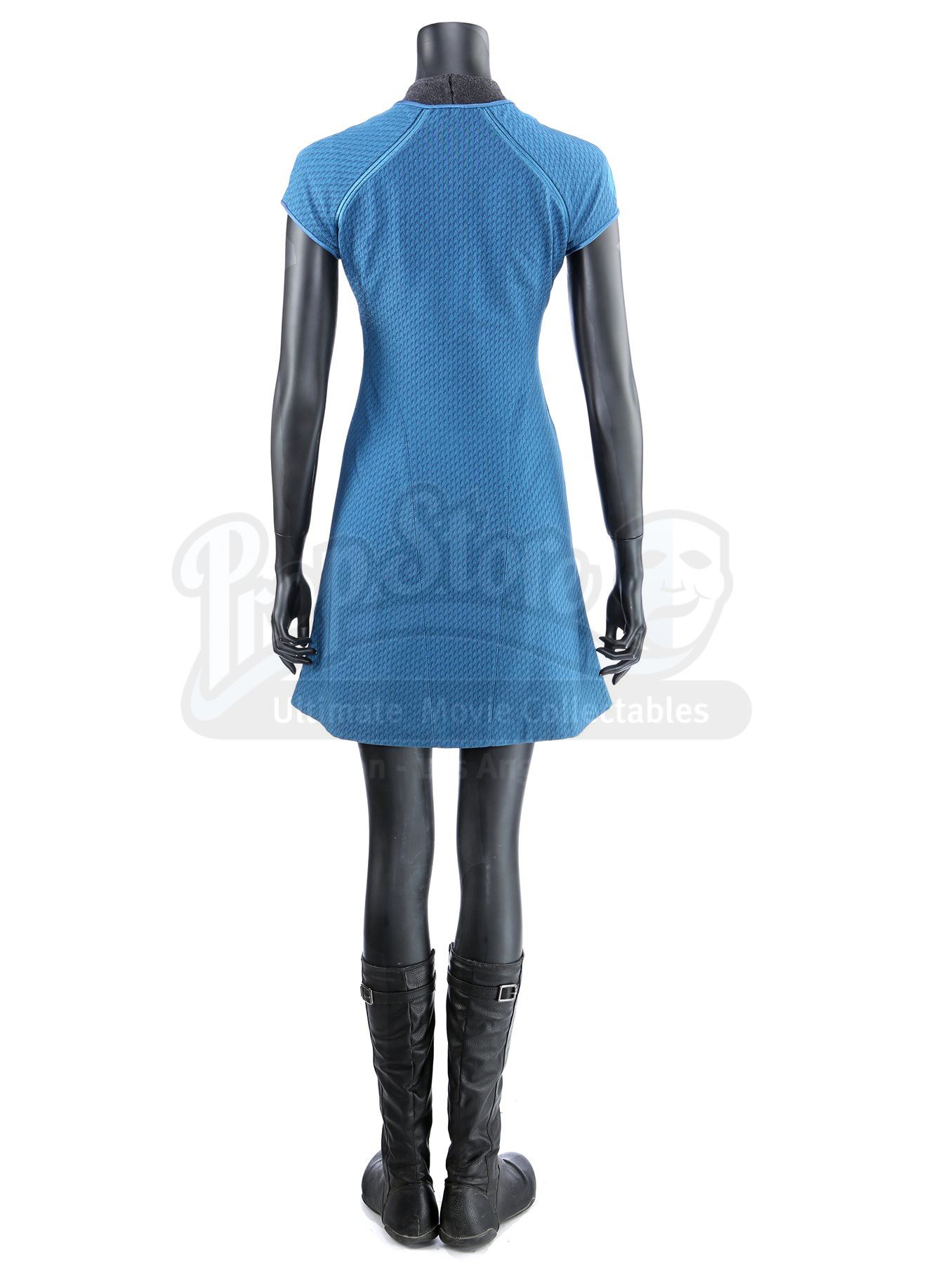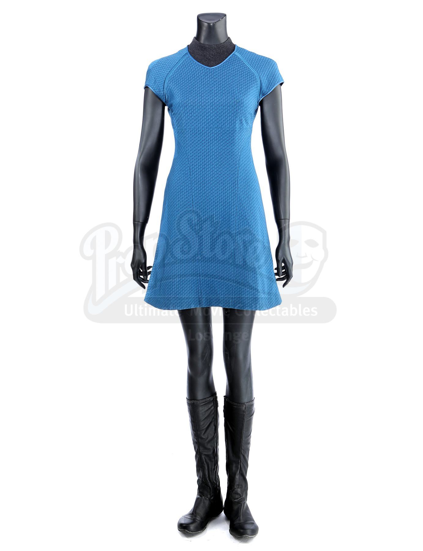 Made for the first film and reused in the sequel, the blue dress is made of Spandex, has piping around the collar and features a printed optical repeat Starfleet insignia pattern. The undershirt consists of a grey polyester turtleneck leotard. Also included is a pair of black knee-length leather boots with rubber soles.