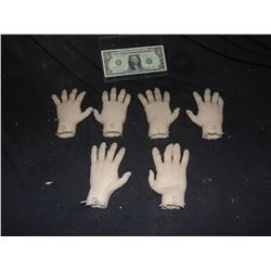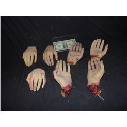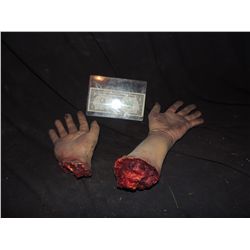 MATCHED PAIR OF SEVERED HANDS WITH GORE AT STUMPS. EXCELLENT HALLOWEEN, HAUNT, OR INDY FILM PROPS!