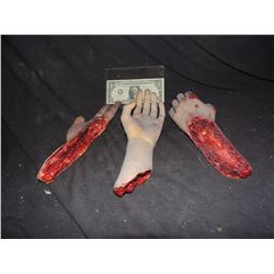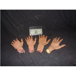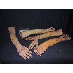 URETHANE SEVERED ARM WITH SPLIT OPEN HANDS & GORE AT STUMPS LOT OF 4. EXCELLENT HALLOWEEN, HAUNT, OR INDY FILM PROPS!