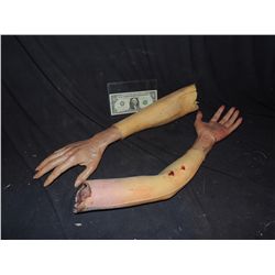MATCHED PAIR OF SEVERED ARMS WITH GORE AT STUMP. EXCELLENT HALLOWEEN, HAUNT, OR INDY FILM PROPS!