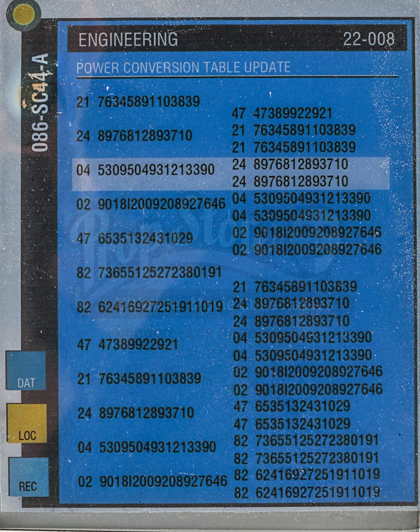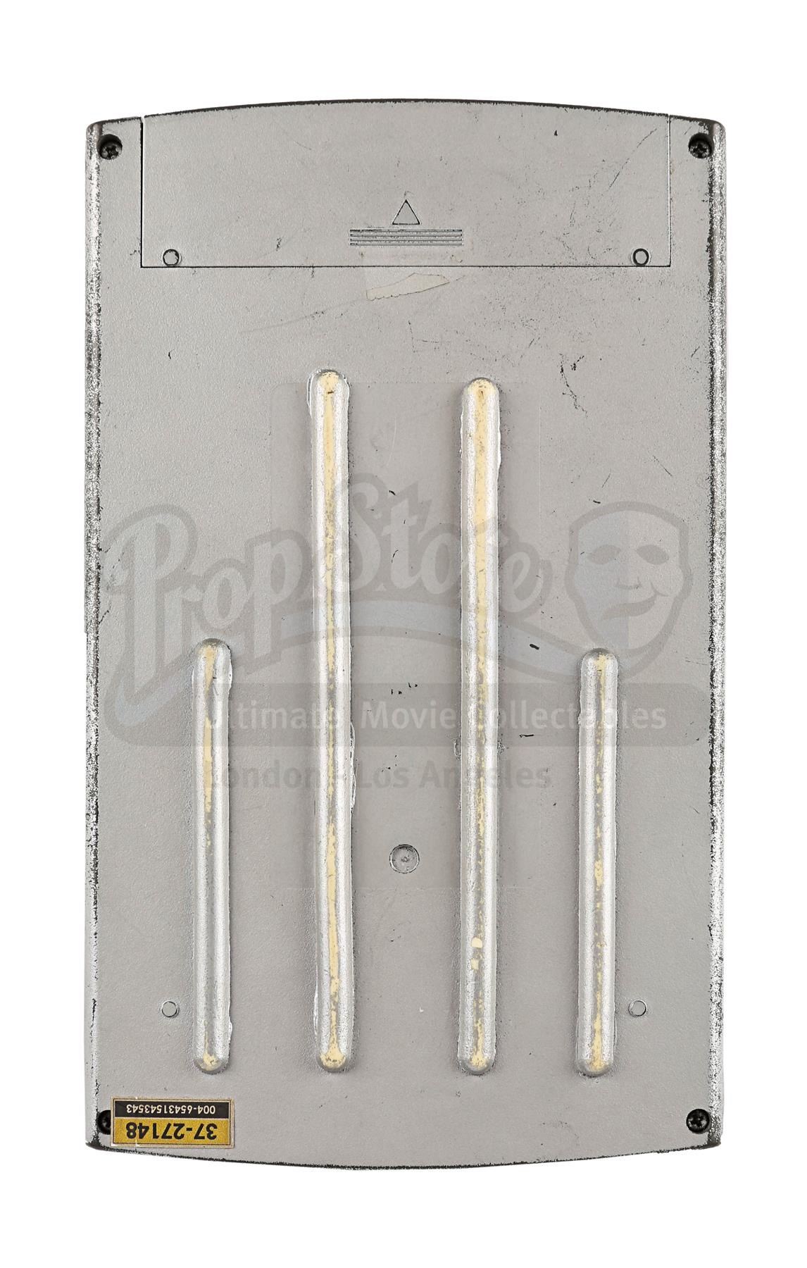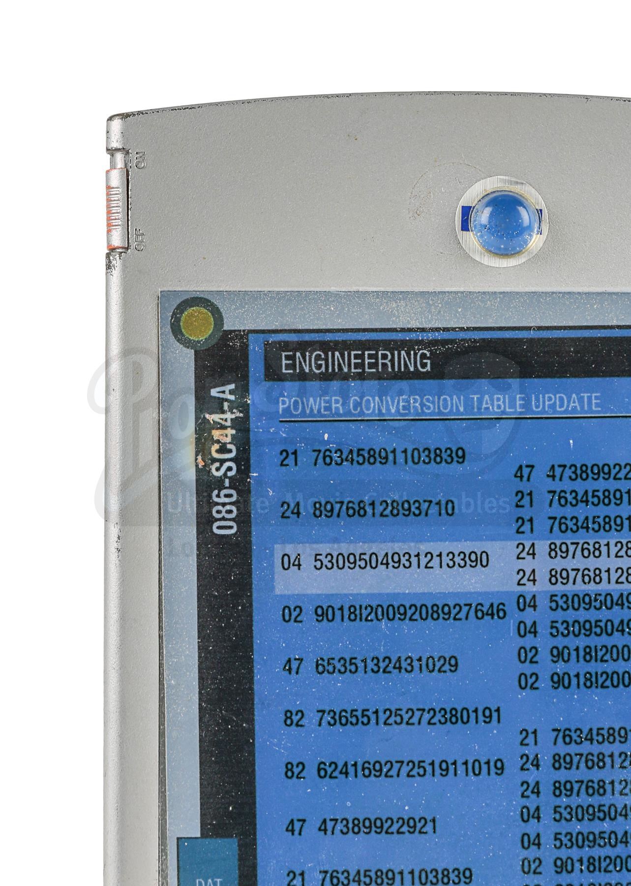 This PADD is made of plastic painted a metallic faux-silver. It has four resin ridges on the back and features a display screen application, which is adhered to a backlight and shows a Power Conversion Table Update. The PADD is powered by four AA batteries, which are housed in a compartment on the back. It has two rubber buttons at the bottom and a rubber bobble at the top for additional detailing. The piece has some wear from production use and age, including some scuffs and scratches, and areas where the paint has rubbed away, most notably on the back. The rubber bobble at the top has slipped from its previously more central position. Dimensions: 19 cm x 11.5 cm x 1.3 cm (7 1/2" x 4 1/2" x 1/2")