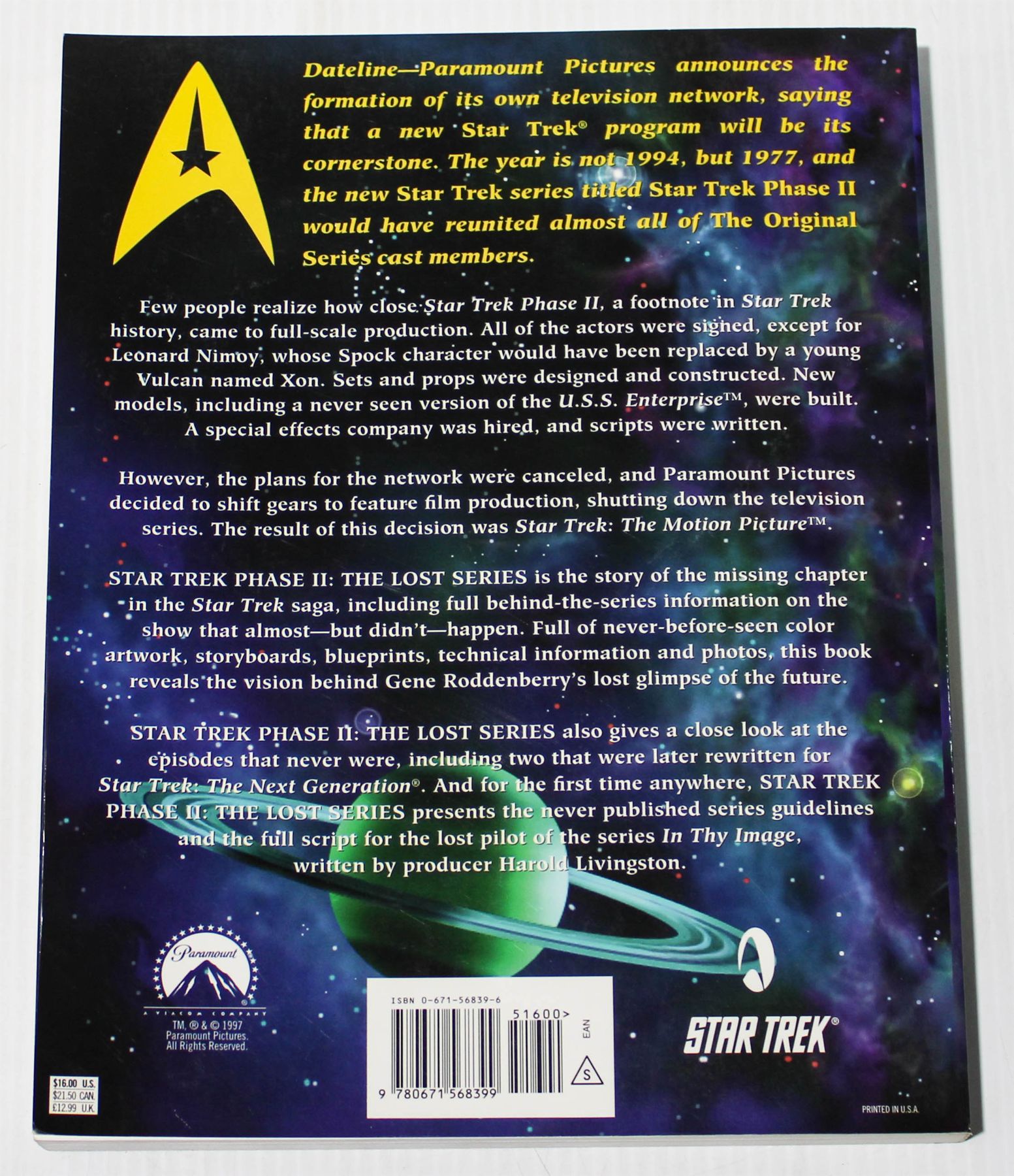 1997 - REFERENCE BOOK WHICH GIVES A DETAILED ANALYSIS OF THE DEVELOPMENT AND EARLY DAYS OF THE ABORTIVE SPIN-OFF, STAR TREK: PHASE II, FEATURING CONCEPT ART, SET PHOTOS, AND TWO COMPLETE SCRIPTS FROM THE SERIES, "IN THY IMAGE" AND "THE CHILD", MARKED $21.50 CANADIAN PURCHASE PRICE ON BACK COVER.
