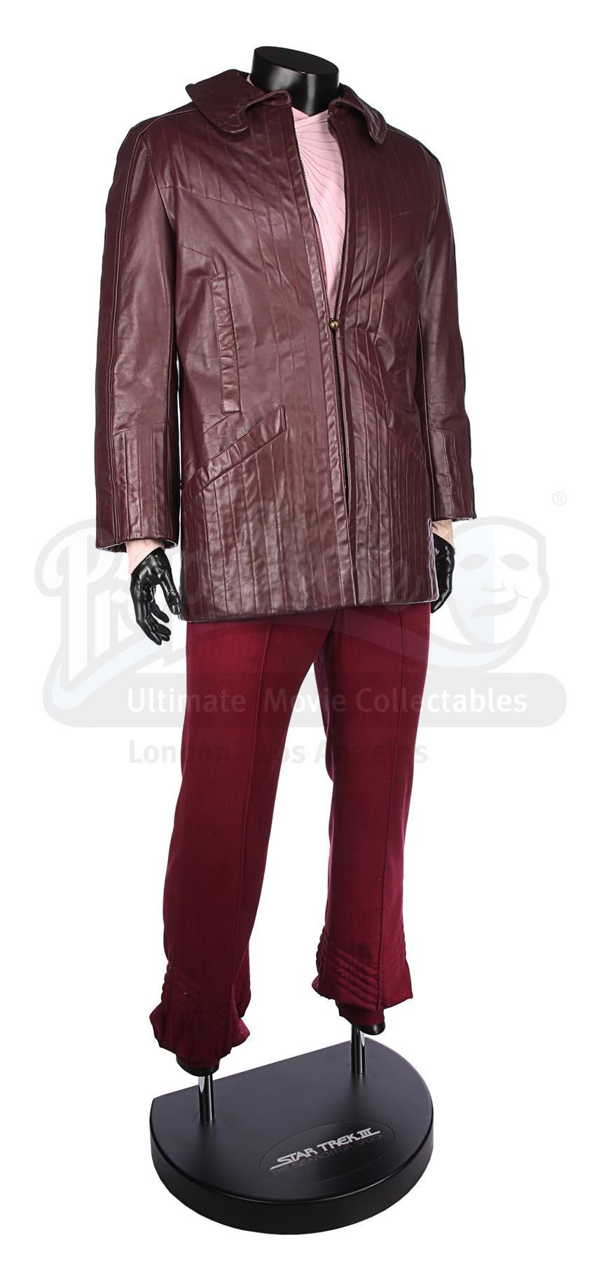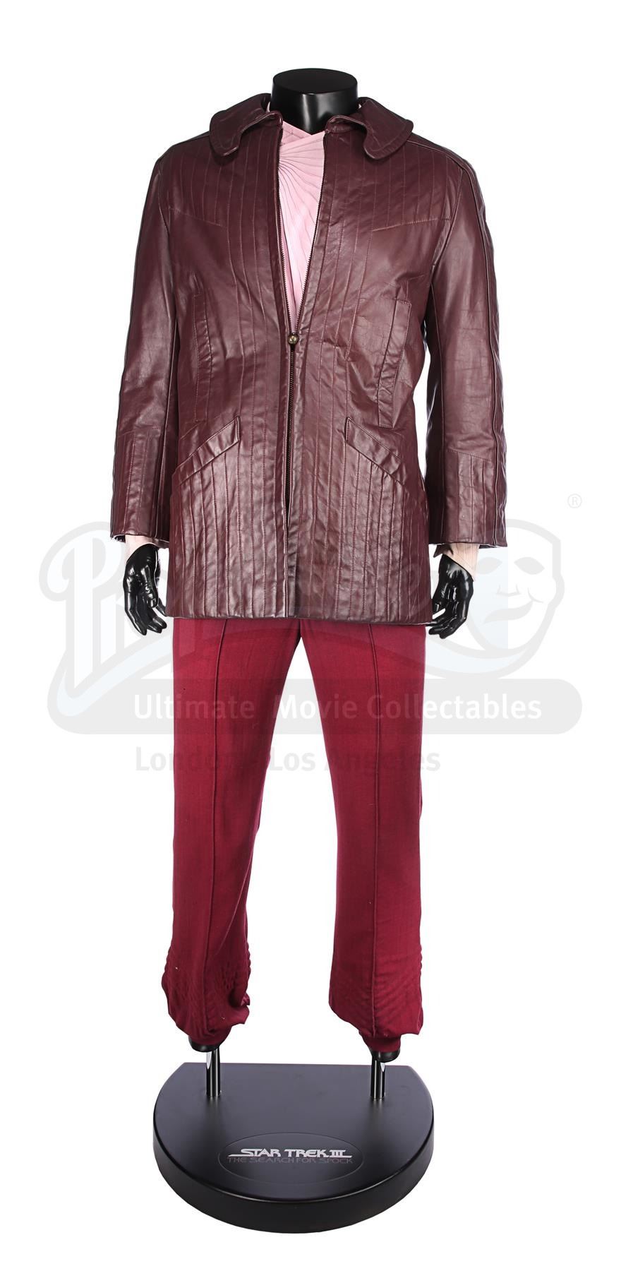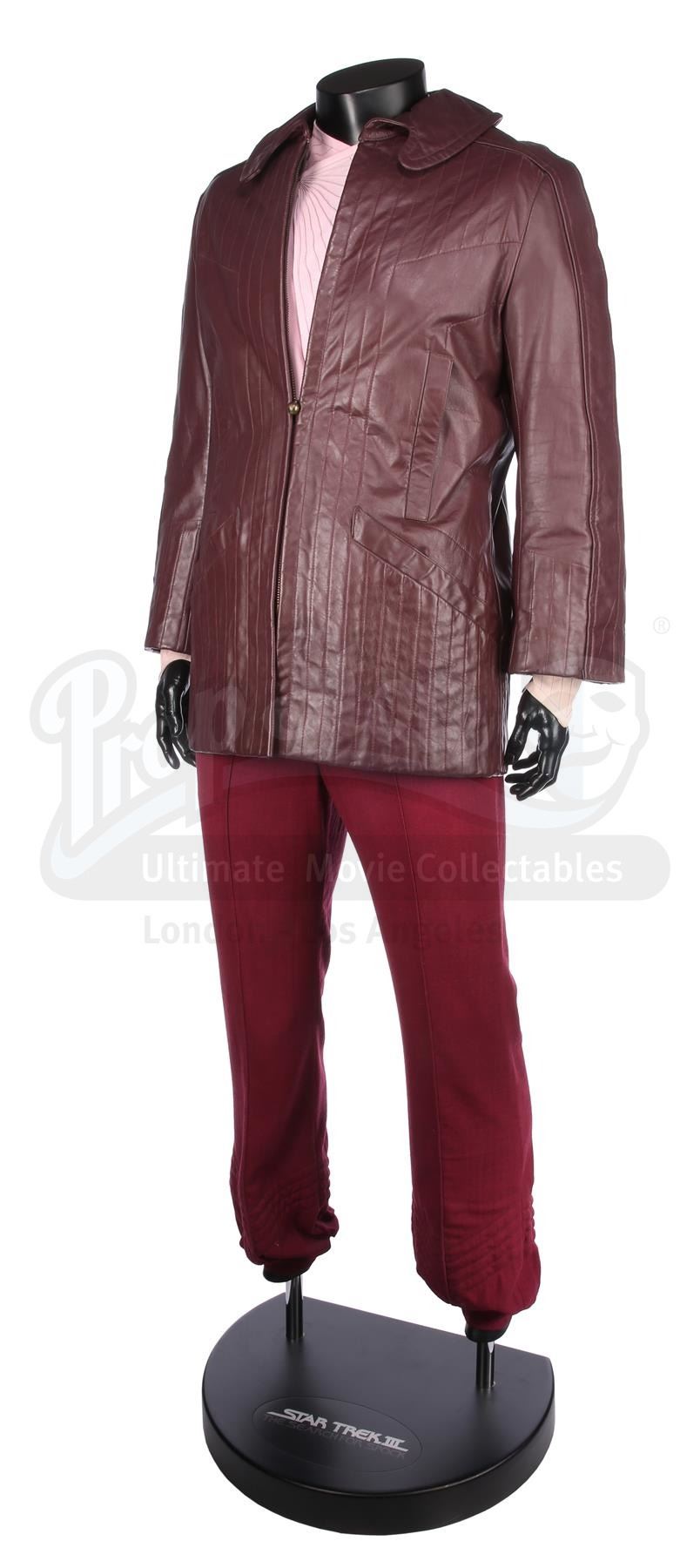 This costume was originally purchased at the Christie's "40 Years of Star Trek" auction, held in New York City in October 2006, and the lot retains all of its original auction tags. There are small holes to the upper and lower sleeves on the burgundy jacket, and on the lower leg section of the trousers, from production use and storage. Dimensions (displayed): 38 cm x 70 cm x 180 cm (15" x 27 1/2" x 71")