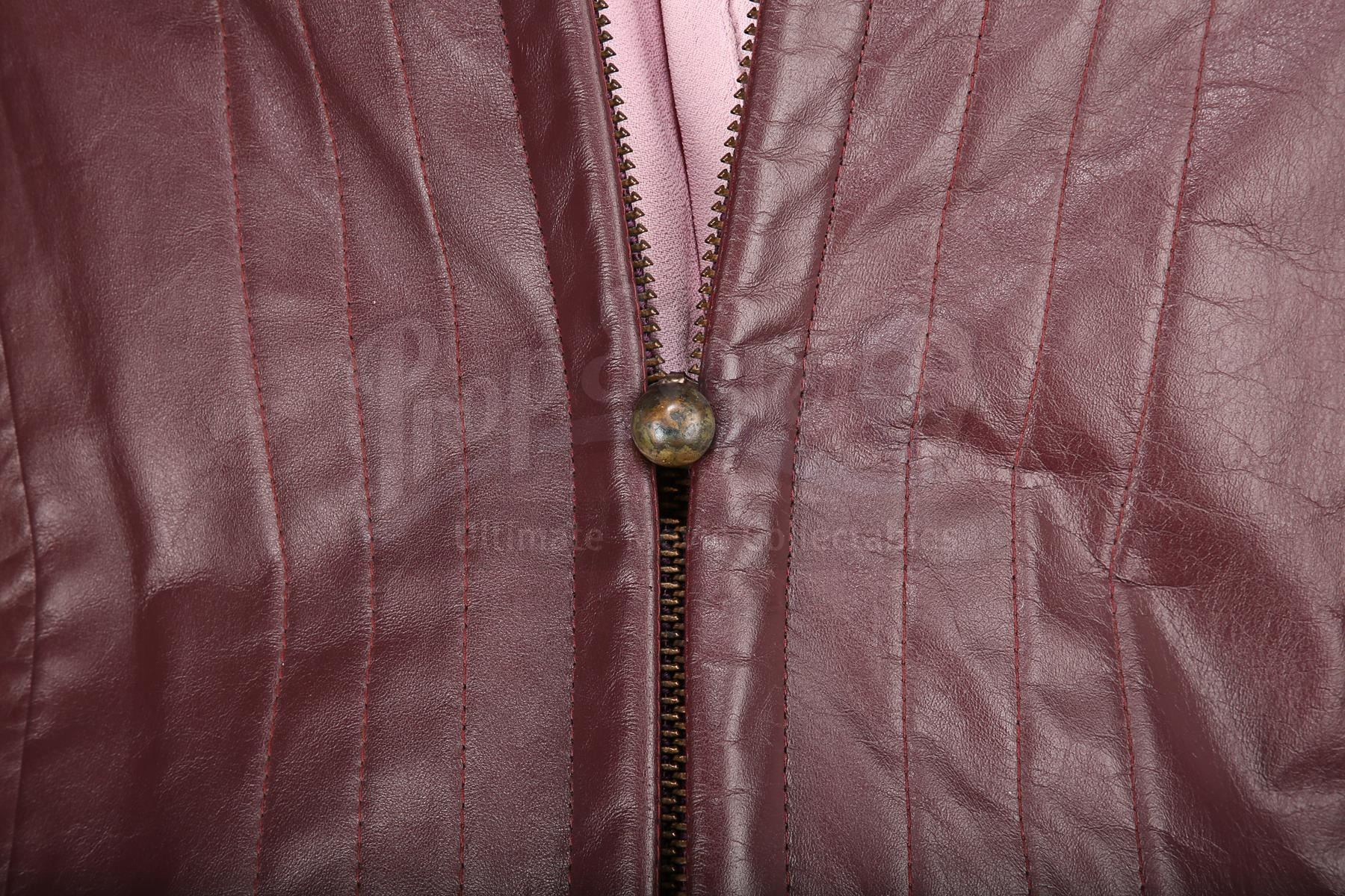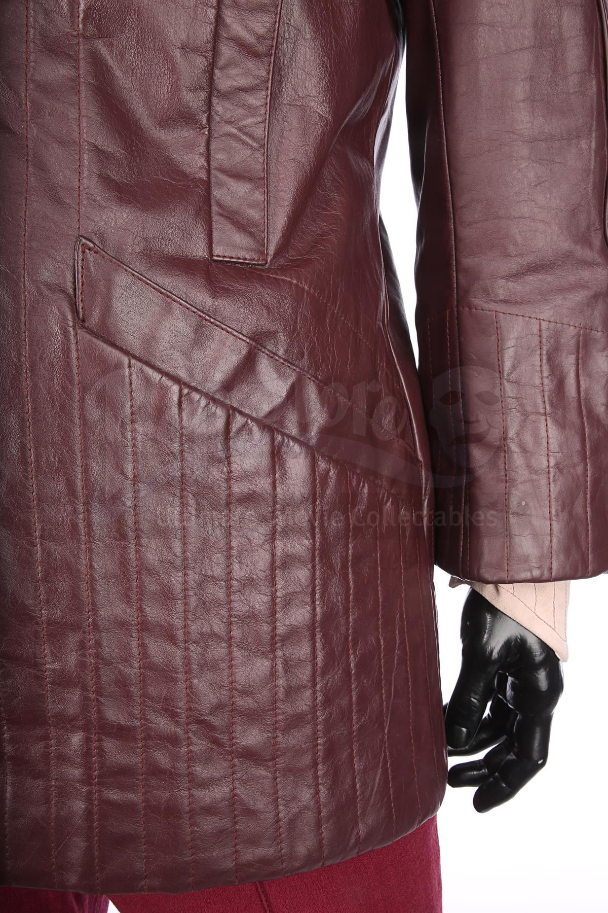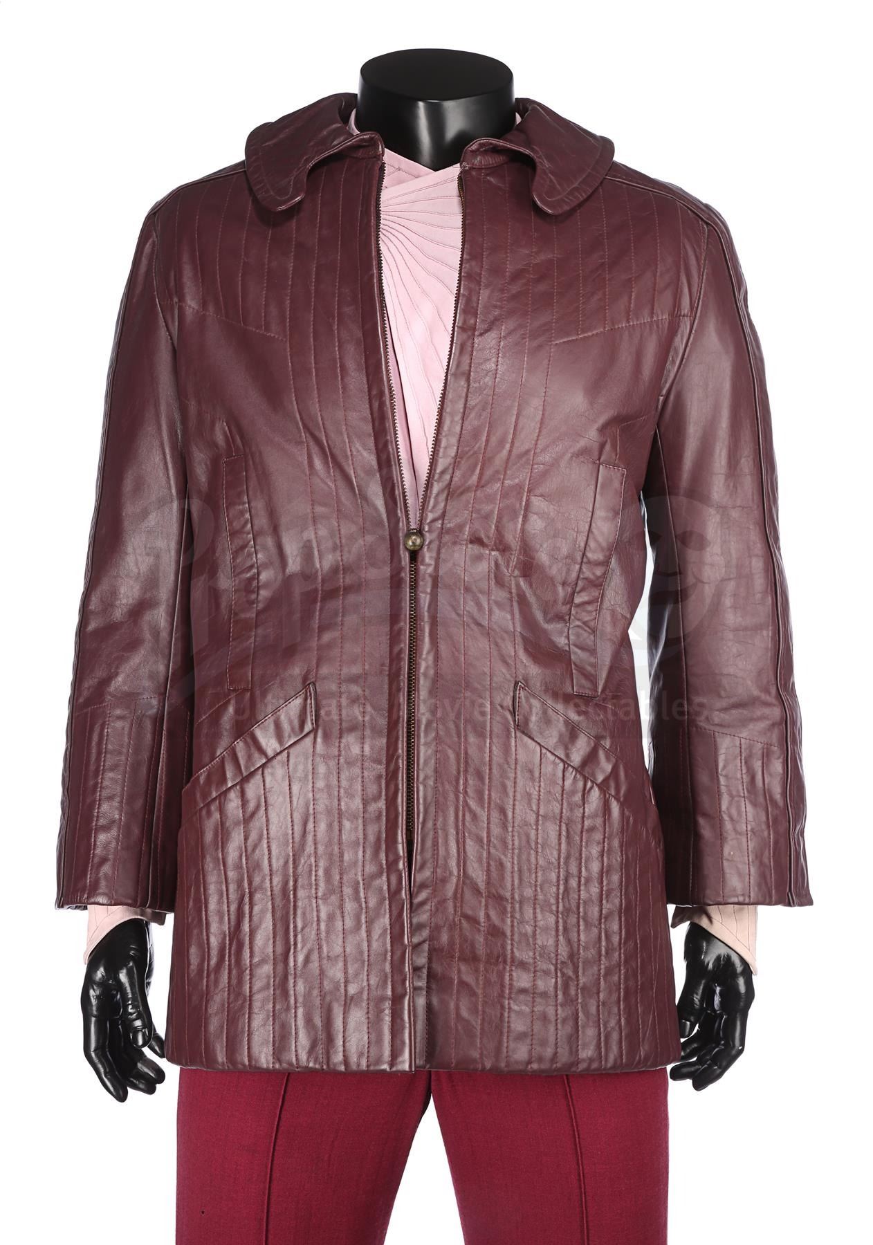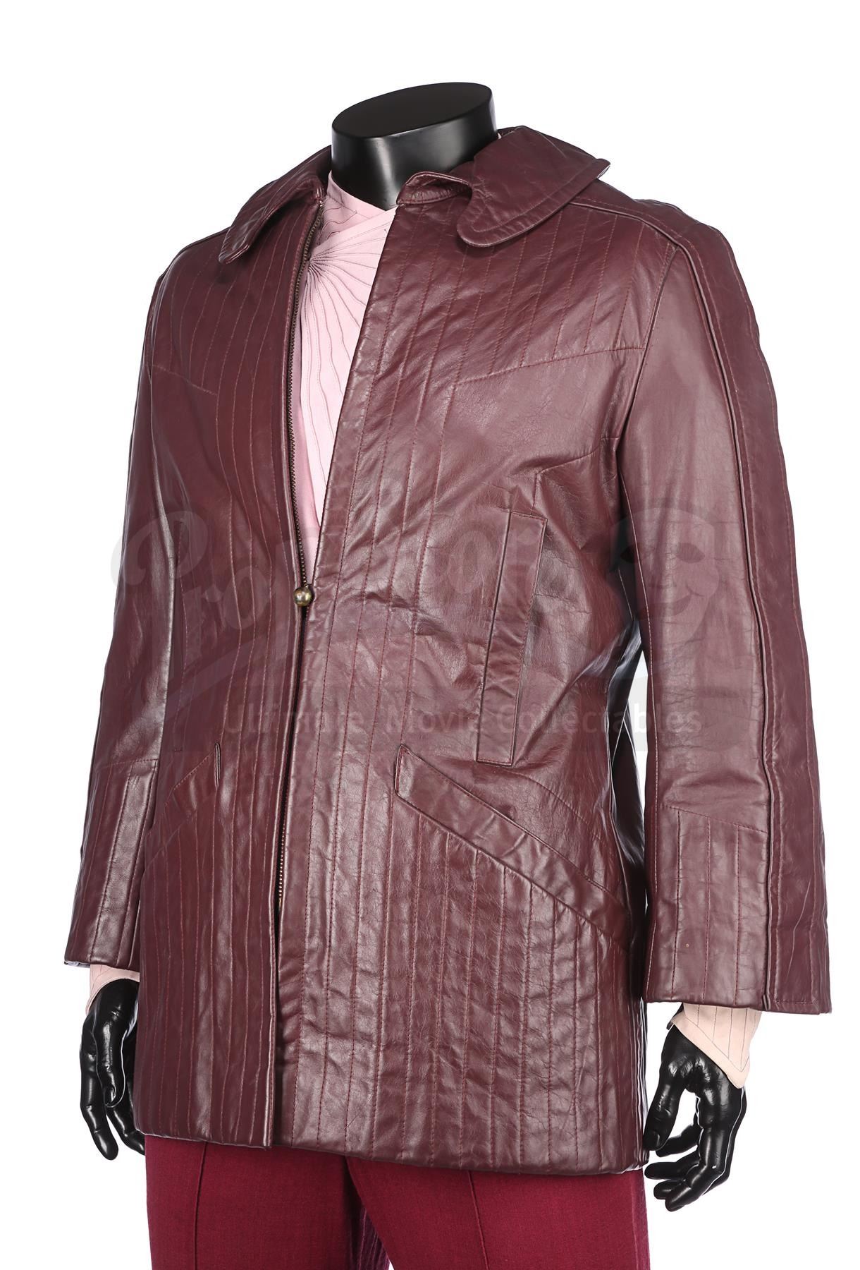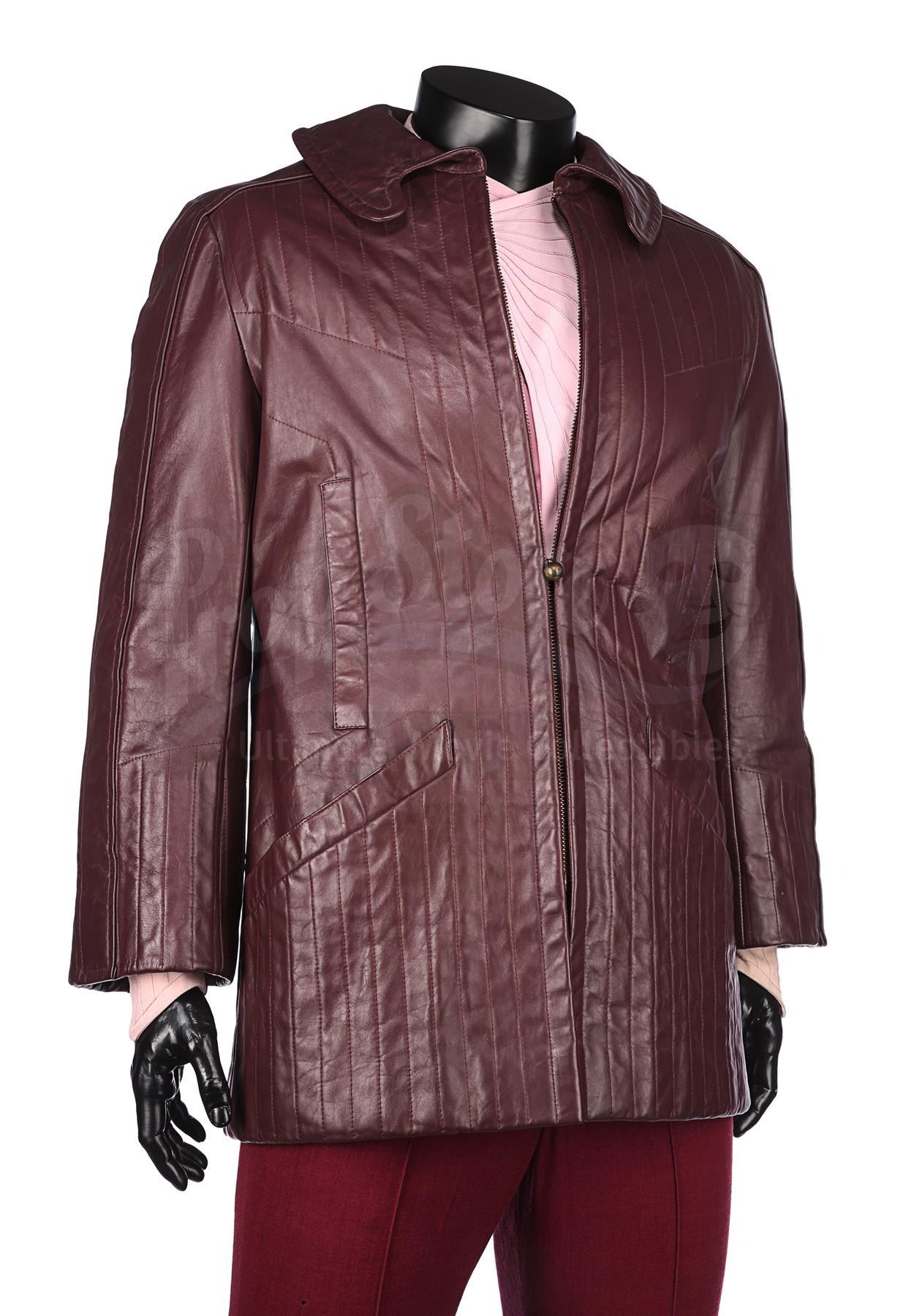 The outfit consists of a dark burgundy imitation leather overcoat, with three pockets and zip closure; a red jacket and pair of trousers, both of which are trimmed with black leather; a pink shirt with a patterned front; and a black leather belt with a metal buckle. The jacket, trousers and shirt include Western Costume labels with the typed name "William Shatner". The costume comes on a custom-built display stand which features the title of the film.