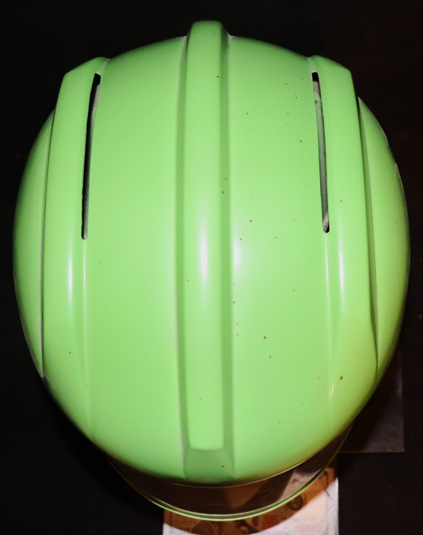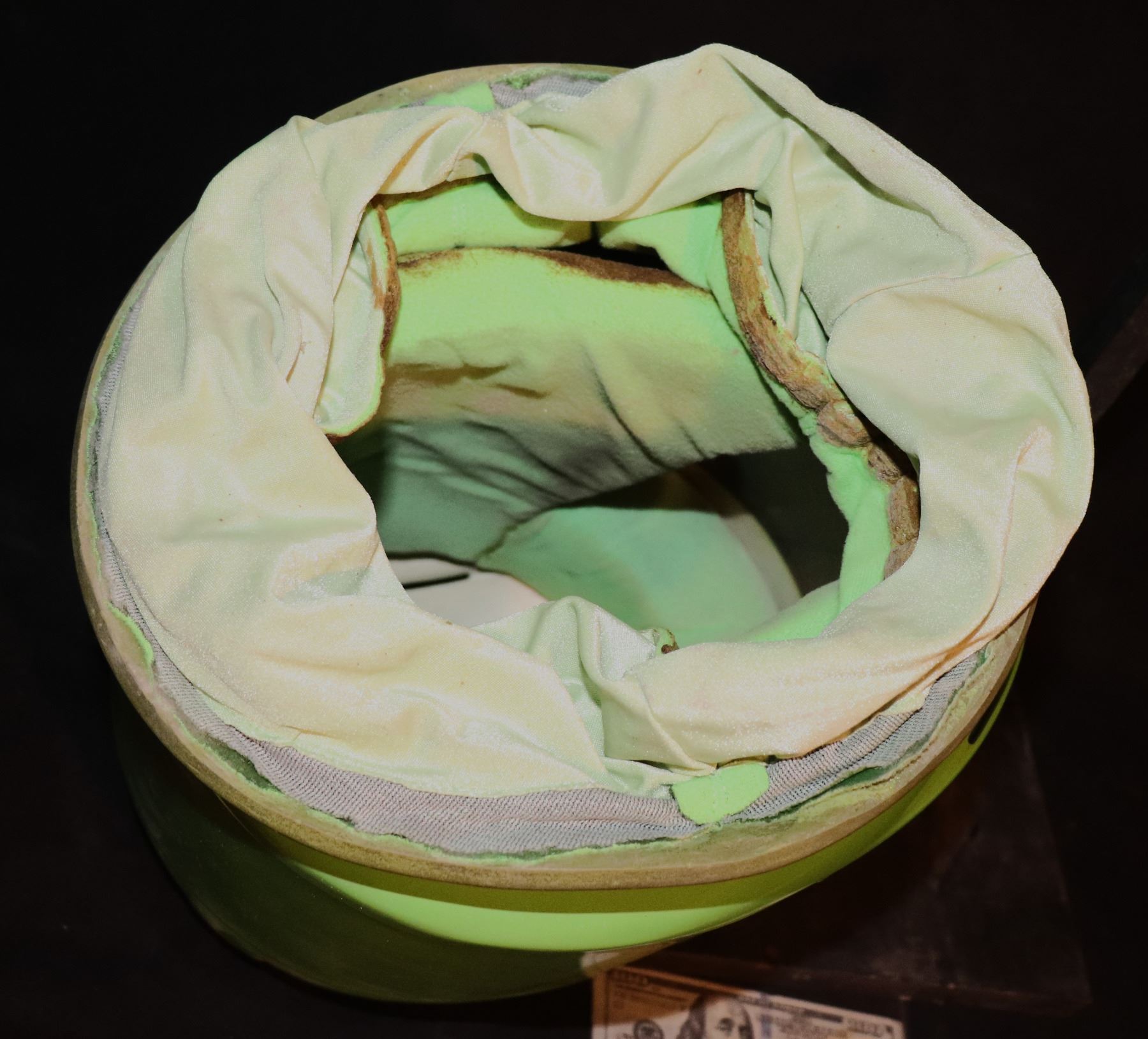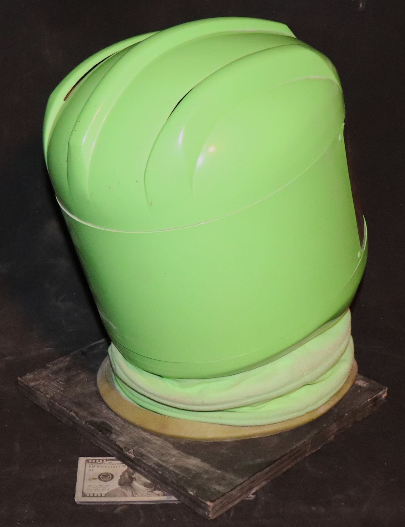 This is the green screen chroma key stealth suit helmet seen in the beginning of STAR TREK INSURRECTION! The glue in the padding has darkened, but inside you can see where Brent Spiner's make up smudged on the inner padding! The red glow in the film is CGI. Though there were actual red suits, this is Chroma Key because of how it is removed from DATA.