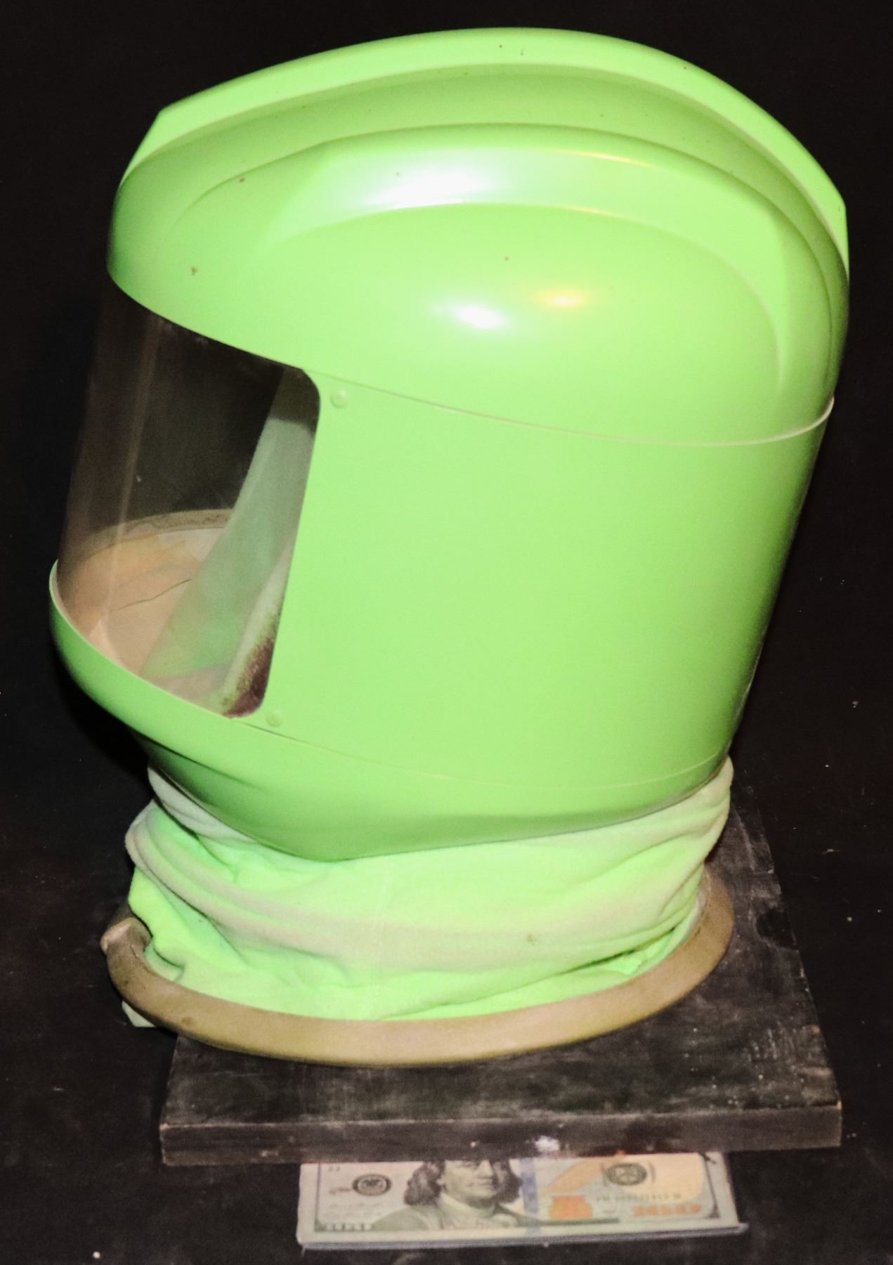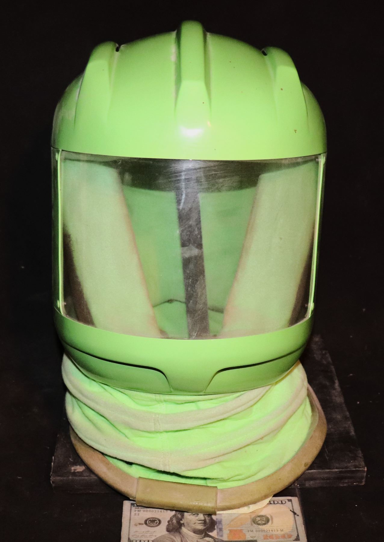 This is the green screen chroma key stealth suit helmet seen in the beginning of STAR TREK INSURRECTION! The glue in the padding has darkened, but inside you can see where Brent Spiner's make up smudged on the inner padding! The red glow in the film is CGI. Though there were actual red suits, this is Chroma Key because of how it is removed from DATA.