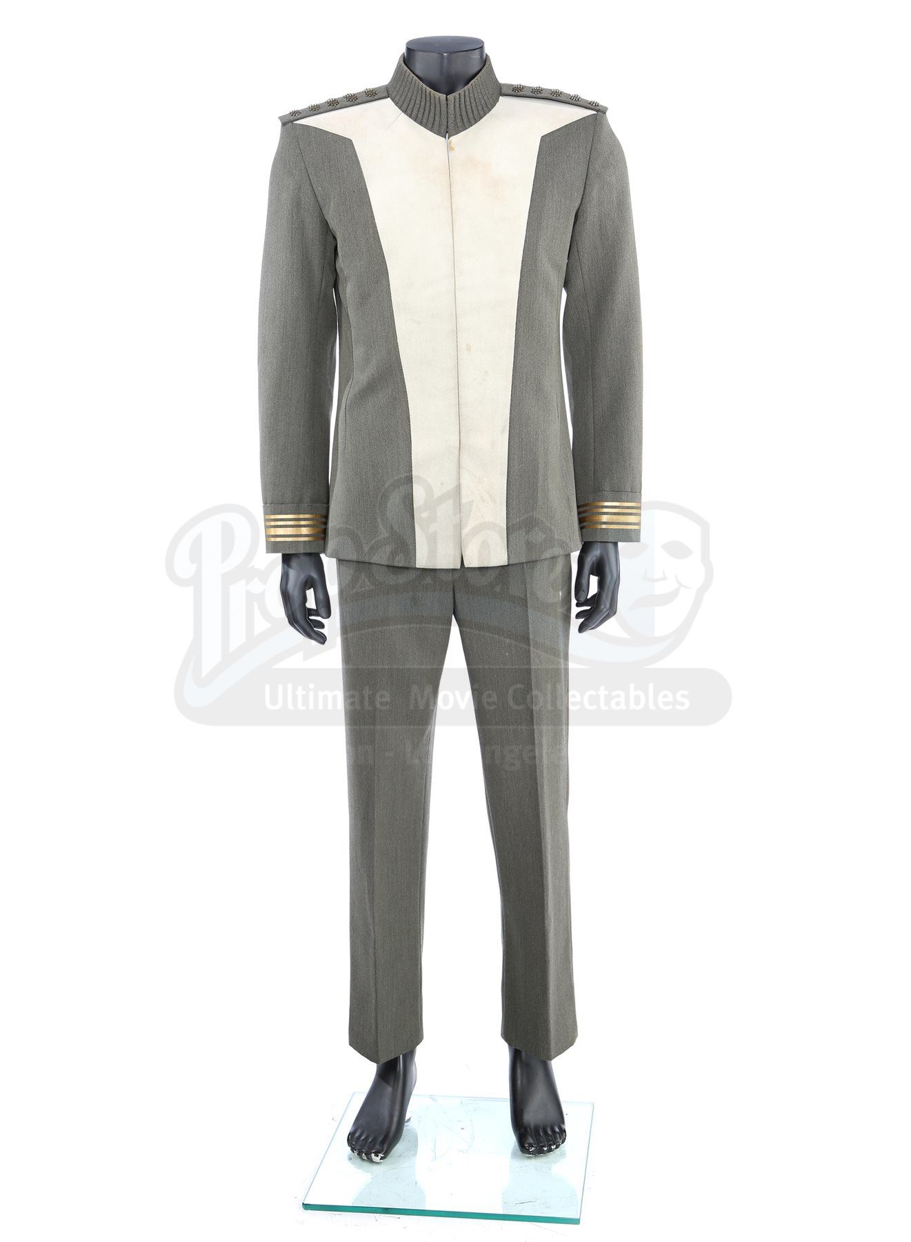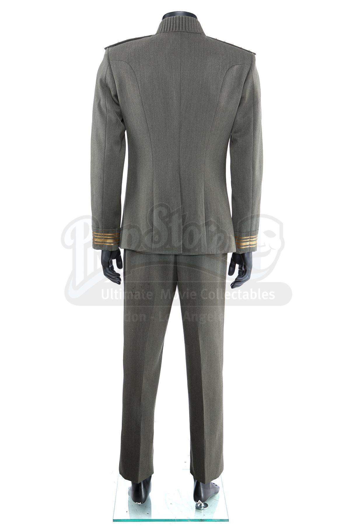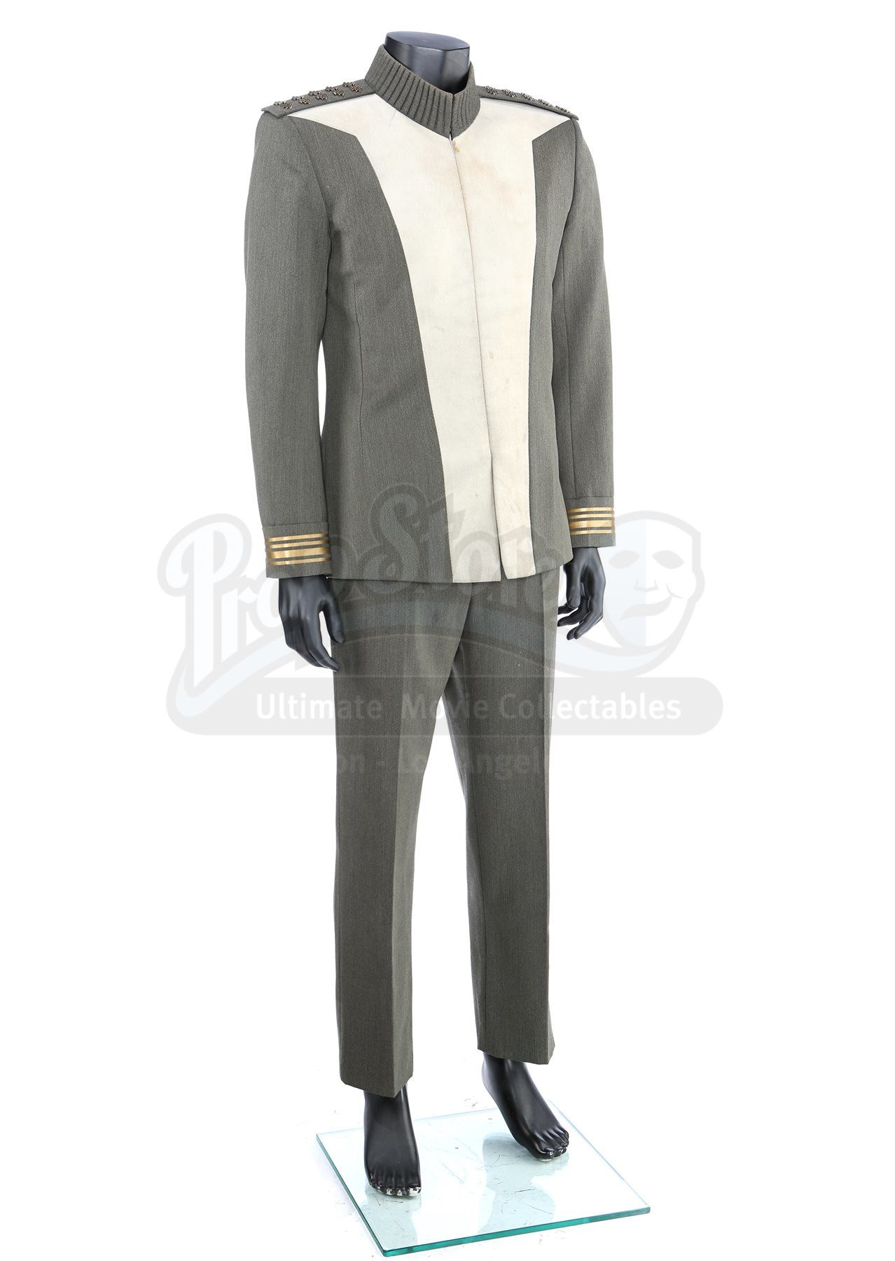 Admiral Marcus' distressed stunt dress uniform from Star Trek Into Darkness. Marcus wore his dress uniform in the conference room when Starfleet headquarters was attacked. The costume includes a jacket (approximate size 38), pants (approximate size 32) with suspenders, undershirt (large), and a pair of boots (marked U.S. size 10M). The olive green and khaki jacket is made of wool twill, has a high ribbed collar, epaulets on each shoulder and four gold bands on the wrists. The olive green pants are also made of wool and include a pair of black elastic suspenders. The undershirt consists of a black Spandex sport shirt. Also included is a pair of black leather ankle boots with rubber soles. The boots are the proper type for the costume; they were used in the production but not specifically by this character.The costume features hand-written wardrobe labels with the jacket, pants and shoes marked as "MARCUS DBL" as well as the stunt actor's name. Also included are wardrobe tags with hand-written notes about the costume. Estimate: $1500 - 2500*Estimated sale price; sold without reserve.