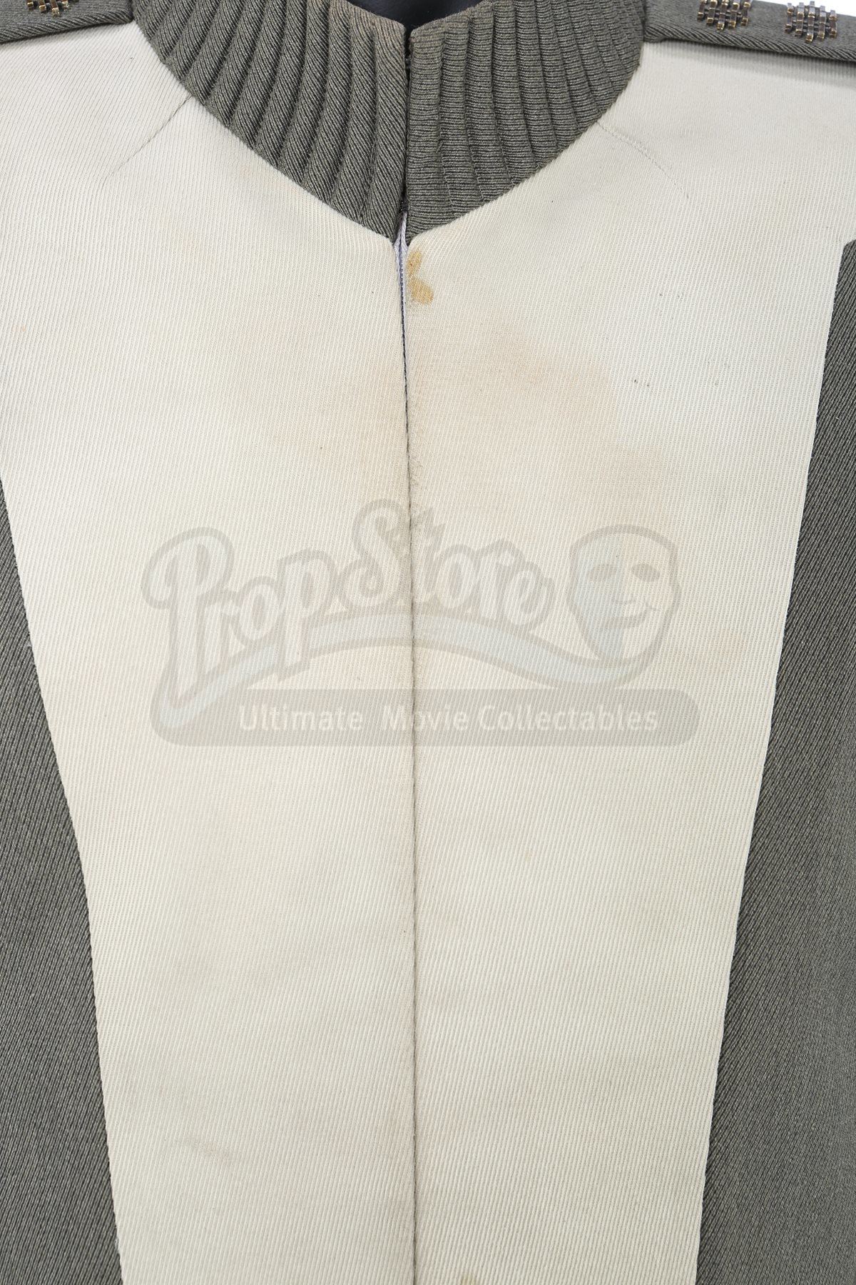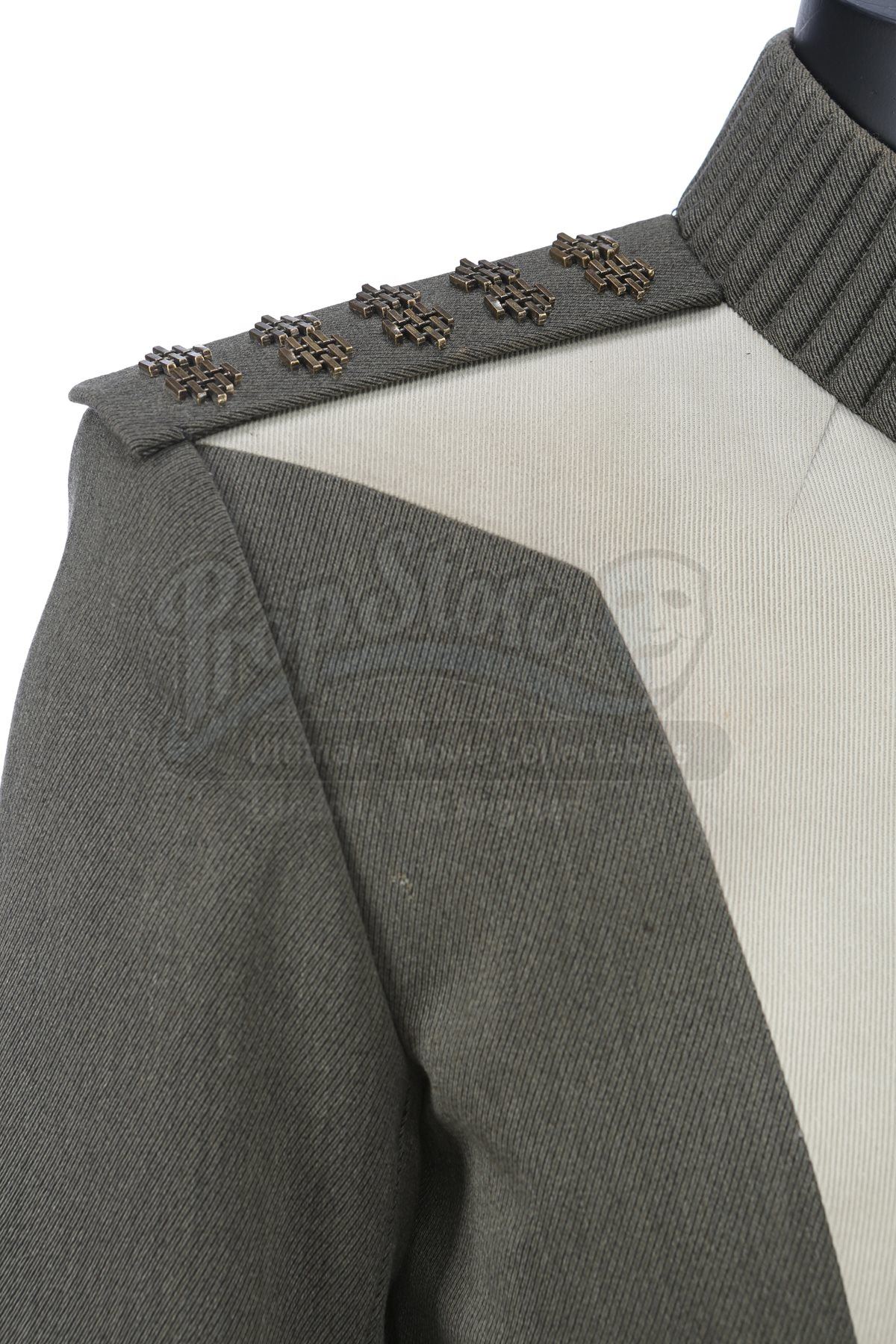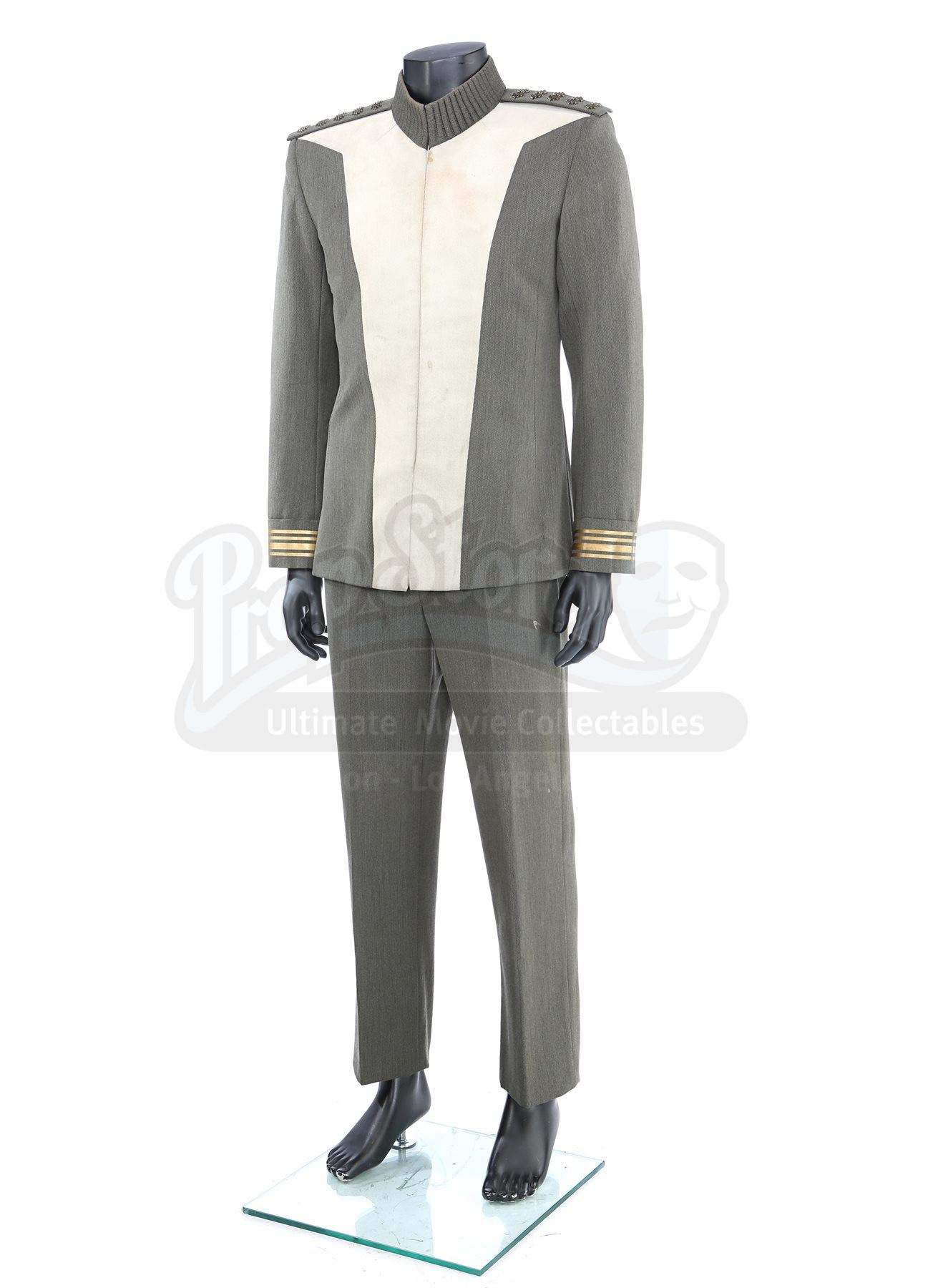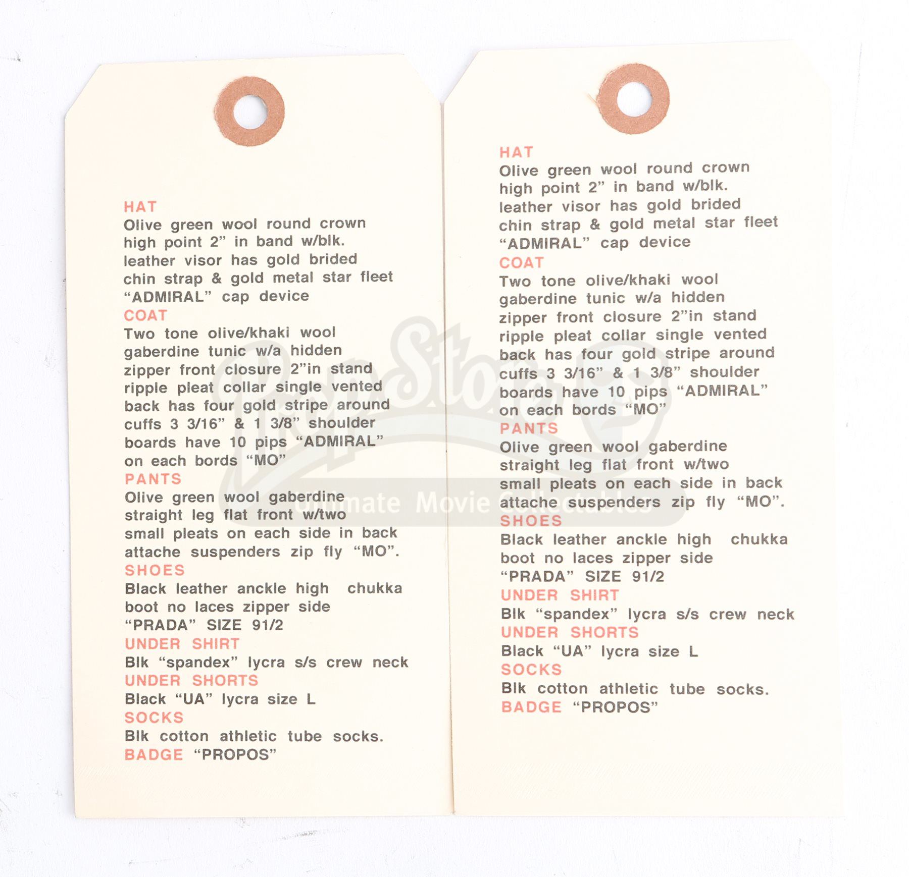Admiral Marcus' distressed stunt dress uniform from Star Trek Into Darkness. Marcus wore his dress uniform in the conference room when Starfleet headquarters was attacked. The costume includes a jacket (approximate size 38), pants (approximate size 32) with suspenders, undershirt (large), and a pair of boots (marked U.S. size 10M). The olive green and khaki jacket is made of wool twill, has a high ribbed collar, epaulets on each shoulder and four gold bands on the wrists. The olive green pants are also made of wool and include a pair of black elastic suspenders. The undershirt consists of a black Spandex sport shirt. Also included is a pair of black leather ankle boots with rubber soles. The boots are the proper type for the costume; they were used in the production but not specifically by this character.The costume features hand-written wardrobe labels with the jacket, pants and shoes marked as "MARCUS DBL" as well as the stunt actor's name. Also included are wardrobe tags with hand-written notes about the costume. Estimate: $1500 - 2500*Estimated sale price; sold without reserve.
