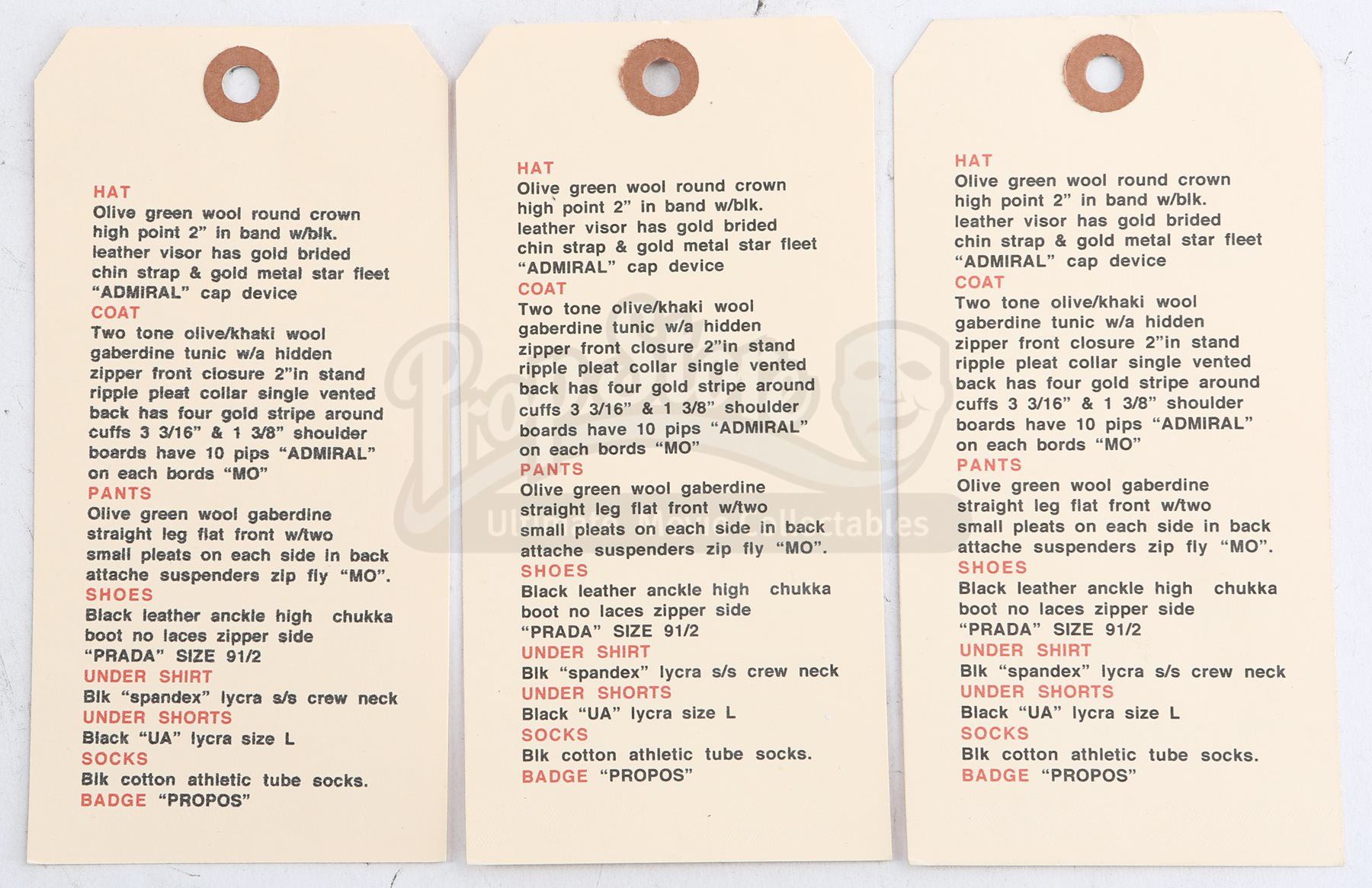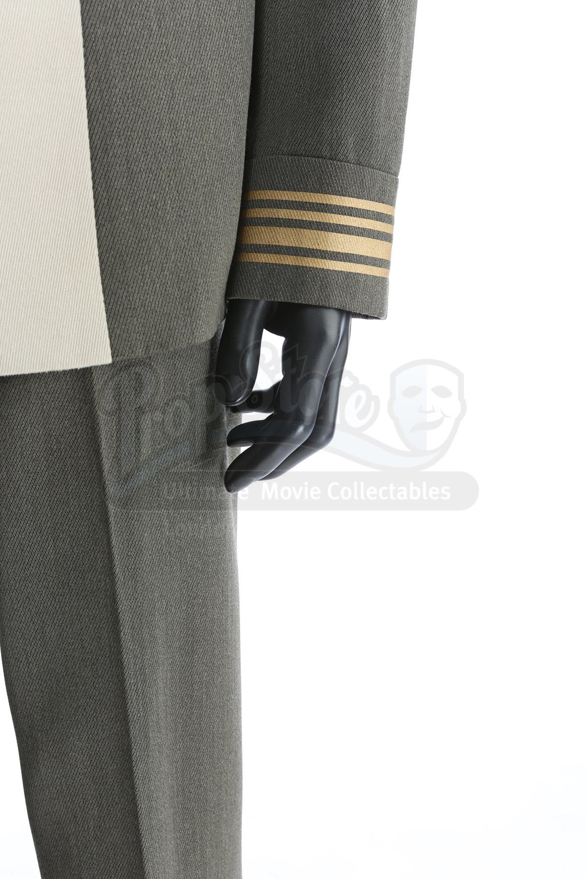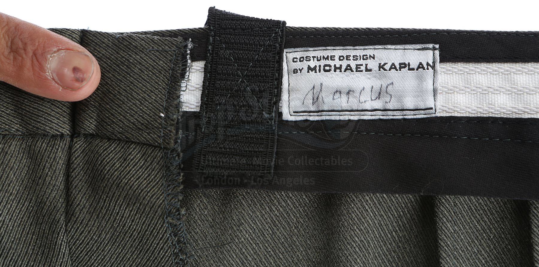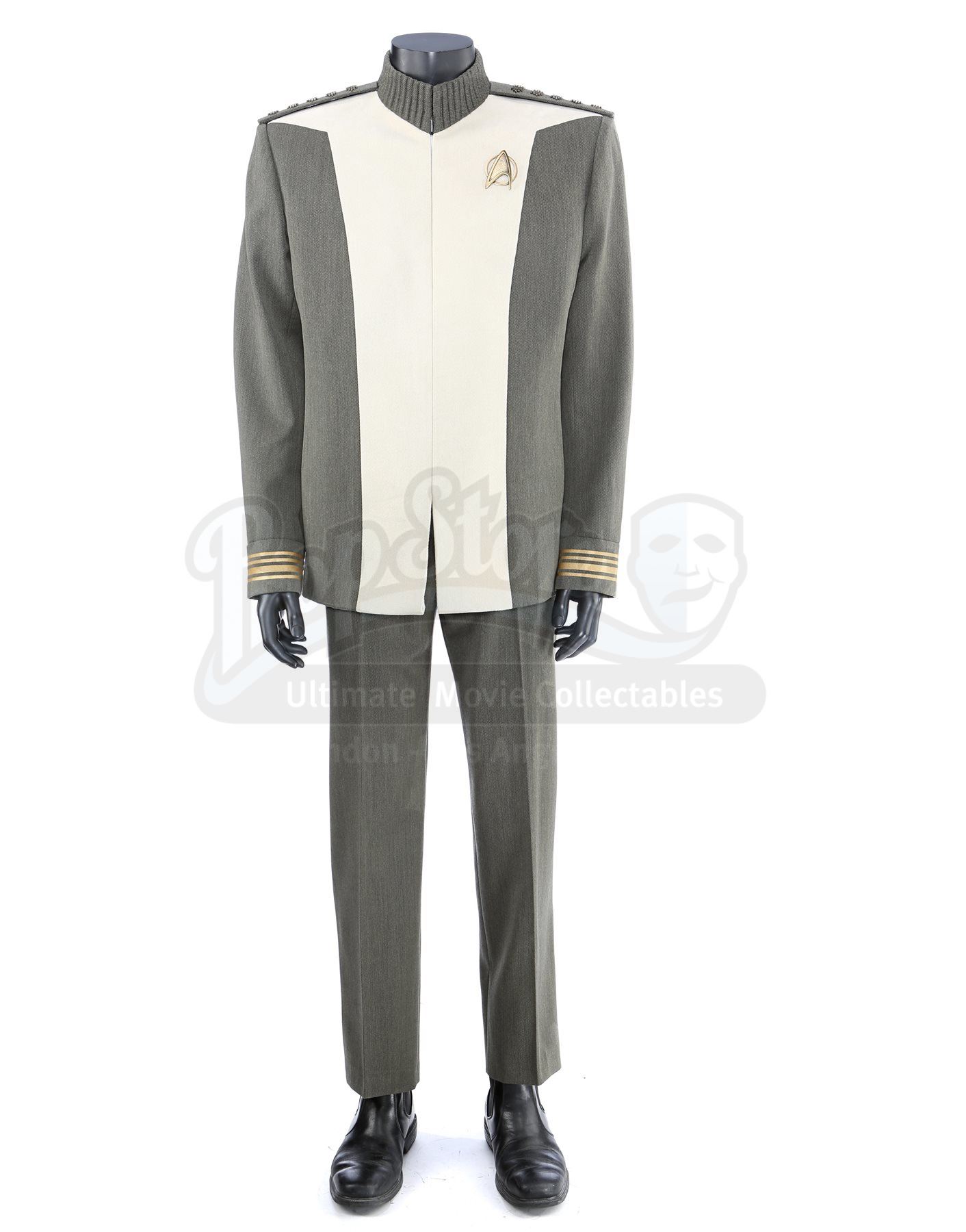 Admiral Marcus' dress uniform from Star Trek Into Darkness. Marcus wore his dress uniform in the conference room when Starfleet headquarters was attacked. The costume consists of a jacket (approximate size 42), pants (approximate size 33) with suspenders, and a pair of boots (marked U.S. size 10M).The olive green and khaki jacket is made of wool twill, has a high ribbed collar, epaulets on each shoulder, four gold bands on the wrists and a goldtone Starfleet pin on the left breast. The olive green pants are also made of wool twill and include a pair of black elastic suspenders. Also included is a pair of black leather ankle boots with rubber soles. The costume features hand-written wardrobe labels with the jacket and pants marked as "Marcus". Also included are wardrobe tags included with hand-written notes about the costume. Estimate: $3000 - 5000*Estimated sale price; sold without reserve.