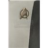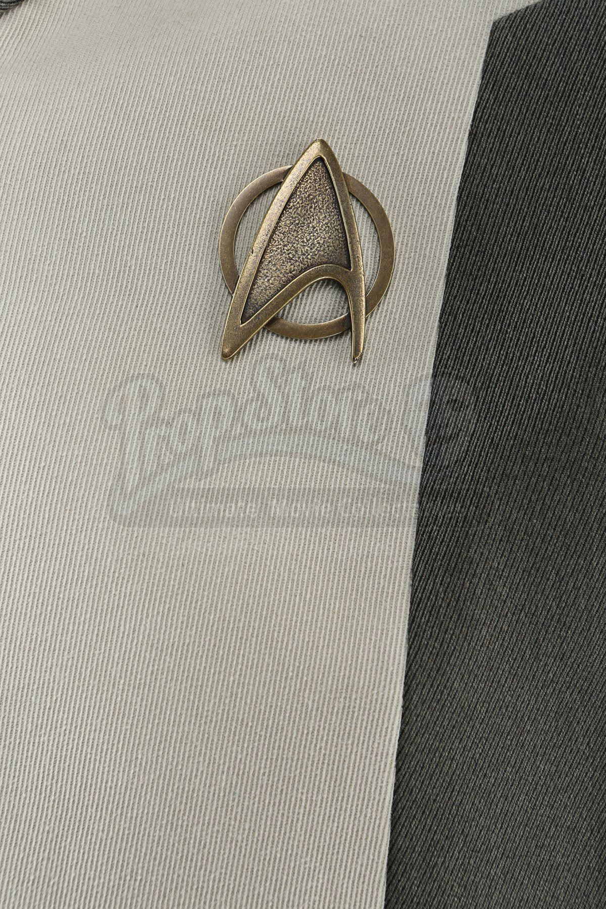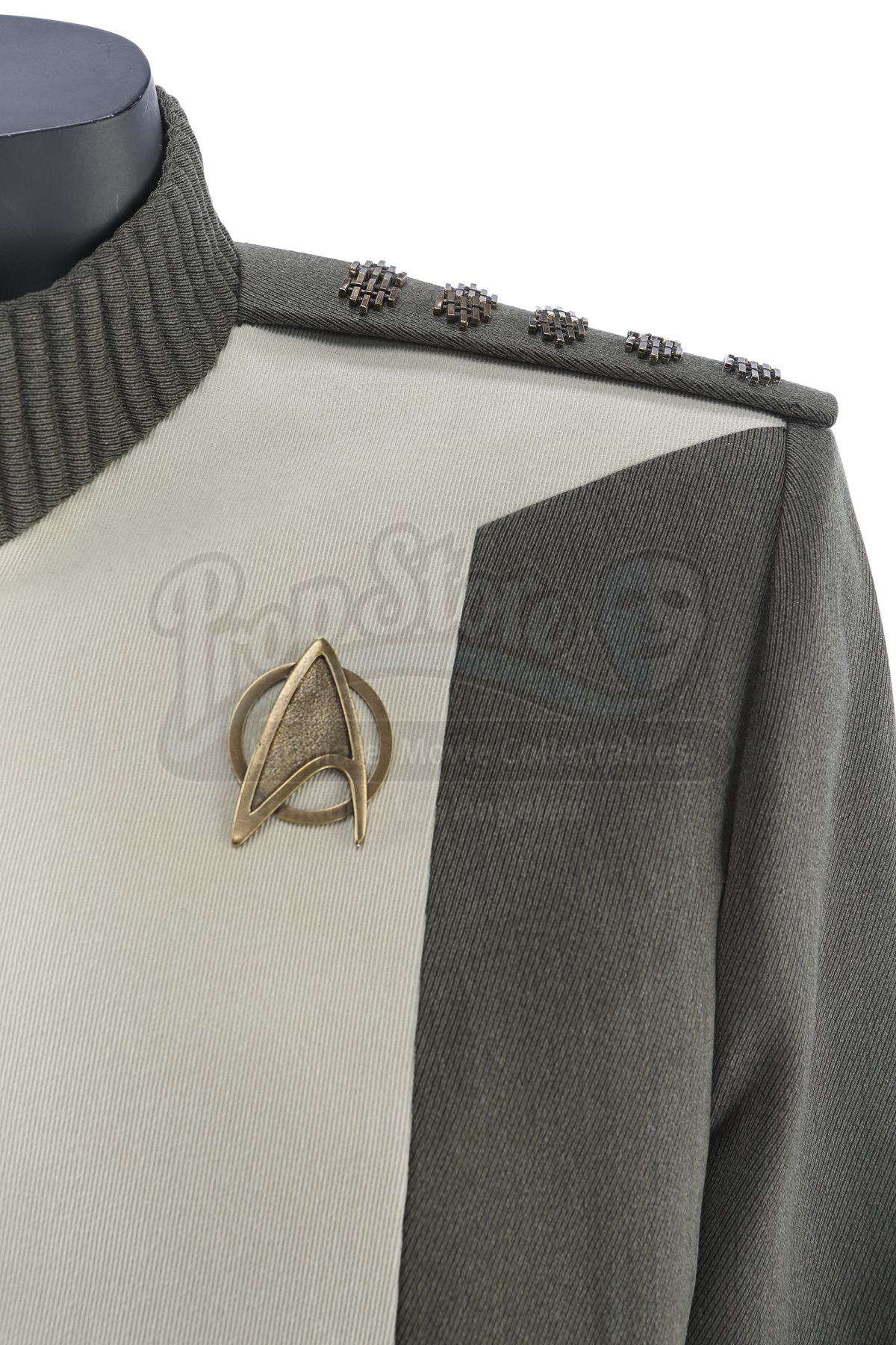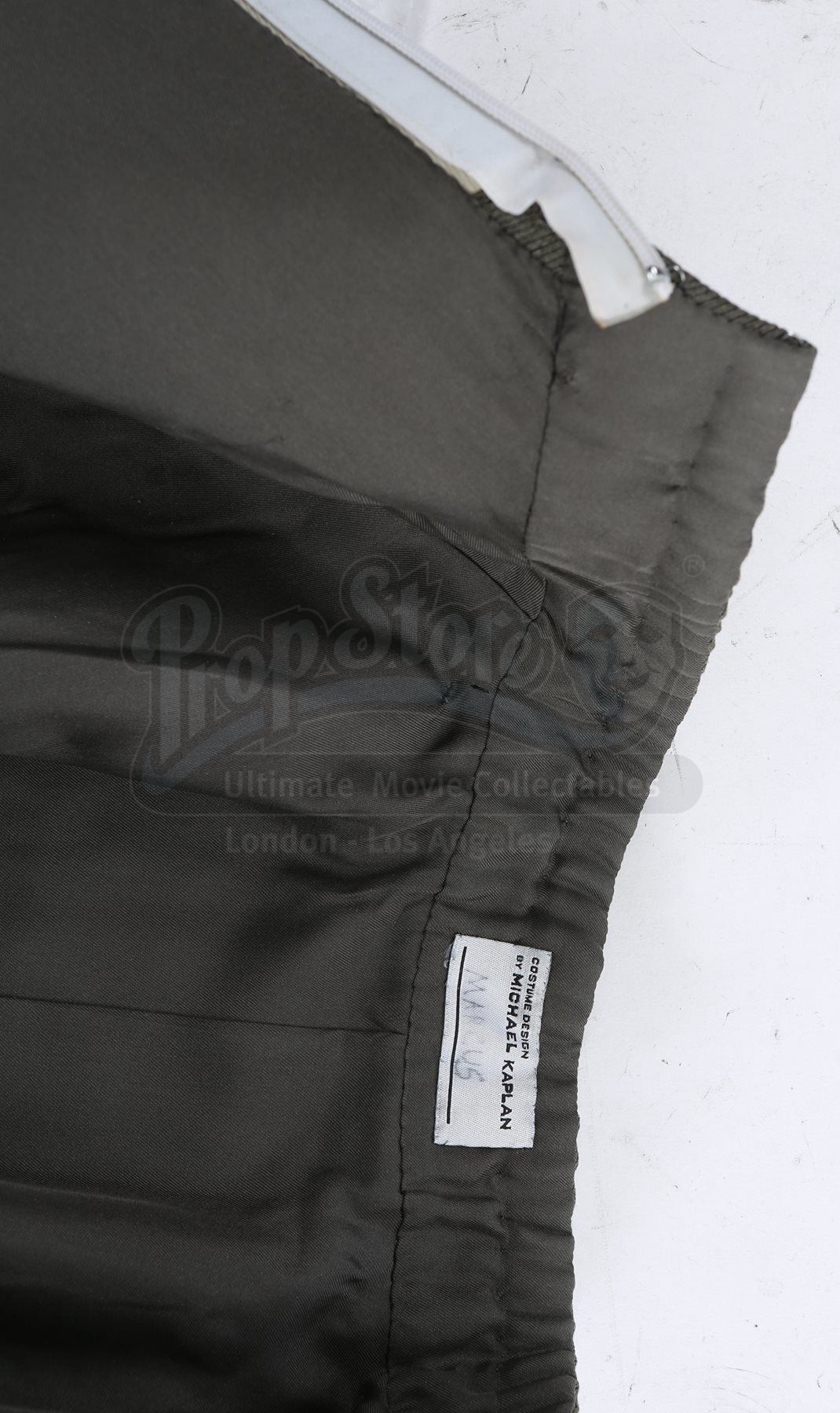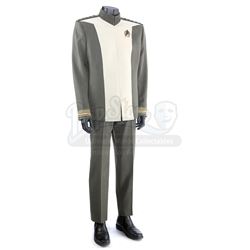 Admiral Marcus' dress uniform from Star Trek Into Darkness. Marcus wore his dress uniform in the conference room when Starfleet headquarters was attacked. The costume consists of a jacket (approximate size 42), pants (approximate size 33) with suspenders, and a pair of boots (marked U.S. size 10M).The olive green and khaki jacket is made of wool twill, has a high ribbed collar, epaulets on each shoulder, four gold bands on the wrists and a goldtone Starfleet pin on the left breast. The olive green pants are also made of wool twill and include a pair of black elastic suspenders. Also included is a pair of black leather ankle boots with rubber soles. The costume features hand-written wardrobe labels with the jacket and pants marked as "Marcus". Also included are wardrobe tags included with hand-written notes about the costume. Estimate: $3000 - 5000*Estimated sale price; sold without reserve.