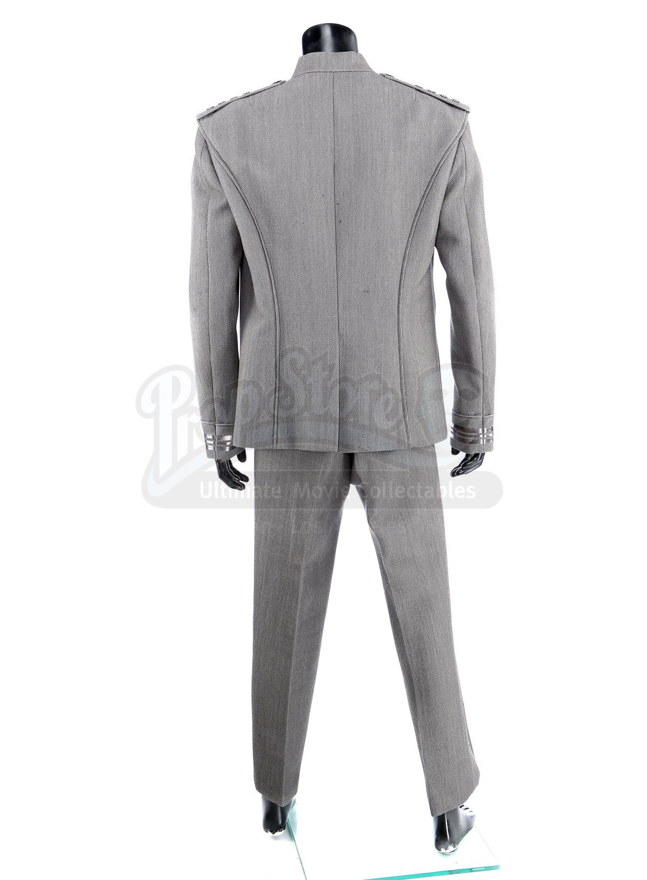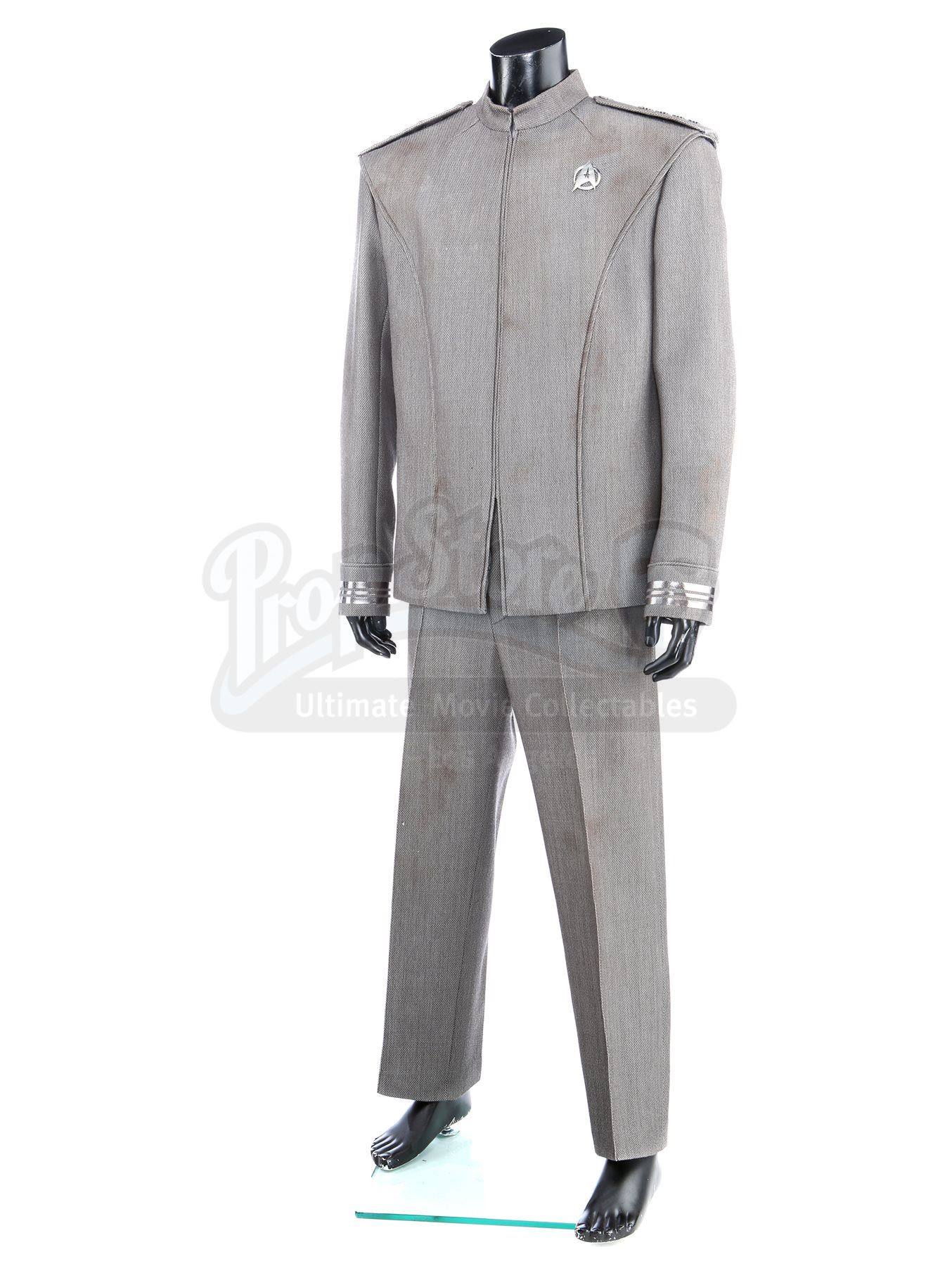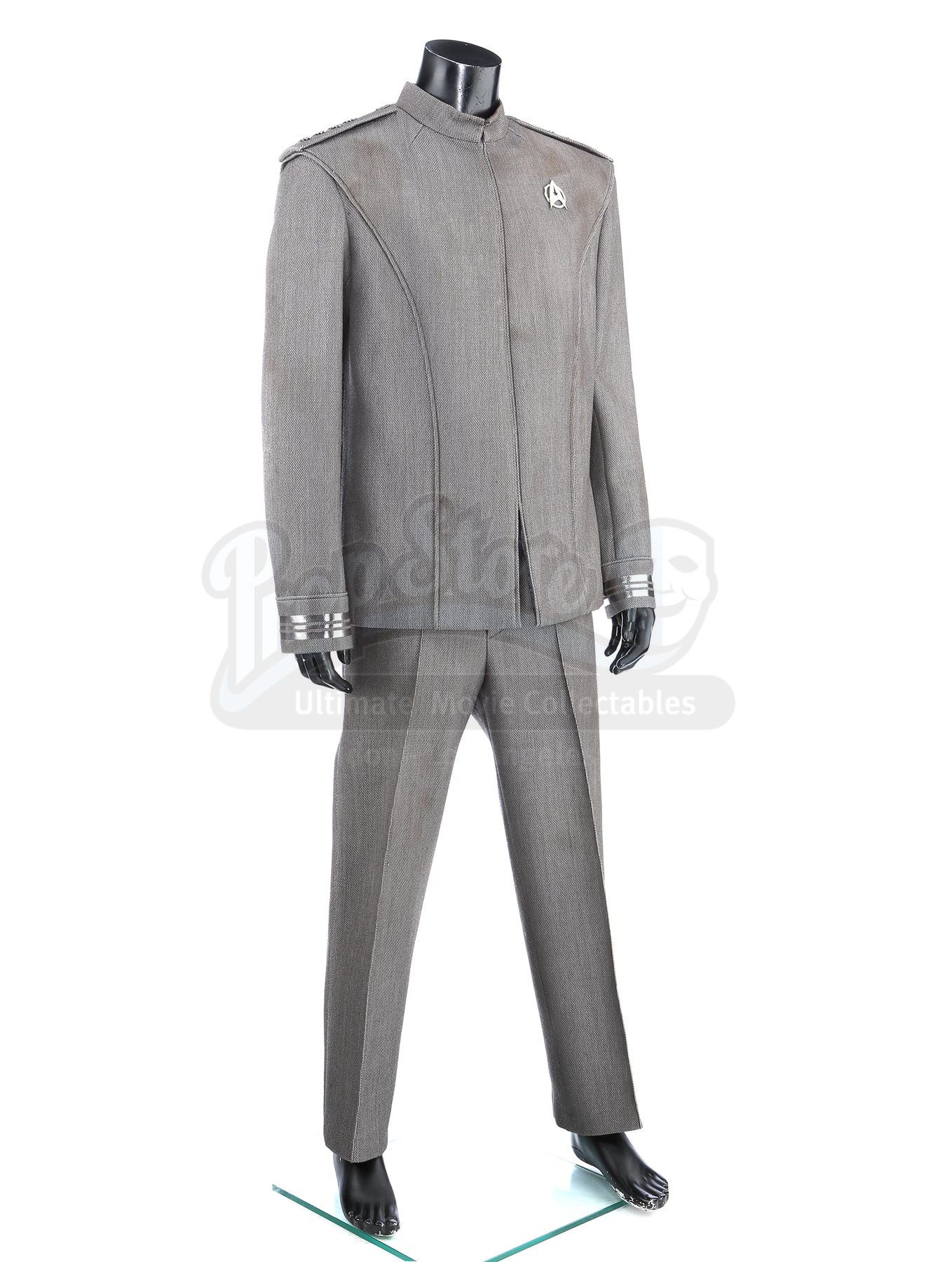 Captain Abbot's distressed Starfleet dress uniform and a Vulcan women's Starfleet dress uniform from Star Trek Into Darkness. Starfleet command officers wore their dress uniforms in the conference room when Starfleet headquarters was attacked. The lot consists of a jacket (approximate size 44), pants (approximate size 36), a Vulcan women's jacket (approximate size extra small), skirt (approximate size extra small), and a pair of boots (marked U.S. size 7.5).The grey jacket and pants are made of bird's eye-patterned linen, with the jacket featuring epaulets on each shoulder and a Starfleet command pin on the left breast. The jacket also includes three silver bands on the wrists. The Vulcan women's jacket and skirt are also made of bird's eye-patterned linen. The jacket features epaulets on each shoulder and a Starfleet command pin on the left breast. The jacket also includes two silver bands on the wrists. Also included is a pair of black leather boots with rubber soles.The lot includes hand-written wardrobe labels in Abbot's jacket and pants marked "Abbot", and a hand-written wardrobe label in the Vulcan women's skirt marked "Abbot's Vulcan". Also included are wardrobe tags with hand-written notes about the lot.Estimate: $2500 - 3500*Estimated sale price; sold without reserve.