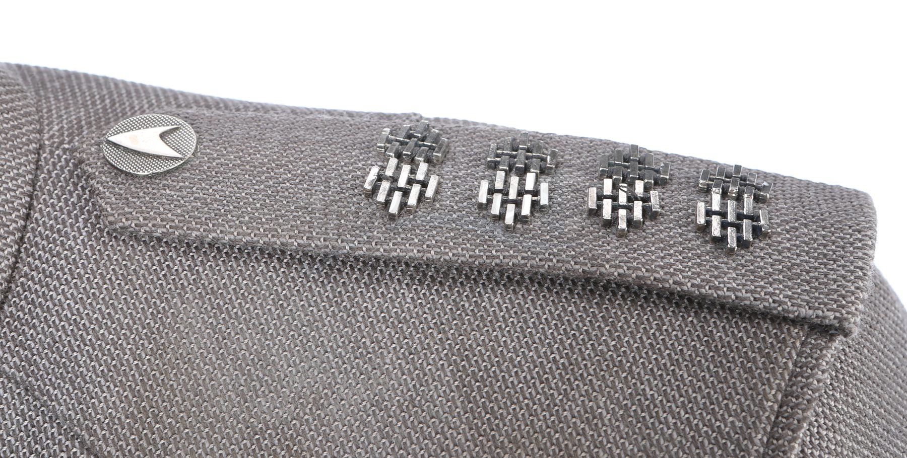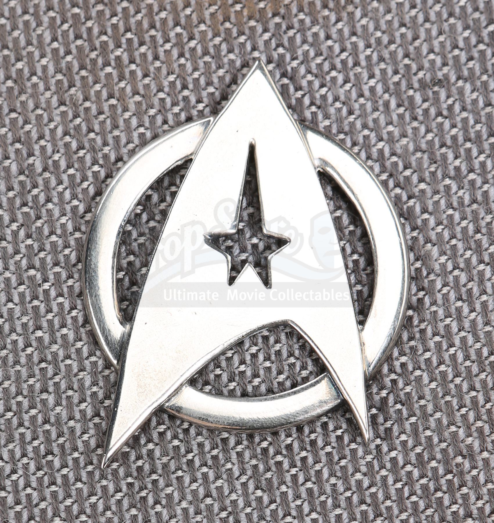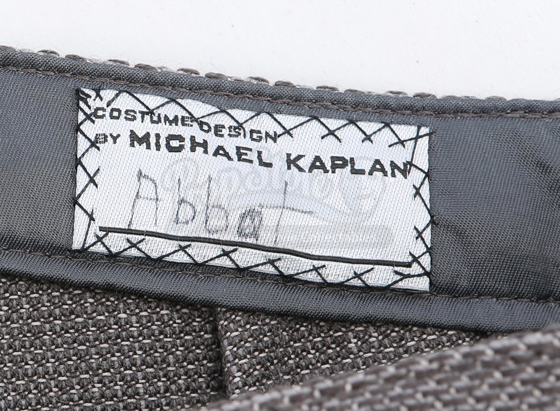 Captain Abbot's distressed Starfleet dress uniform and a Vulcan women's Starfleet dress uniform from Star Trek Into Darkness. Starfleet command officers wore their dress uniforms in the conference room when Starfleet headquarters was attacked. The lot consists of a jacket (approximate size 44), pants (approximate size 36), a Vulcan women's jacket (approximate size extra small), skirt (approximate size extra small), and a pair of boots (marked U.S. size 7.5).The grey jacket and pants are made of bird's eye-patterned linen, with the jacket featuring epaulets on each shoulder and a Starfleet command pin on the left breast. The jacket also includes three silver bands on the wrists. The Vulcan women's jacket and skirt are also made of bird's eye-patterned linen. The jacket features epaulets on each shoulder and a Starfleet command pin on the left breast. The jacket also includes two silver bands on the wrists. Also included is a pair of black leather boots with rubber soles.The lot includes hand-written wardrobe labels in Abbot's jacket and pants marked "Abbot", and a hand-written wardrobe label in the Vulcan women's skirt marked "Abbot's Vulcan". Also included are wardrobe tags with hand-written notes about the lot.Estimate: $2500 - 3500*Estimated sale price; sold without reserve.