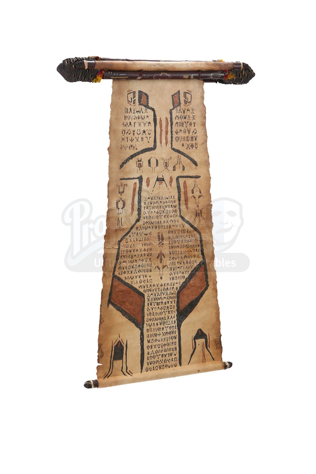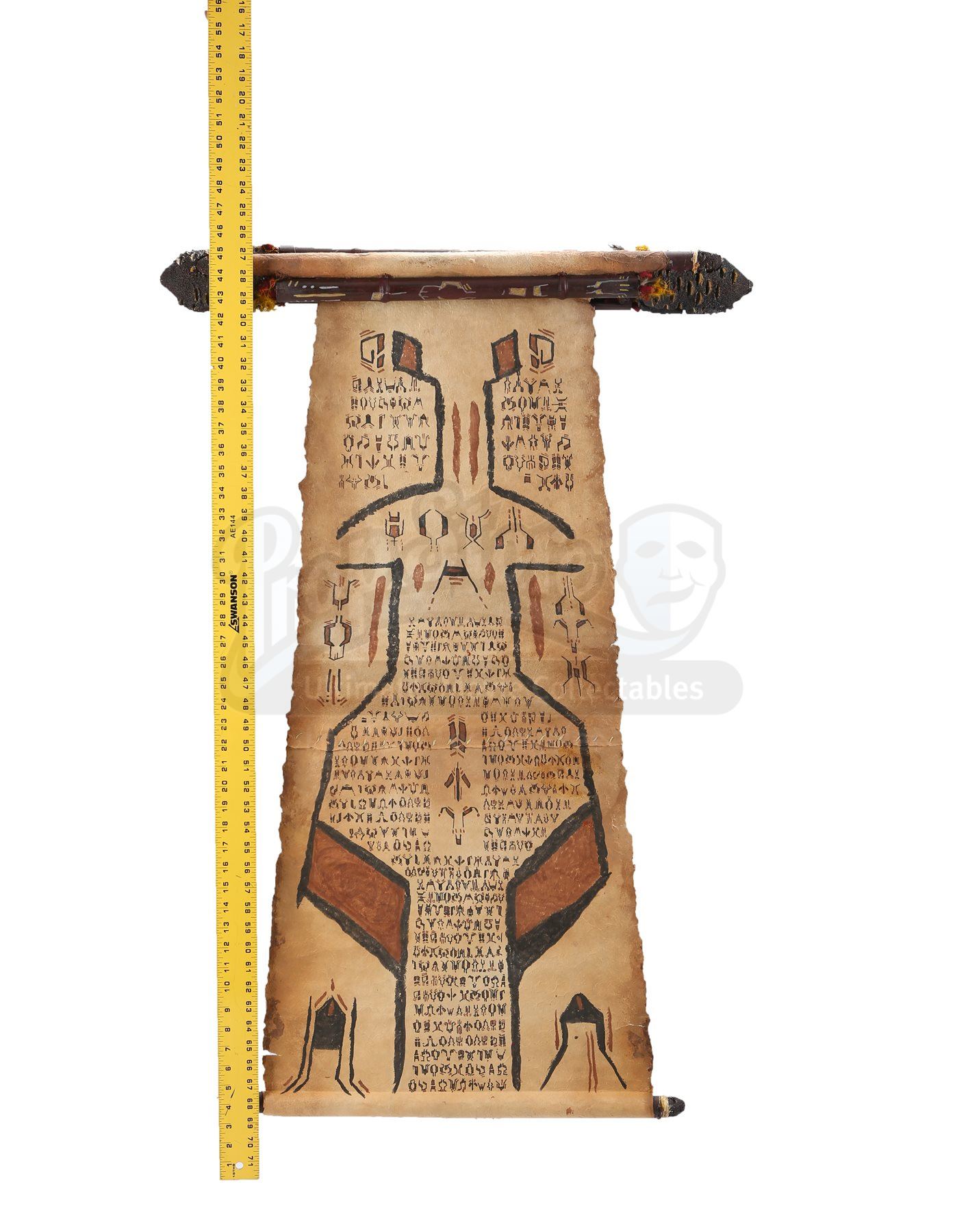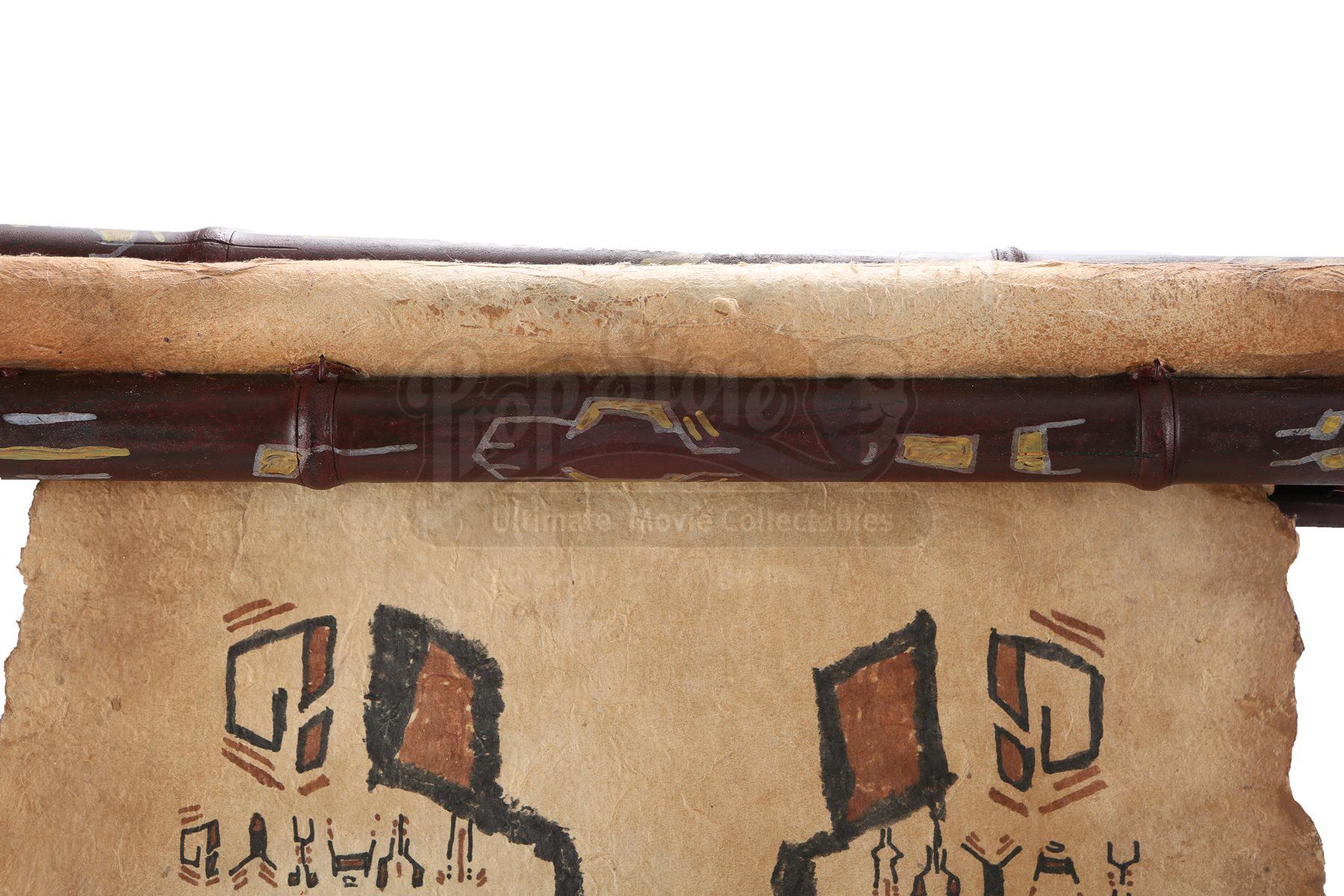 The scroll is made of resin and fashioned to resemble wood construction, while the rolled paper inside is heavy parchment paper. The resin casing includes rough rocks and feathering around the perimeter. When unrolled, the scroll displays hand-painted alien characters and symbols in black and brown paint. Dimensions: 29" x 3 ¼" x 4 ½" (74 cm x 8 cm x 11 cm)