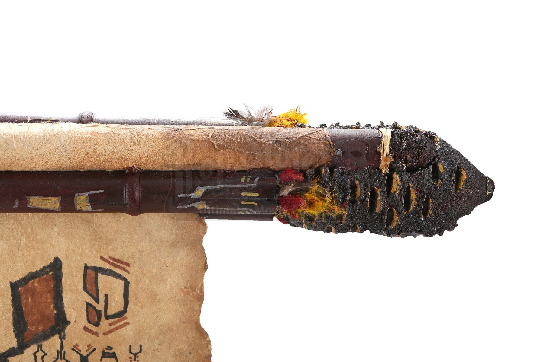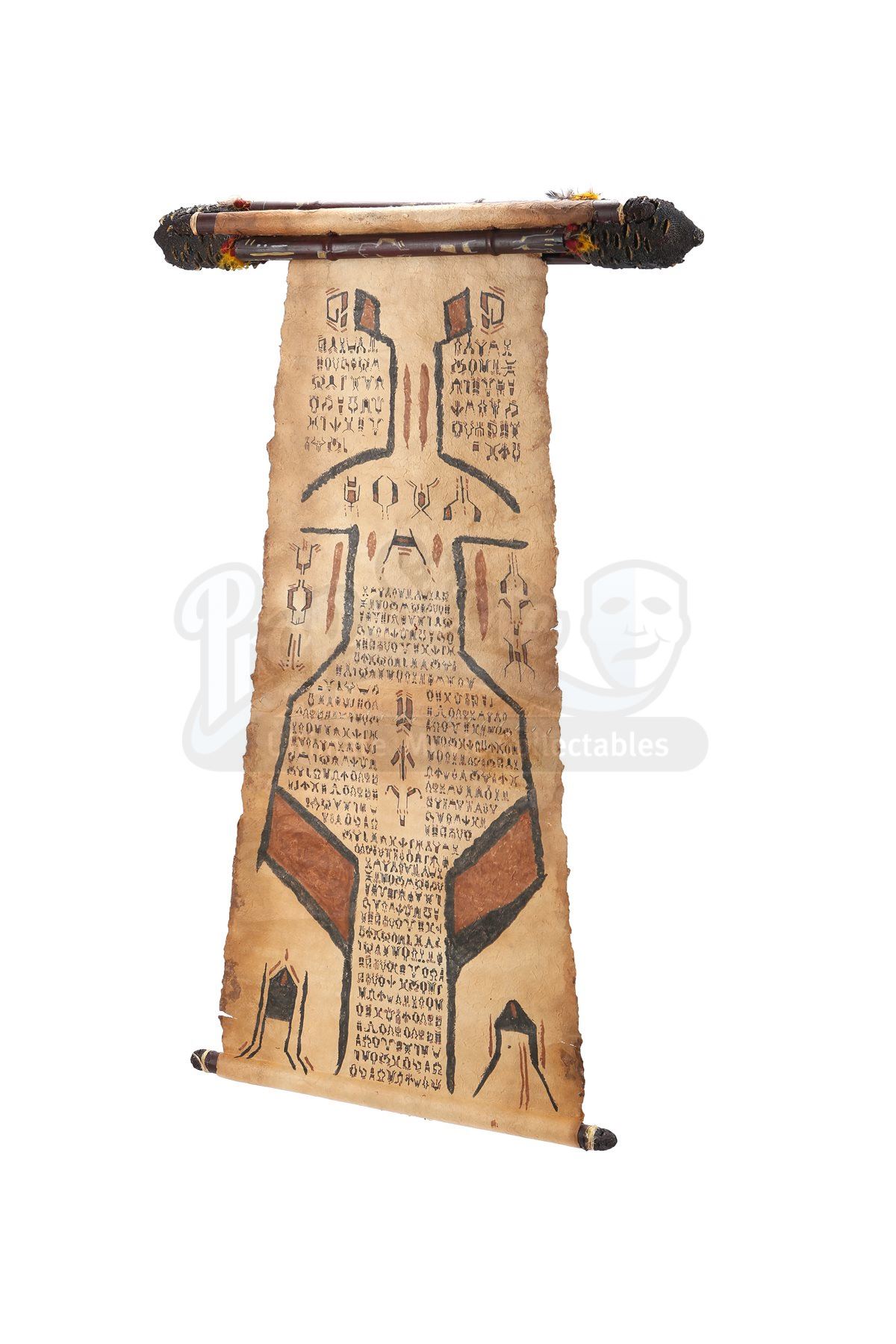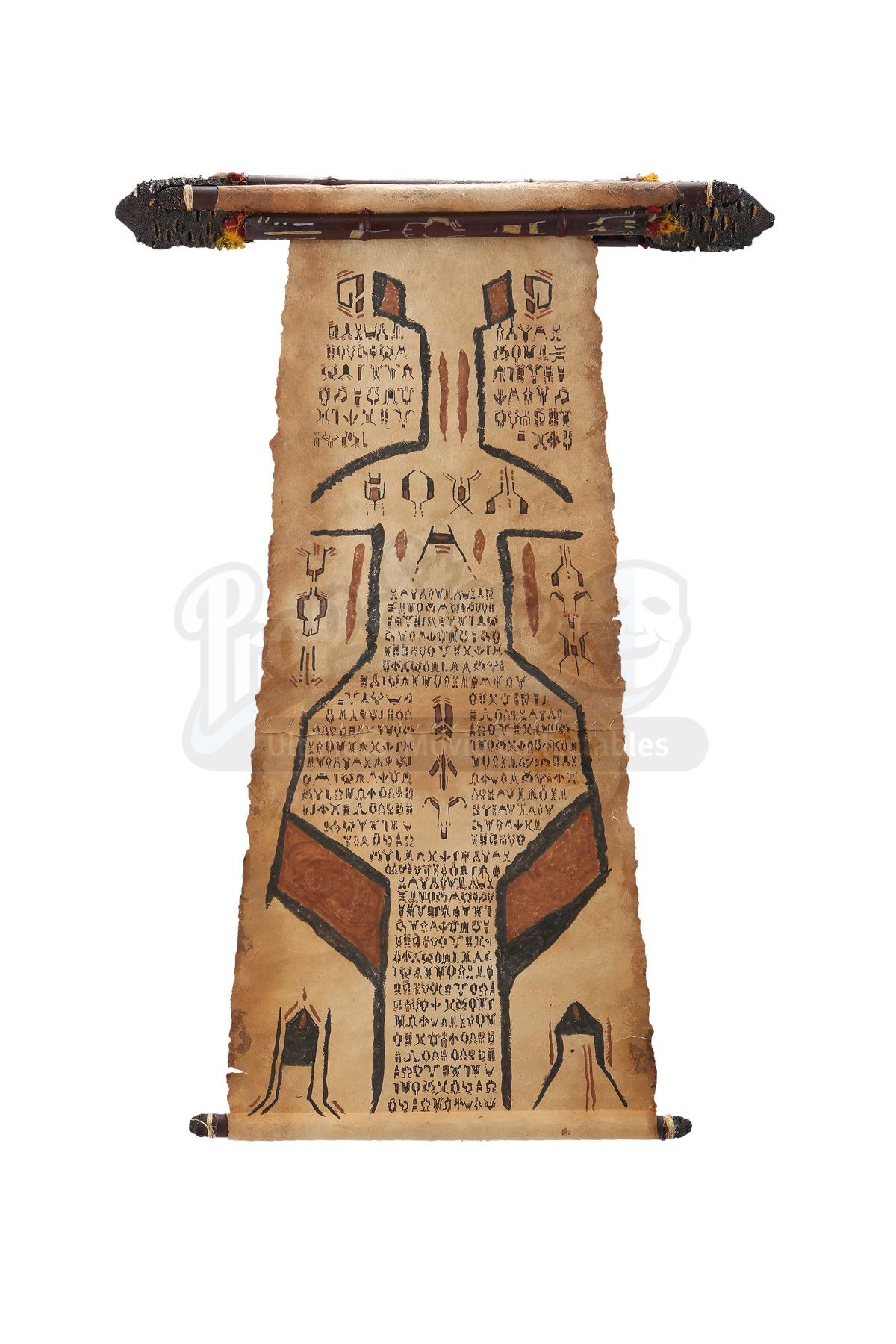 The scroll is made of resin and fashioned to resemble wood construction, while the rolled paper inside is heavy parchment paper. The resin casing includes rough rocks and feathering around the perimeter. When unrolled, the scroll displays hand-painted alien characters and symbols in black and brown paint. Dimensions: 29" x 3 ¼" x 4 ½" (74 cm x 8 cm x 11 cm)