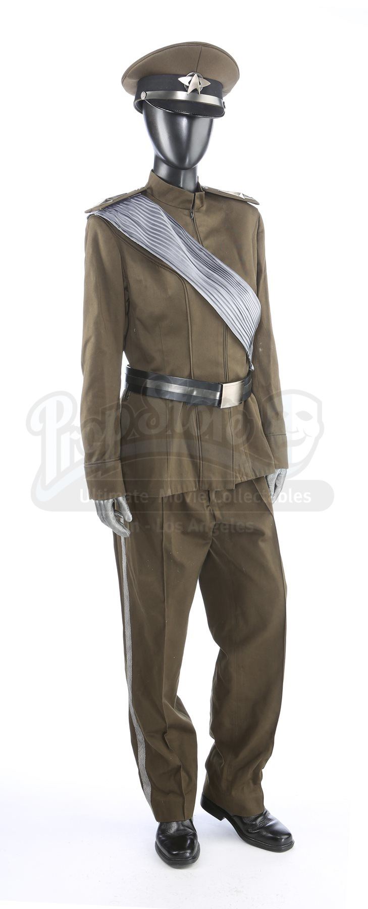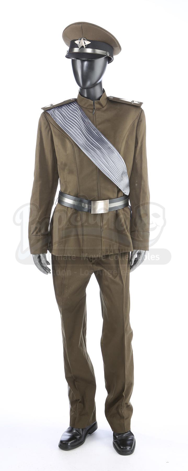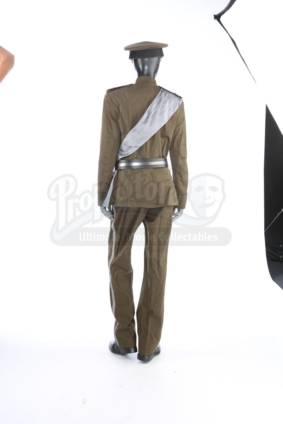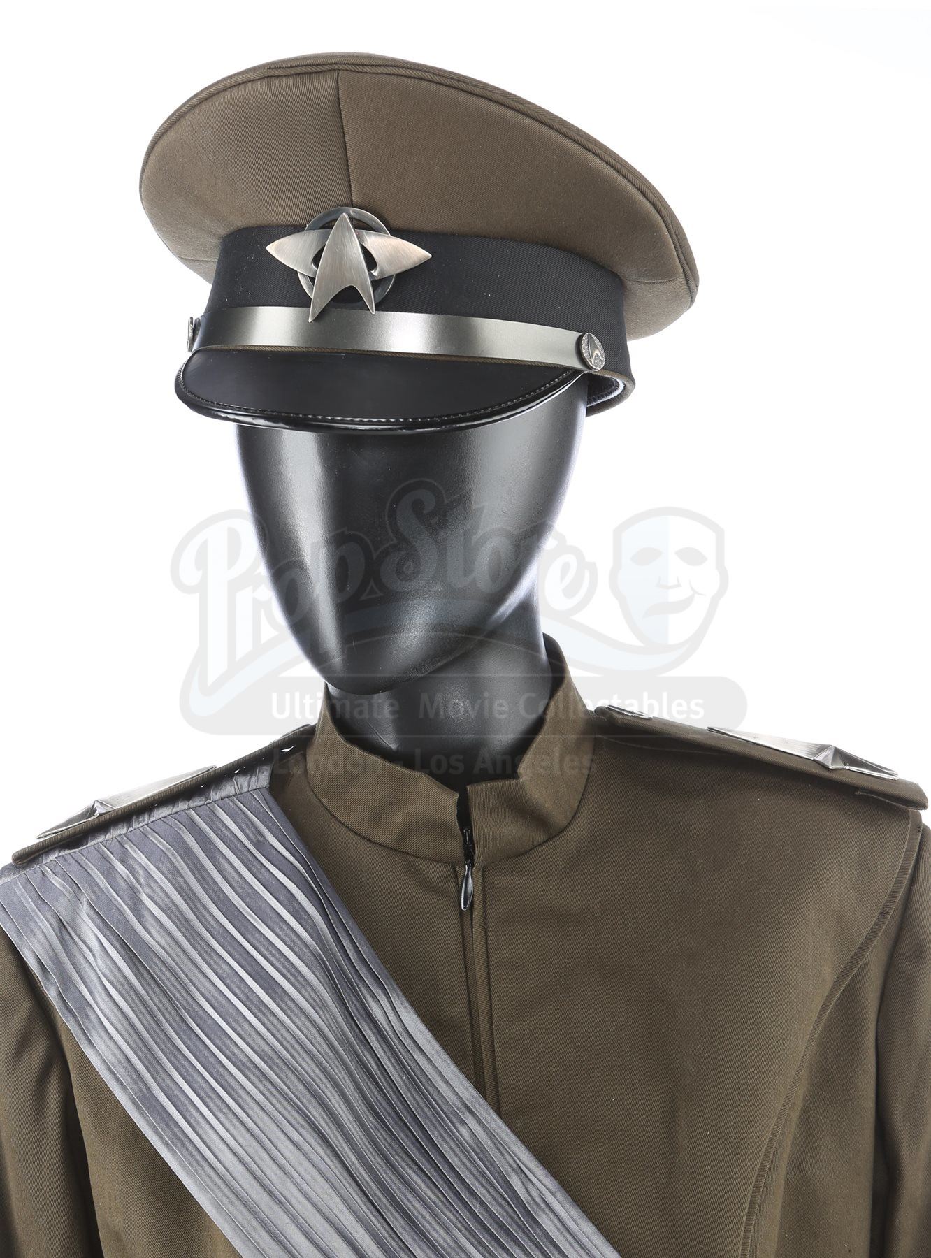A ceremonial guard uniform from Star Trek Into Darkness. Starfleet guardsmen wore their uniforms during the memorial ceremony at Starfleet headquarters. The costume includes a jacket (approximate size 36), pants (approximate size 32), a sash, leather gloves, a belt, a cap, and a pair of boots (marked U.S. size 7M). The olive green jacket and pants are made of wool twill, with the pants featuring a grey braid down each leg and grey elastic suspenders. Also included are a silver grey satin pleated sash and a pair of silver grey leather gloves. The black leather belt has a grey stripe and metal buckle. The peaked-style cap is also made of olive green wool twill and features metal Starfleet pins attached to the front. Also included is a pair of black leather boots with rubber soles. The costume features hand-written wardrobe labels in the jacket, pants, sash, belt and cap marked with the actor's name. Also included are wardrobe tags with hand-written notes about the costume. The lot shows minor wear due to production use, with the shoulder epaulets no longer attached to the jacket.Estimate: $600 - 800*Estimated sale price; sold without reserve.