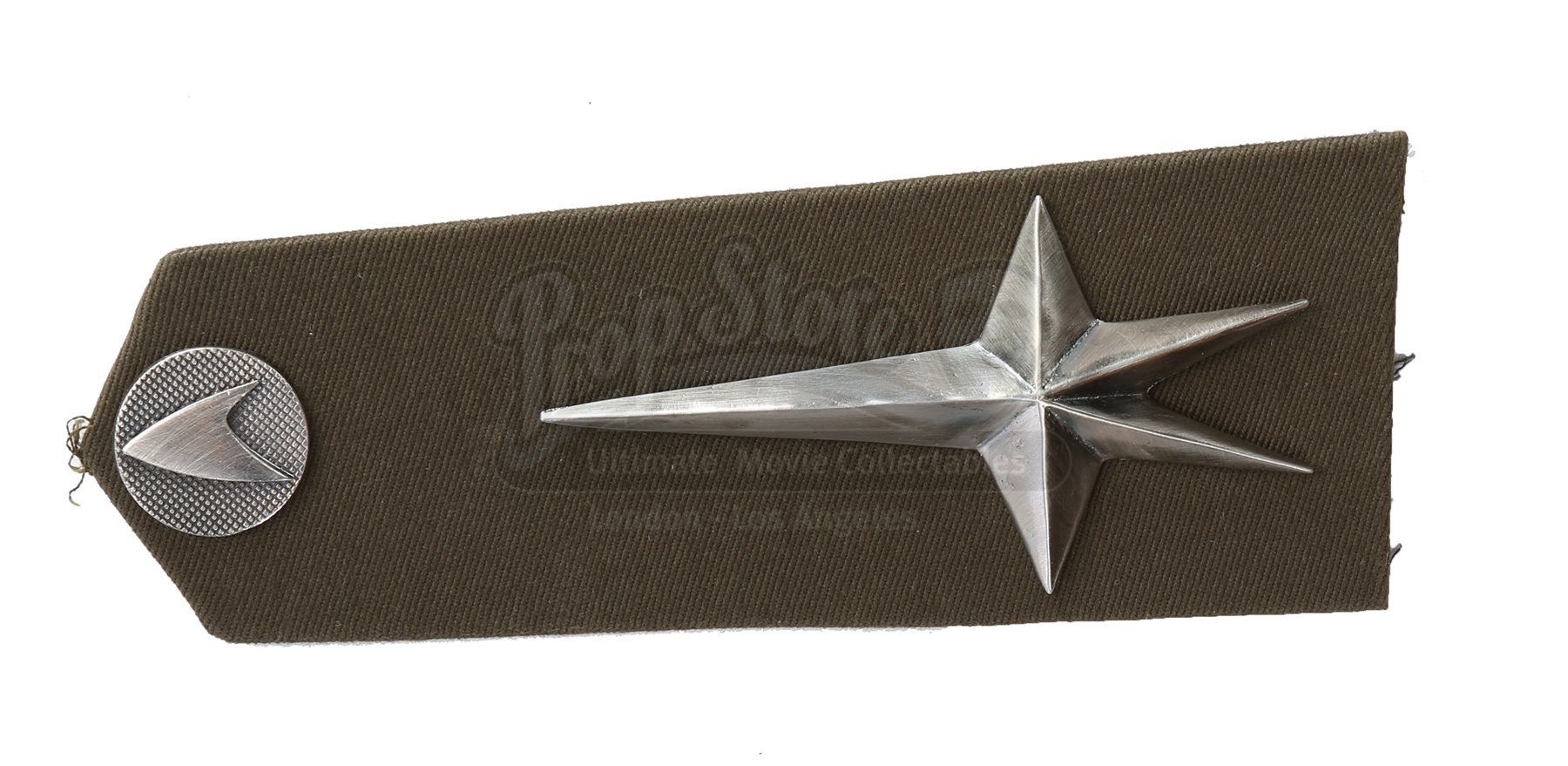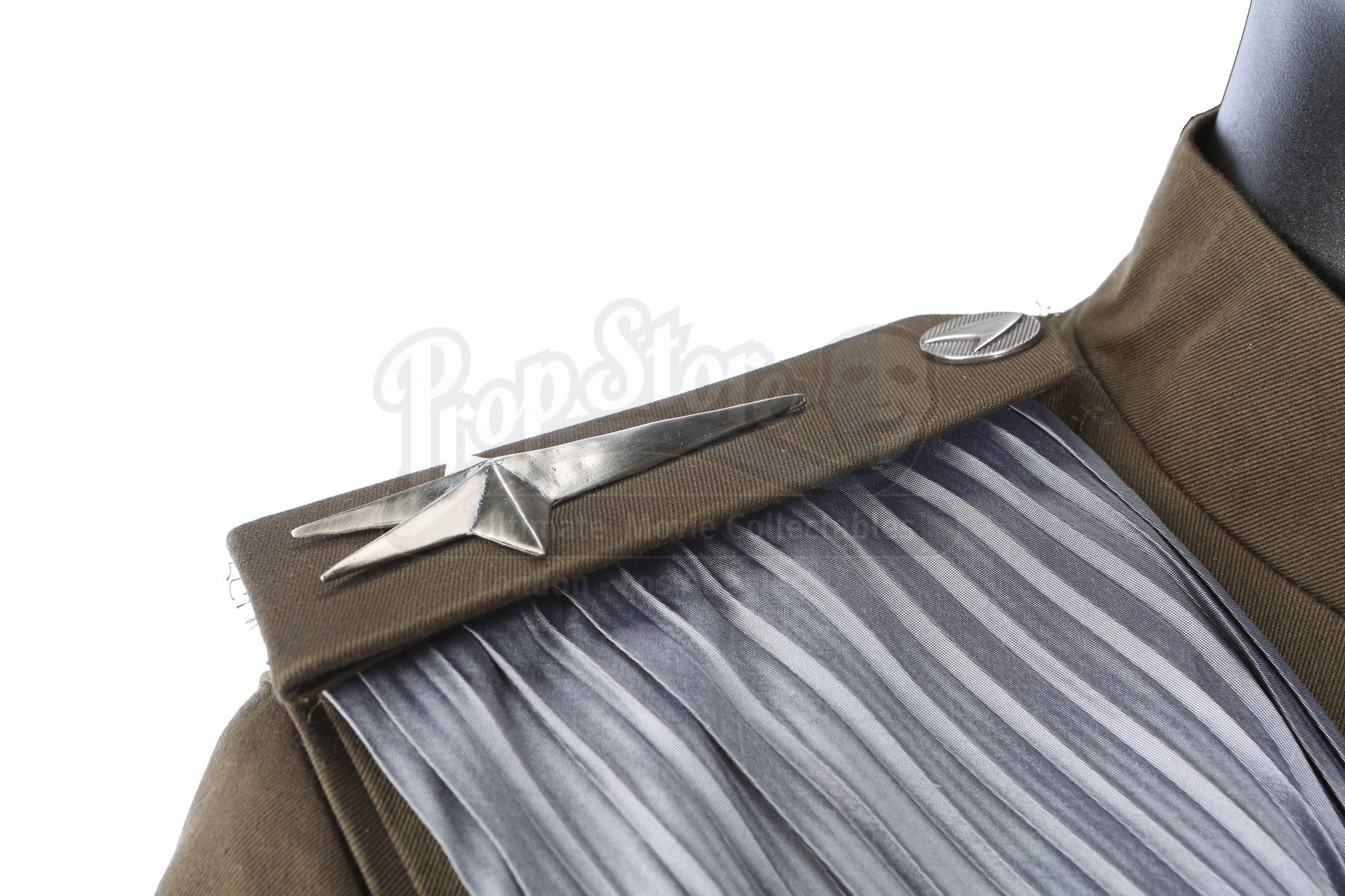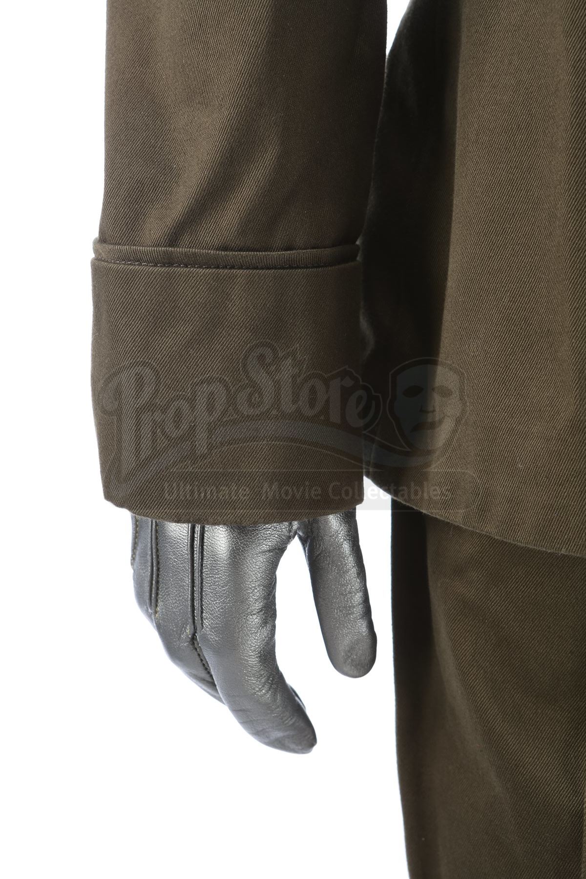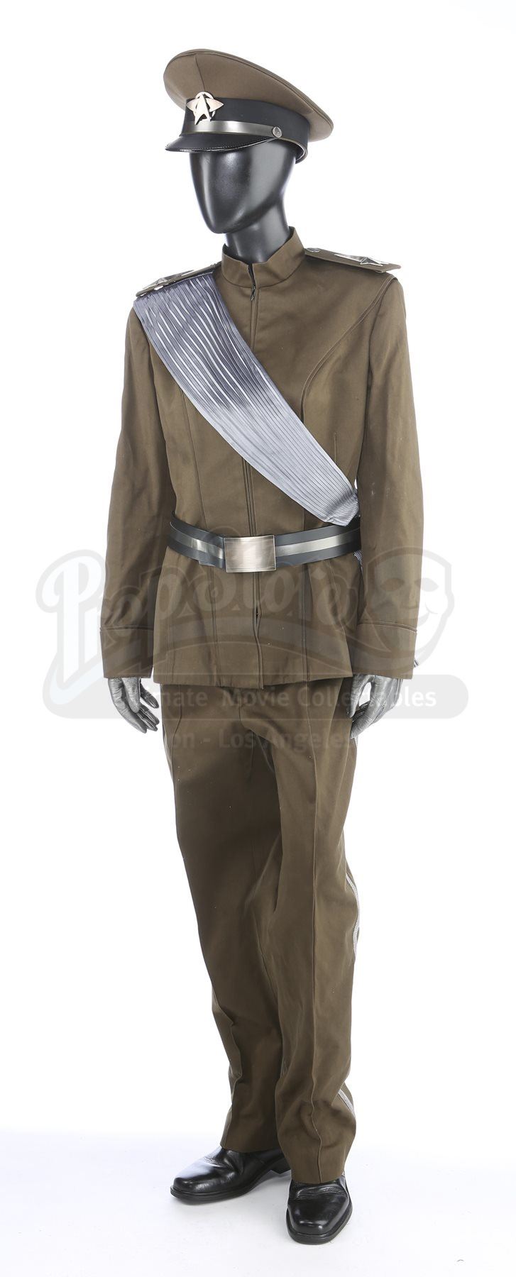A ceremonial guard uniform from Star Trek Into Darkness. Starfleet guardsmen wore their uniforms during the memorial ceremony at Starfleet headquarters. The costume includes a jacket (approximate size 36), pants (approximate size 32), a sash, leather gloves, a belt, a cap, and a pair of boots (marked U.S. size 7M). The olive green jacket and pants are made of wool twill, with the pants featuring a grey braid down each leg and grey elastic suspenders. Also included are a silver grey satin pleated sash and a pair of silver grey leather gloves. The black leather belt has a grey stripe and metal buckle. The peaked-style cap is also made of olive green wool twill and features metal Starfleet pins attached to the front. Also included is a pair of black leather boots with rubber soles. The costume features hand-written wardrobe labels in the jacket, pants, sash, belt and cap marked with the actor's name. Also included are wardrobe tags with hand-written notes about the costume. The lot shows minor wear due to production use, with the shoulder epaulets no longer attached to the jacket.Estimate: $600 - 800*Estimated sale price; sold without reserve.