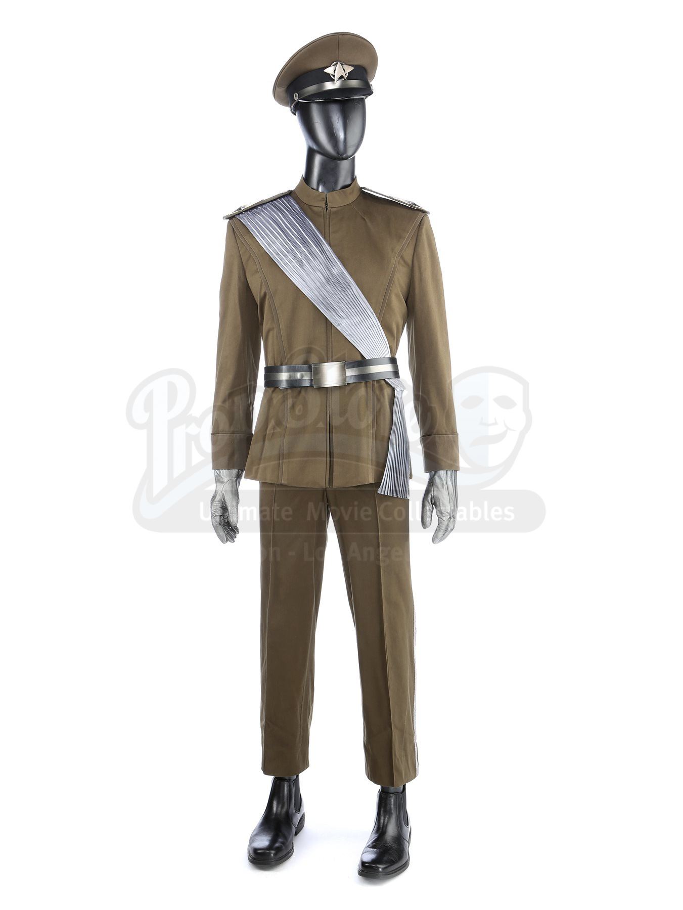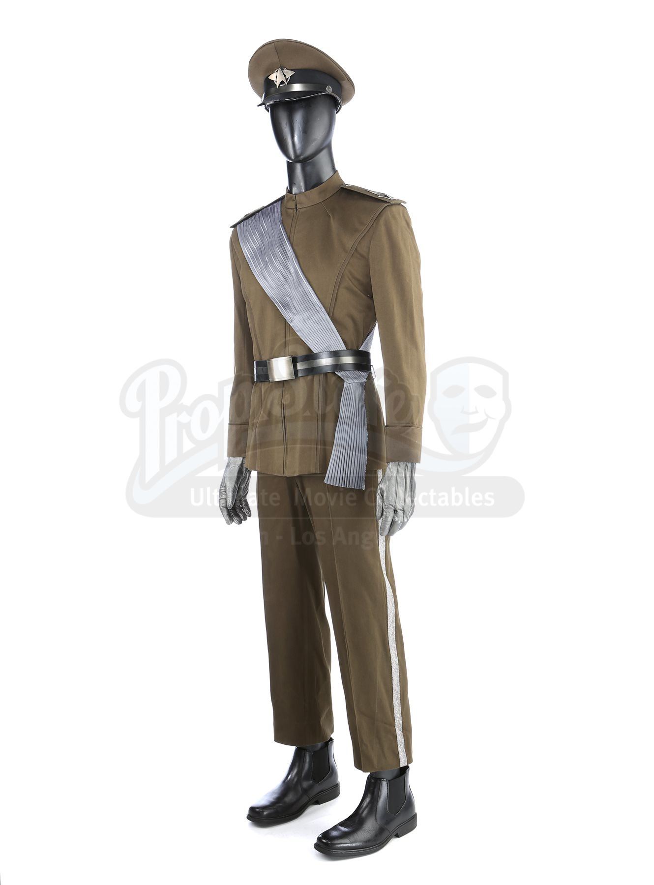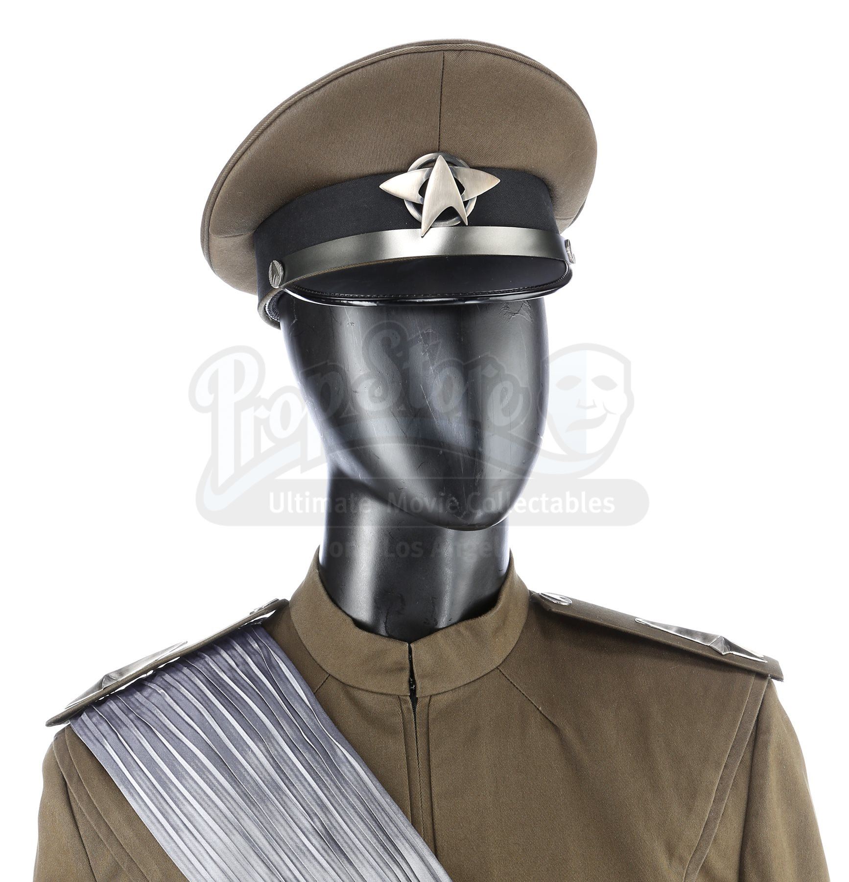 A ceremonial guard uniform from Star Trek Into Darkness. Starfleet guardsmen wore their uniforms during the memorial ceremony at Starfleet headquarters. The costume includes a jacket (marked size 42), pants (marked size 34), suspenders, a sash, leather gloves, a belt, a cap (medium), and a pair of boots (marked U.S. size 12M). The olive green jacket and pants are made of wool twill, with the pants featuring a grey braid down each leg and grey elastic suspenders. Also included are a silver grey satin pleated sash and a pair of silver grey leather gloves. The black leather belt has a grey stripe and metal buckle. The peaked-style cap is also made of olive green wool twill and features metal Starfleet pins attached to the front. Also included is pair of black leather boots with rubber soles.The costume features hand-written wardrobe labels in the jacket, pants, sash, belt and cap marked with the actor's name. Also included are wardrobe tags with hand-written notes about the costume. The lot shows minor wear due to production use, with the shoulder epaulets no longer attached to the jacket.Estimate: $600 - 800*Estimated sale price; sold without reserve.