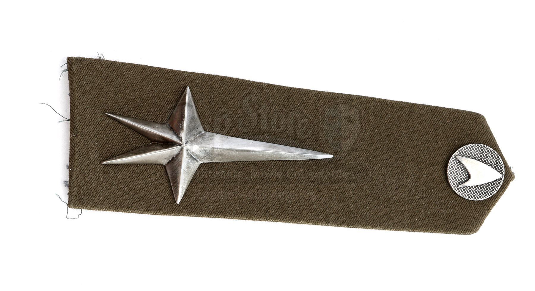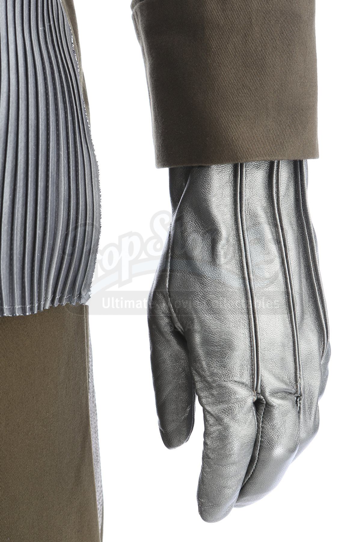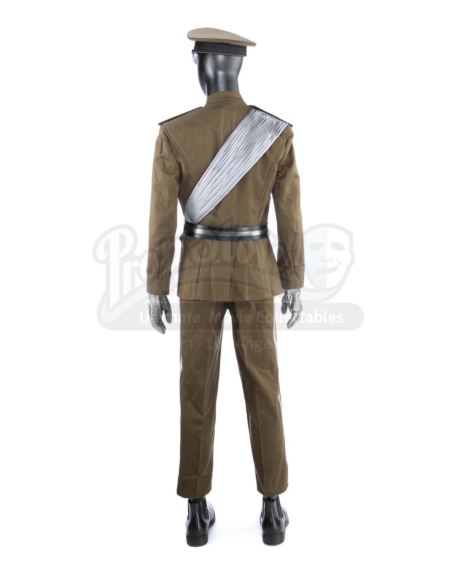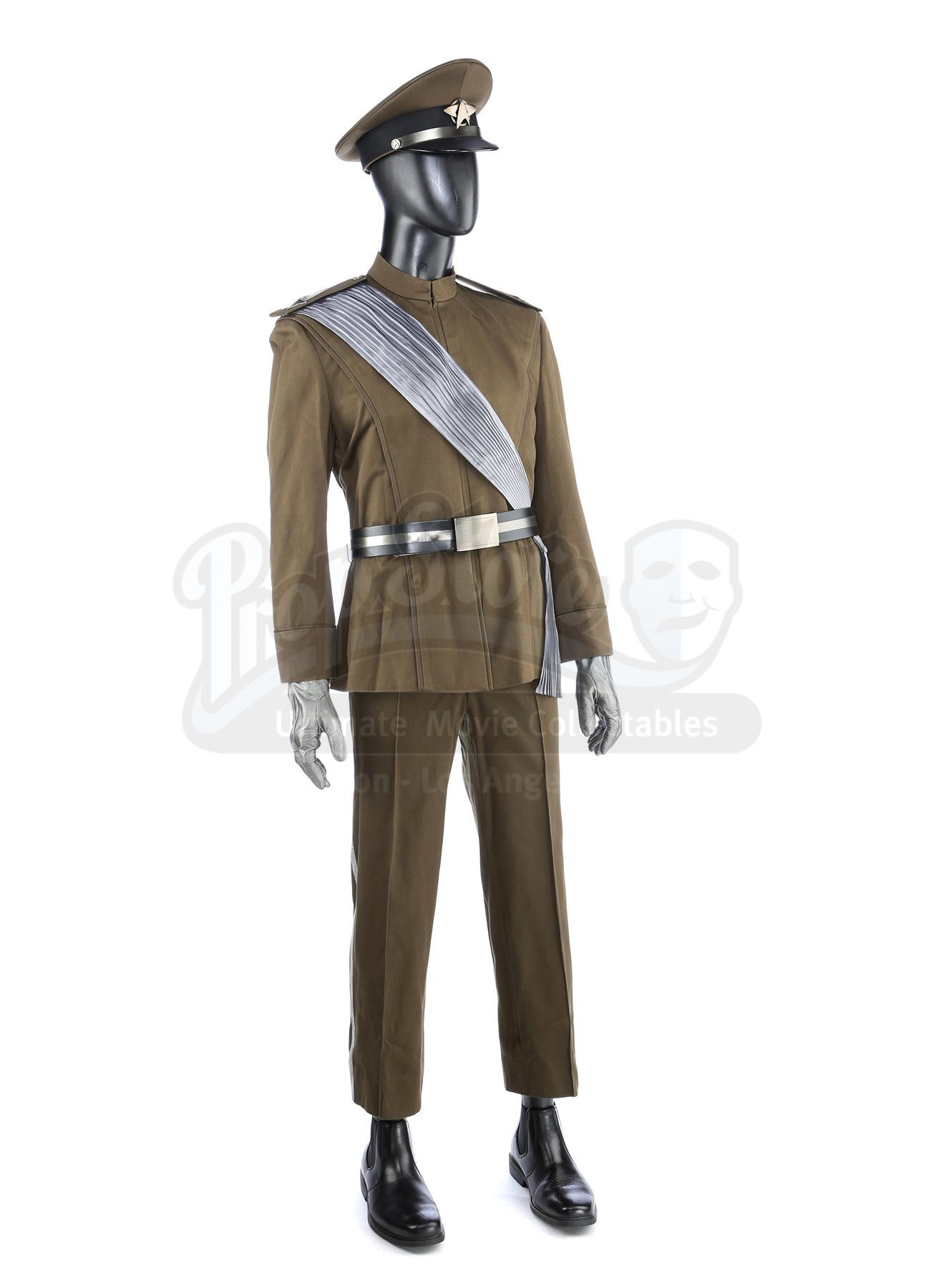 A ceremonial guard uniform from Star Trek Into Darkness. Starfleet guardsmen wore their uniforms during the memorial ceremony at Starfleet headquarters. The costume includes a jacket (marked size 42), pants (marked size 34), suspenders, a sash, leather gloves, a belt, a cap (medium), and a pair of boots (marked U.S. size 12M). The olive green jacket and pants are made of wool twill, with the pants featuring a grey braid down each leg and grey elastic suspenders. Also included are a silver grey satin pleated sash and a pair of silver grey leather gloves. The black leather belt has a grey stripe and metal buckle. The peaked-style cap is also made of olive green wool twill and features metal Starfleet pins attached to the front. Also included is pair of black leather boots with rubber soles.The costume features hand-written wardrobe labels in the jacket, pants, sash, belt and cap marked with the actor's name. Also included are wardrobe tags with hand-written notes about the costume. The lot shows minor wear due to production use, with the shoulder epaulets no longer attached to the jacket.Estimate: $600 - 800*Estimated sale price; sold without reserve.