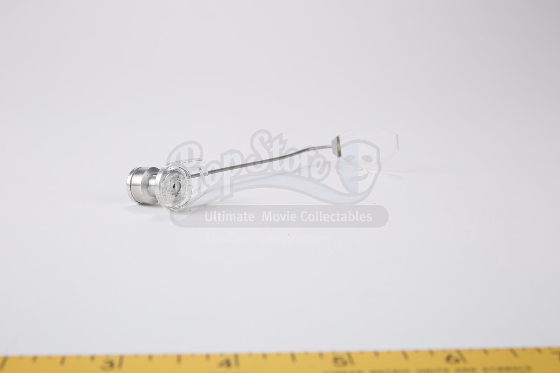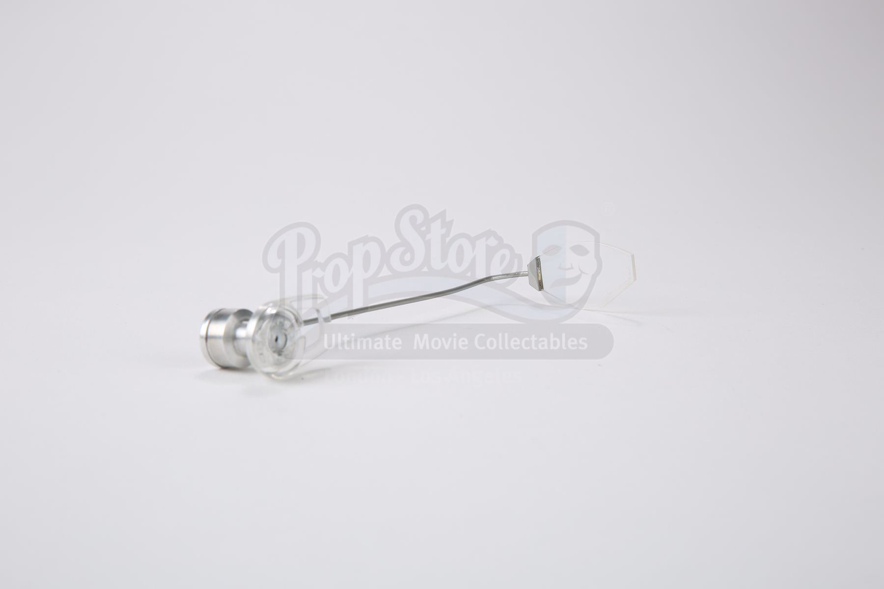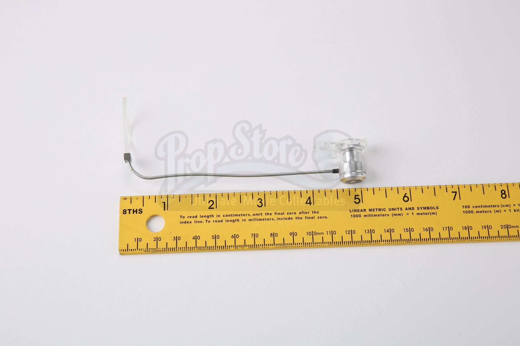 The device consists of a clear acrylic eyepiece that is attached to a flexible metal wire, with a clear urethane earpiece at the opposite end. The earpiece features the Starfleet insignia on its casing. Dimensions: 5 ½" x ¾" x 1 ½" (14 cm x 2 cm x 4 cm)