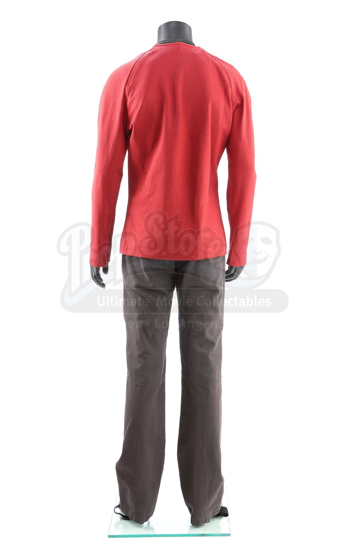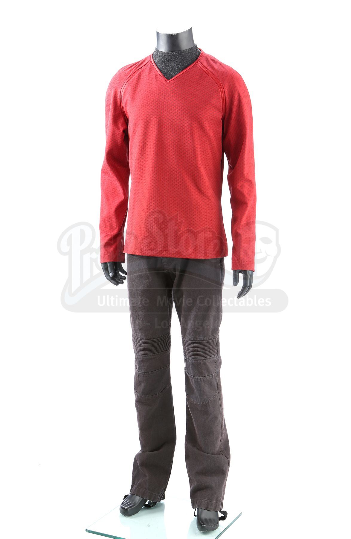 A Grasia alien's Enterprise operations uniform from Star Trek Into Darkness. Enterprise staff in the operations division wore their uniforms while aboard the Enterprise throughout the first two films. The costume includes a tunic (marked size 38), semi-mock turtleneck undershirt (medium), pants (marked size 32), and a pair of boots (marked U.S. size 7.5). Made specifically for the sequel, the red tunic is made of Spandex and features a printed optical repeat Starfleet insignia pattern. The long-sleeved shirt has piping around the collar and has hidden zippers at both shoulders. The undershirt consists of a grey polyester collar that is stitched to the top of a modified Spandex sport shirt. The grey twill pants were made for the first film and have ribbed fabric above the knees. Also included is a pair of black suede boots with rubber soles. The boots are the proper type for the costume; they were used in the production but not specifically by this character.Also included are wardrobe tags with hand-written notes about the costume.Estimate: $1000 - 1500*Estimated sale price; sold without reserve.