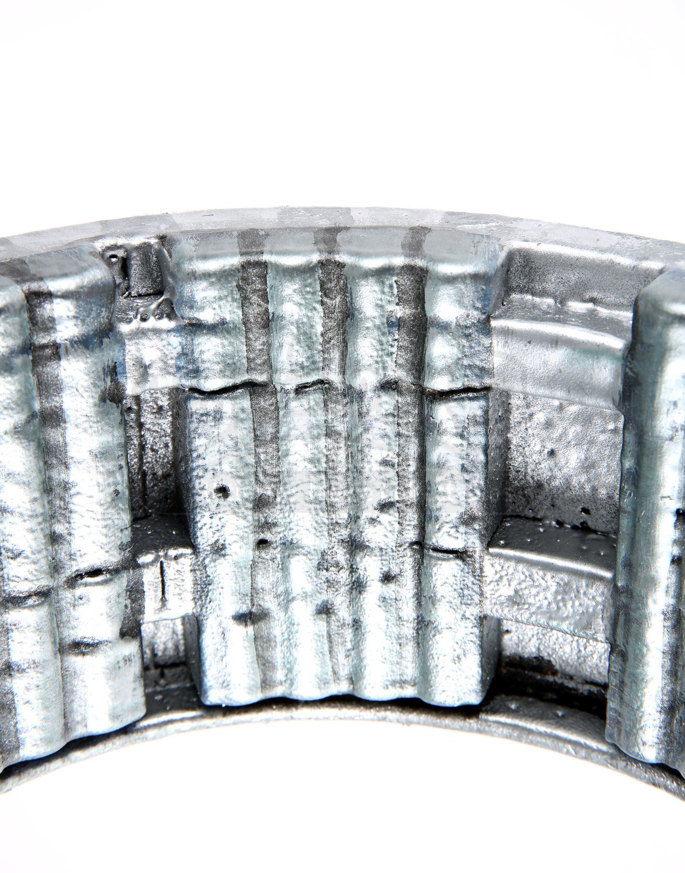 Made of rigid foam, the porthole is painted silver to appear metallic, with the interior ribbed and painted blue to resemble padding. Dimensions: 10 ¼" x 10 ¼" x 4" (26 cm x 26 cm x 10 cm)